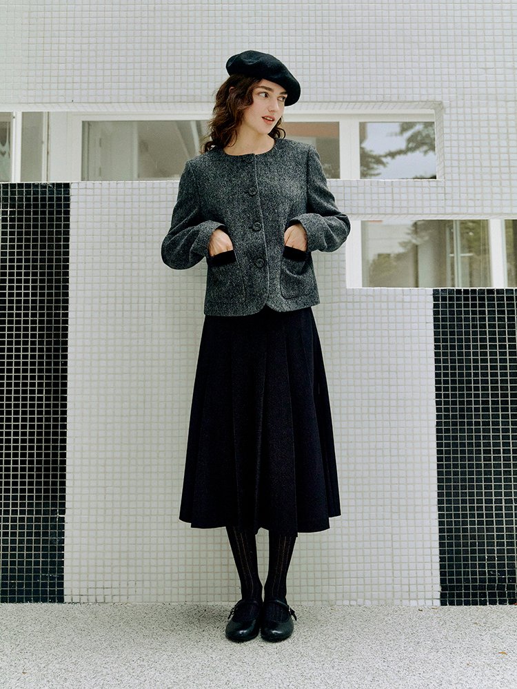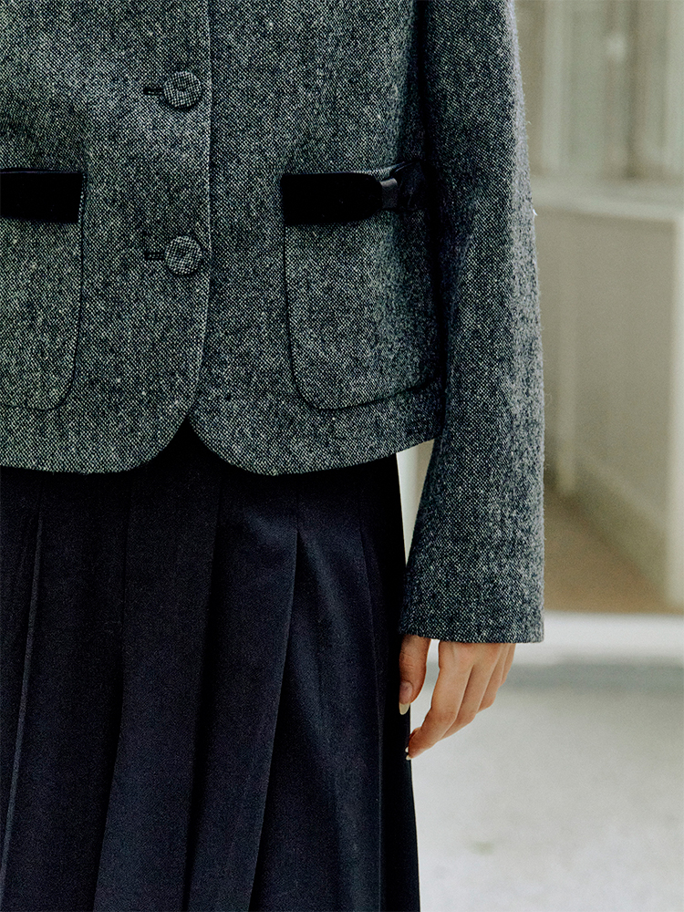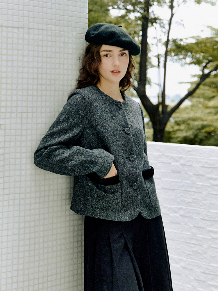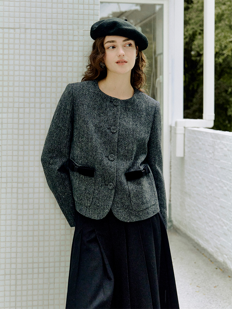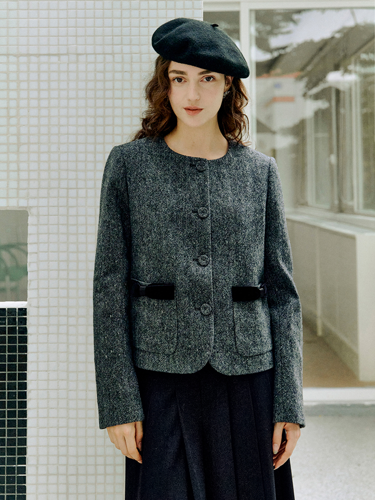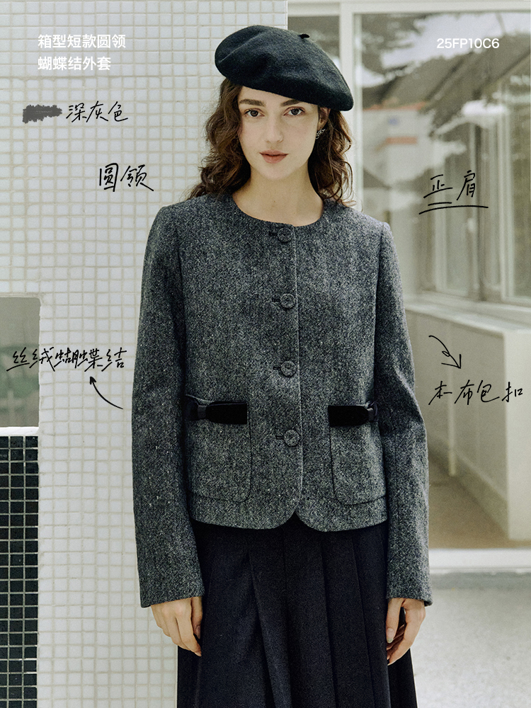ForPoem 现货 25/FW原创设计复古灰色质感箱型短款圆领显瘦蝴蝶结外套