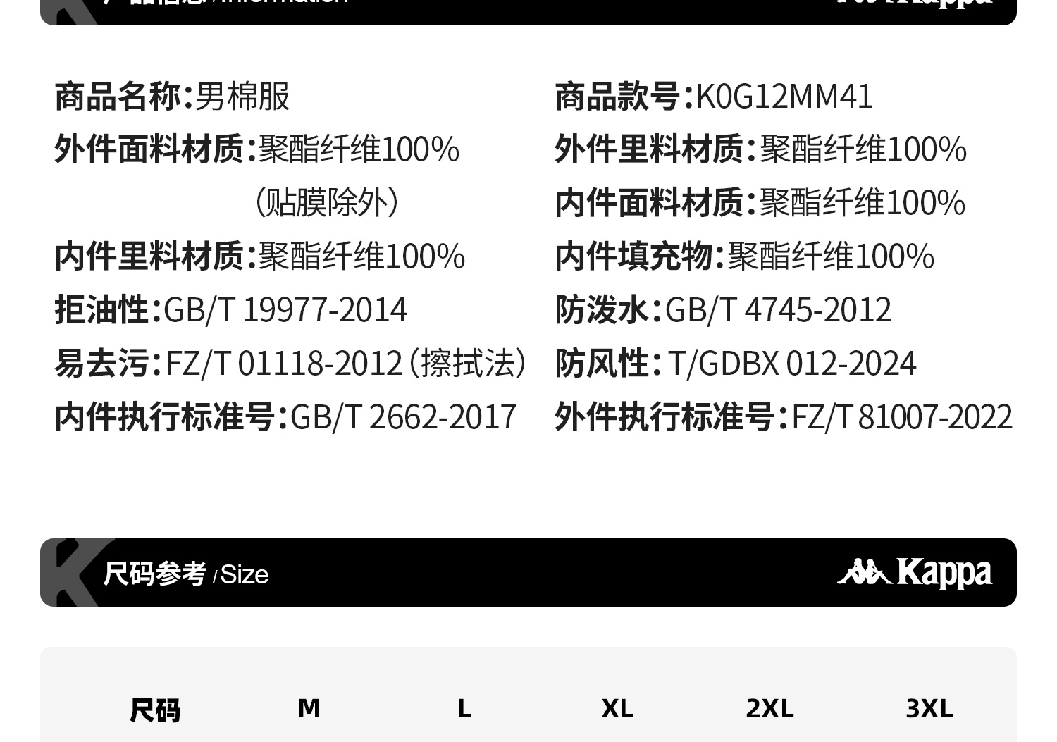 Kappa 男士连帽上衣2025新款户外运动风棉衣多四防外套K0G12MM41