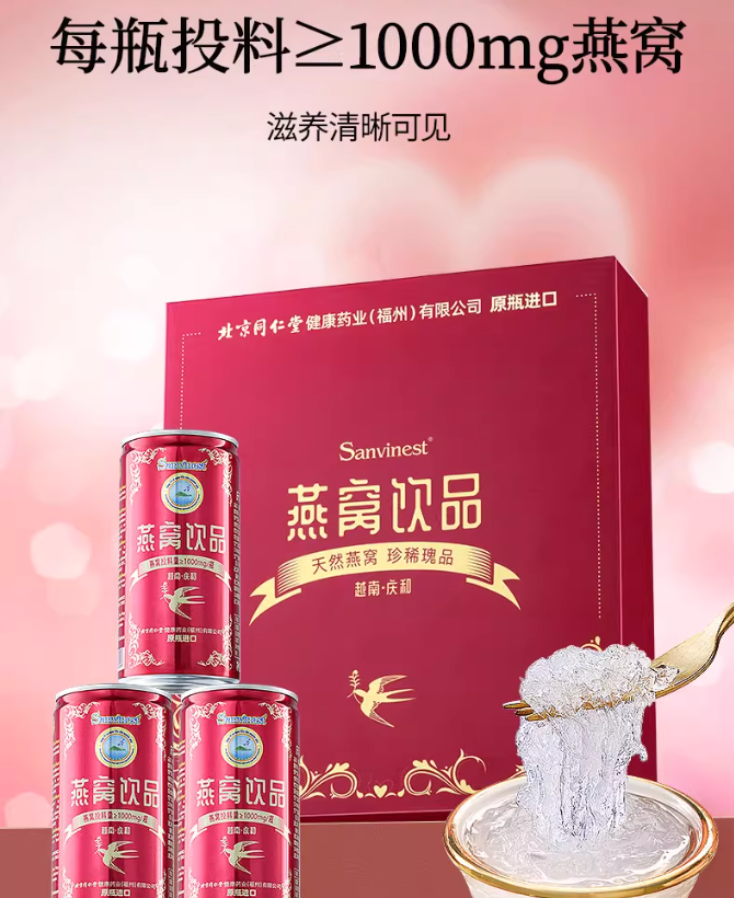 要知道,唾液酸(又称燕窝酸)可是燕窝的 “灵魂营养”,不仅能提高免疫力,还能让皮肤从内到外透亮发光~ 很多大牌护肤品都在添加唾液酸,而现在吃一口同仁堂燕窝就能补充,简直太划算了! 每瓶燕窝富含多种矿物质,像铁、锌这些微量元素,正是现代人饮食中容易缺乏的, 每天一瓶,相当于给身体做了一次全面 “充电”!