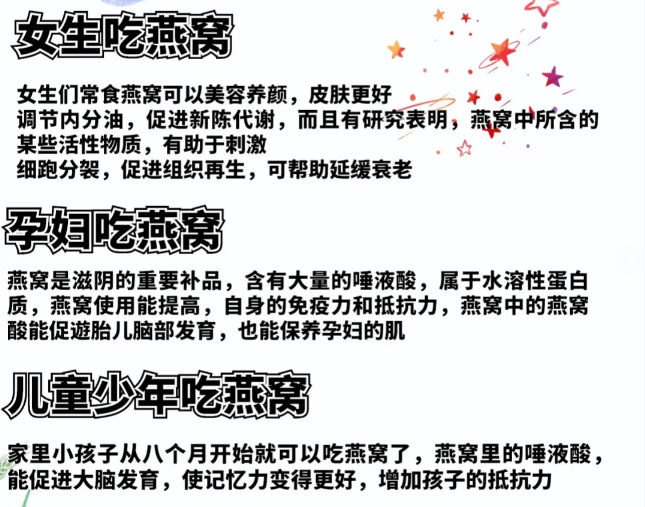 从年龄角度来说燕窝对大家都有好处 是适合男女老少饮用的保健餐生品!!! 🔺长期饮用能促进新陈代谢,养颜美容 🔺滋补养生,保持机体健康,调整体质 🔺调理润养五脏,滋阴养肺,调理脾胃虚弱 🔺改善咳嗽,气管炎等呼吸道慢性疾病 🔺补而不燥,特别适合女性 🔺可增强肌肤弹性和光泽,减少皱纹,延缓衰老