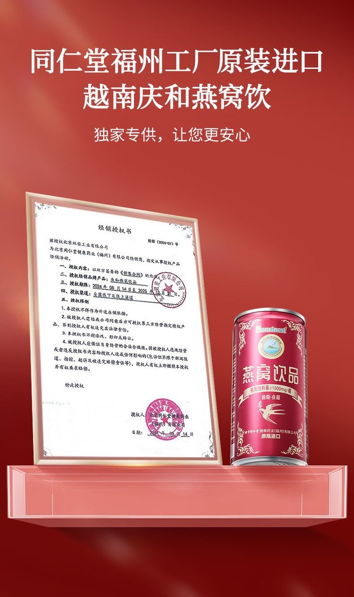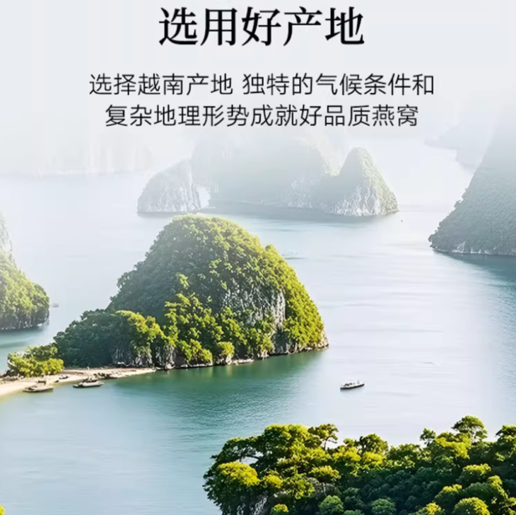 🔺来自燕窝优质产区越南庆和,产量稀缺只占全球燕窝 的2% 第一次知道同仁堂这款燕窝居然是来自越南庆和, 那里碧海蓝天、雨林环绕,是金丝燕栖息的天堂, 而且产量稀缺,只占全球燕窝的 2%! 庆和的气候、湿度特别适合金丝燕生长, 岩壁上的天然巢穴让燕窝吸收了更多矿物质, 同仁堂更是派专人驻扎当地, 从采摘、筛选到加工,每一个环节都严格把控,确保每一瓶燕窝都是精品。