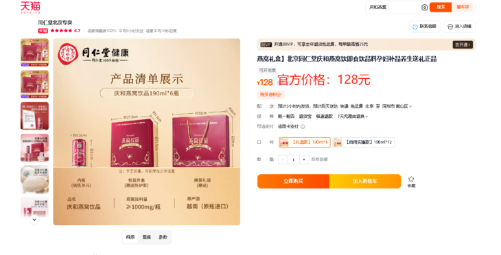 同仁堂燕窝饮线上价格:💰128元 咱们今天开团价只需要💰99元