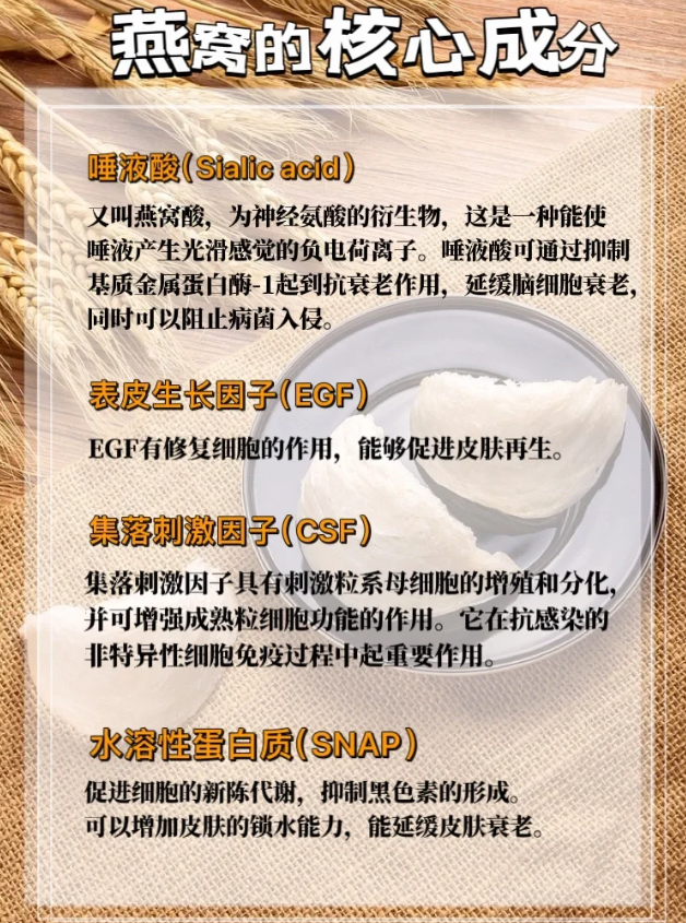 实际上燕窝被称为“舌尖上的奢侈品”并不是浪得虚名, 其中所包含的核心成分是确确实实被证明存在的!