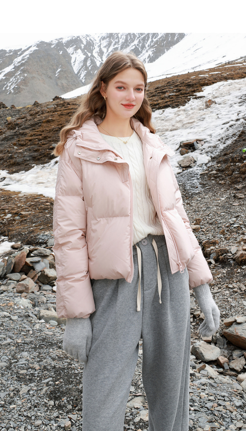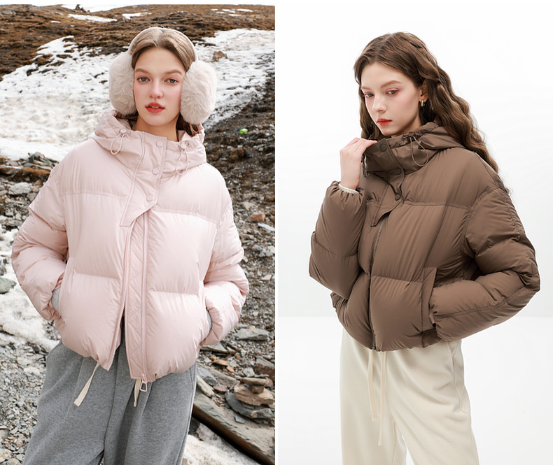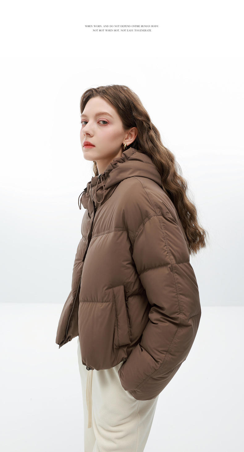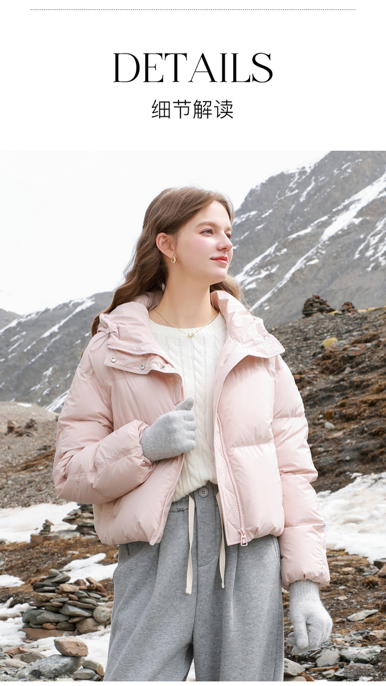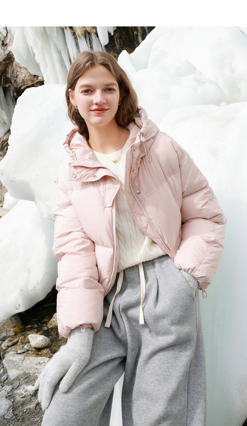 三彩2025冬季新款短款羽绒服连帽白鸭绒面包服宽松纯色简约女