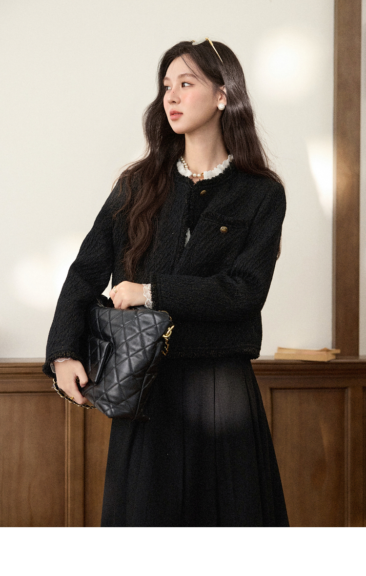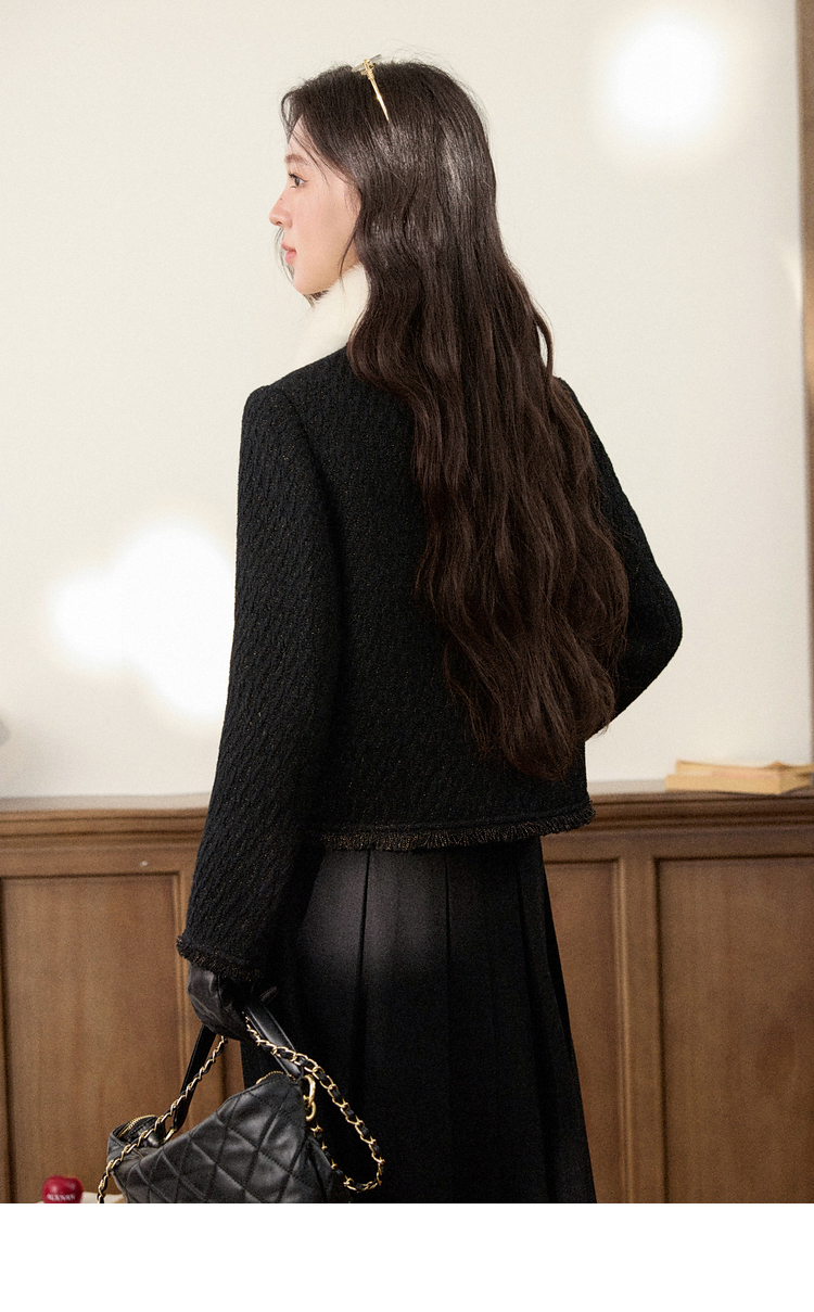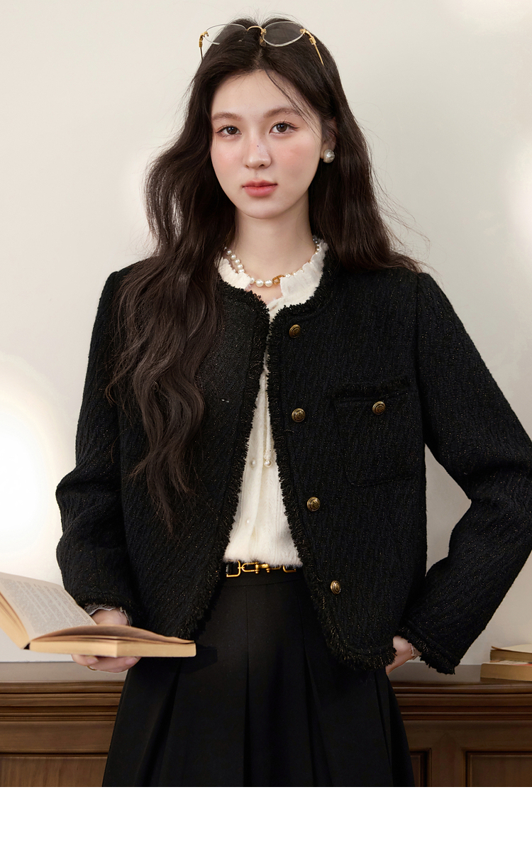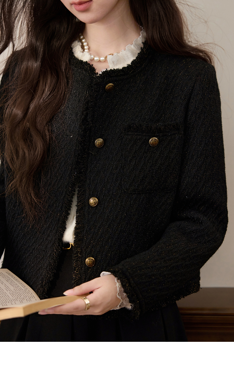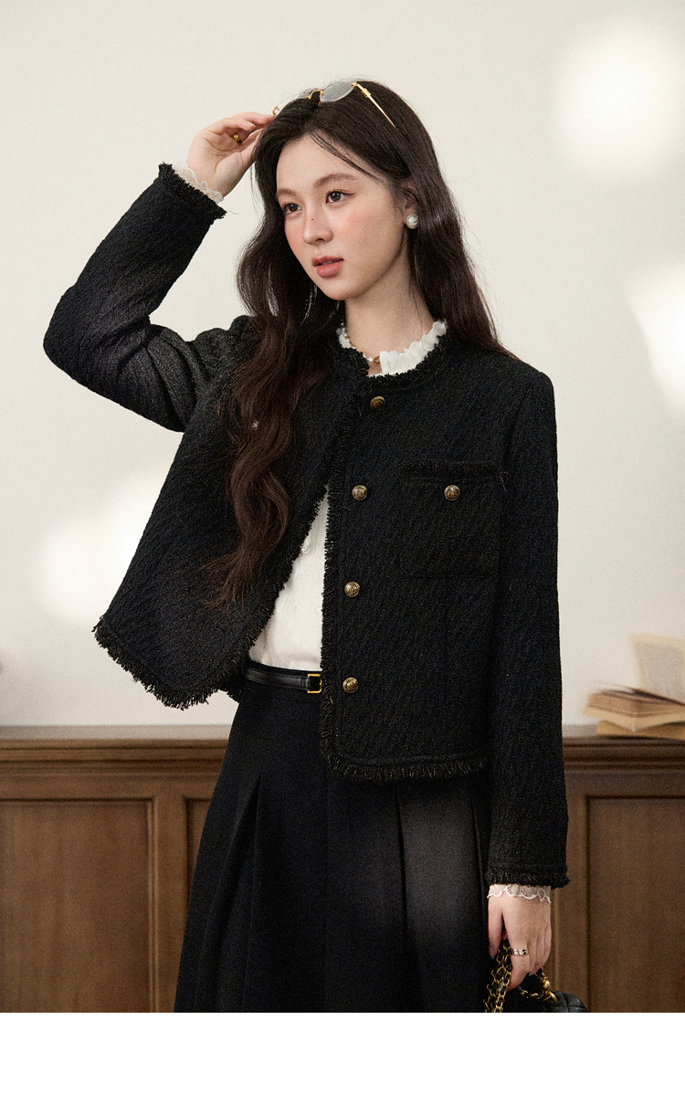 鹿向南「金扣质感」小香风短款外套秋新款宽松小众正肩黑色上衣女