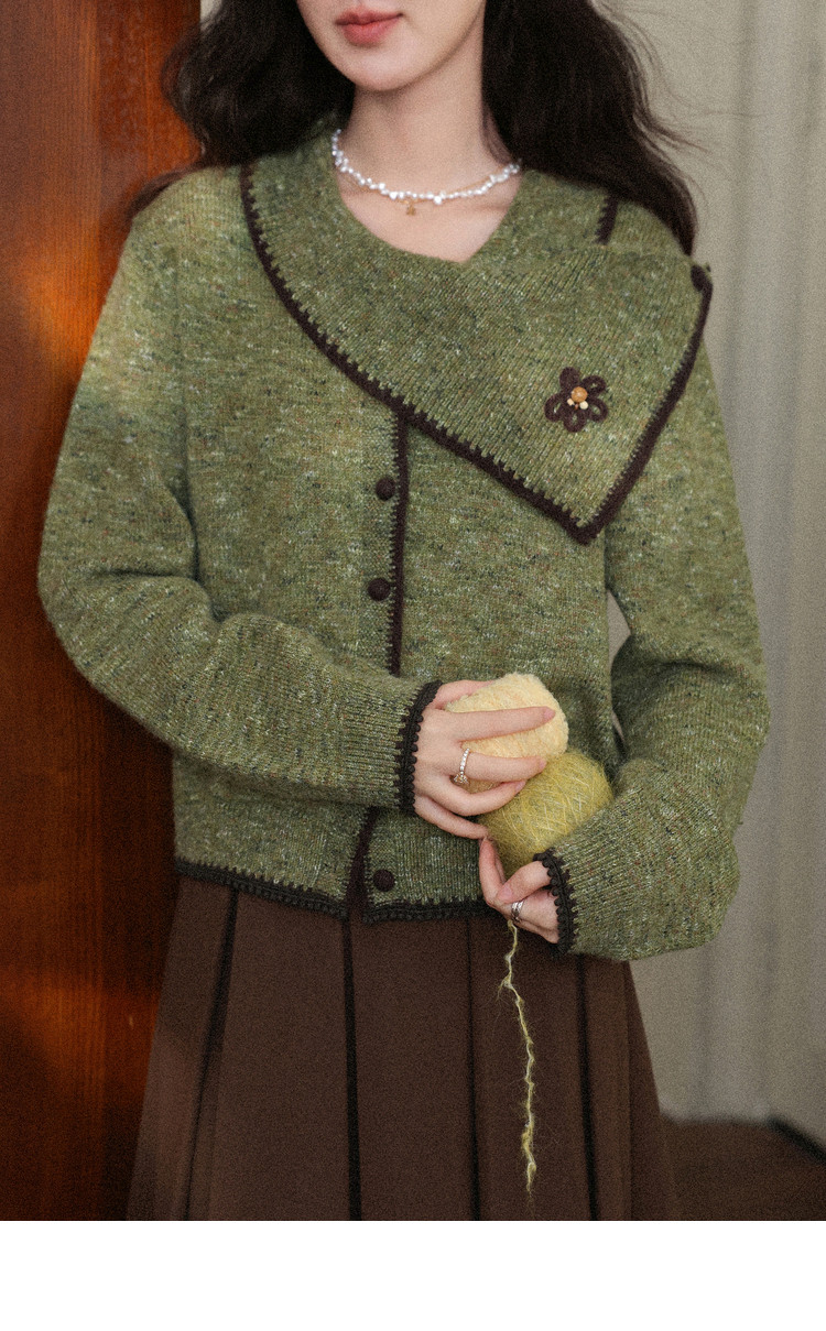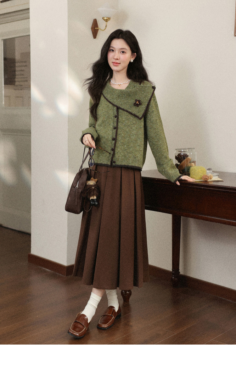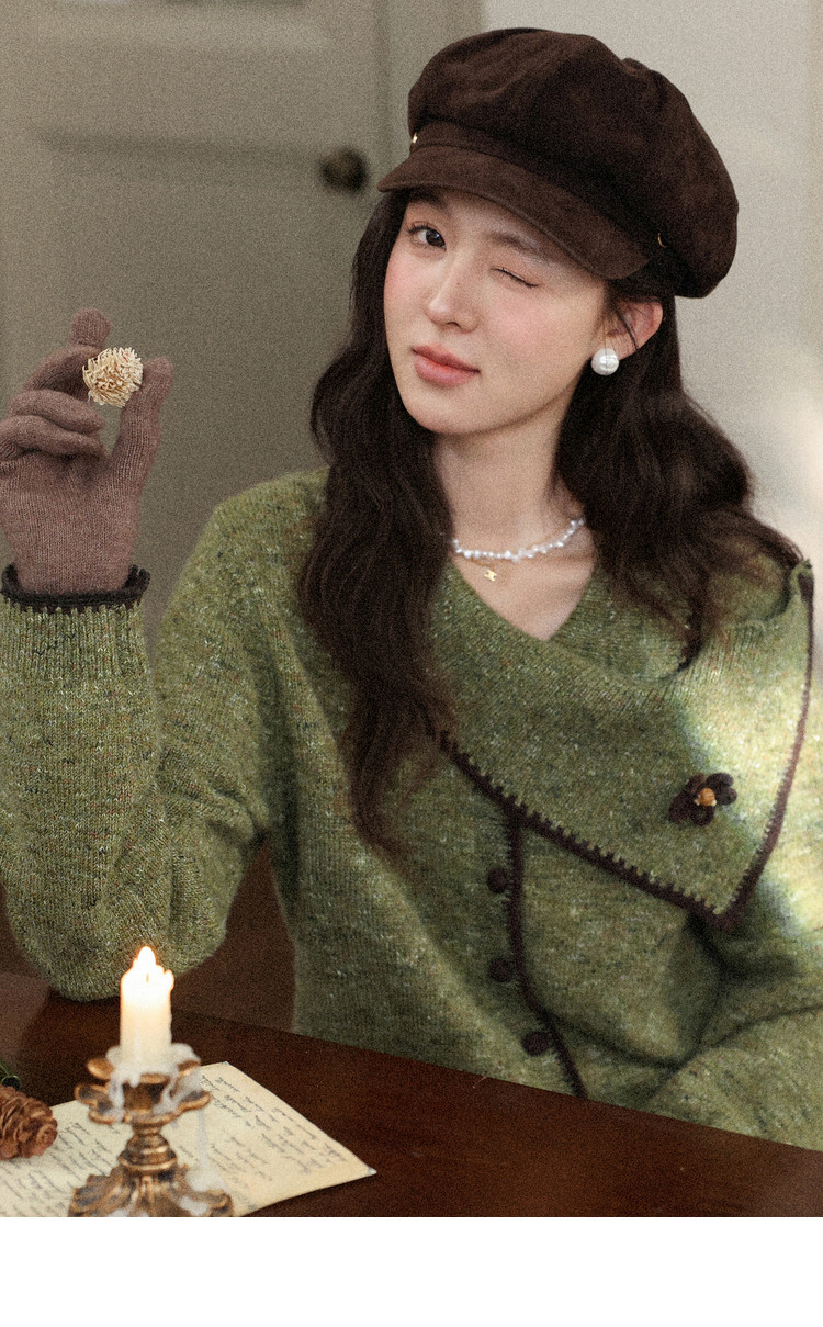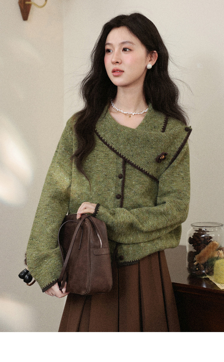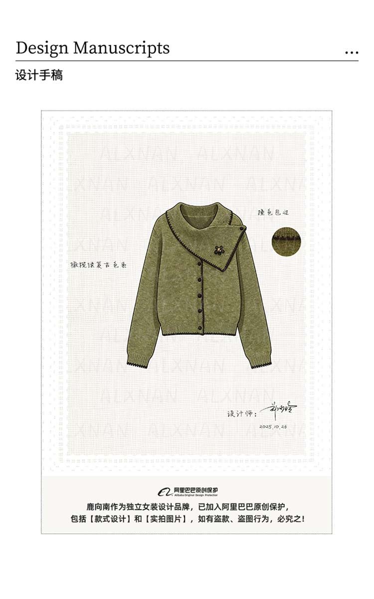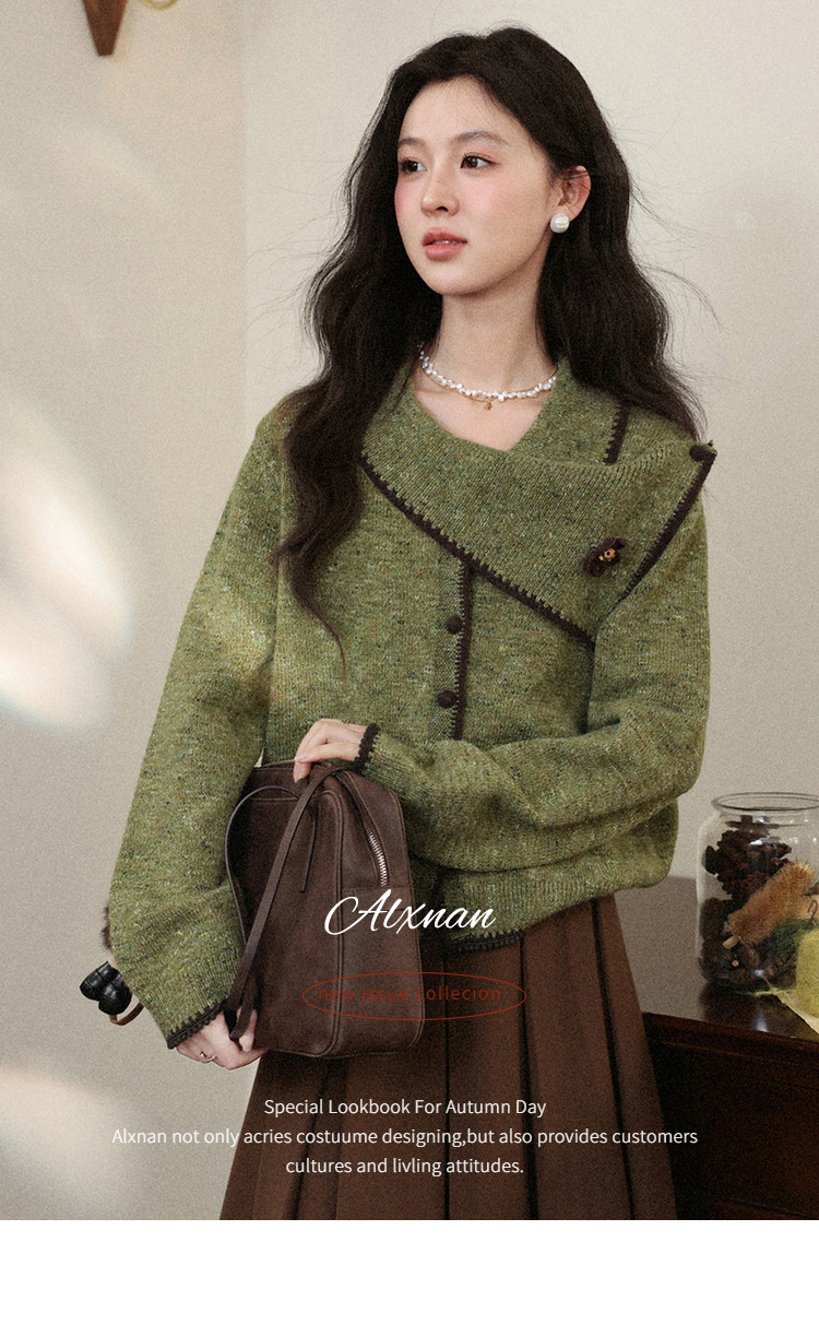 鹿向南「温柔冬时」设计感大翻领慵懒复古绿色毛衣女秋冬针织上衣