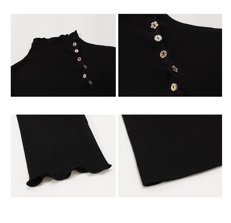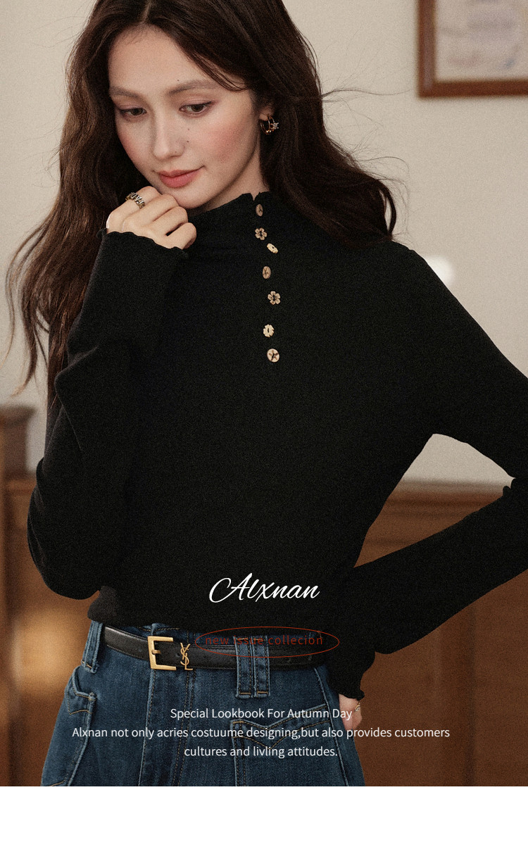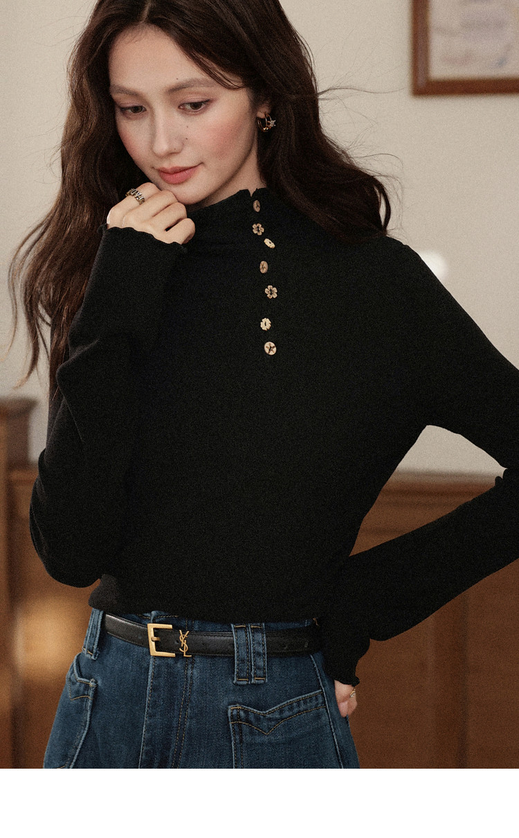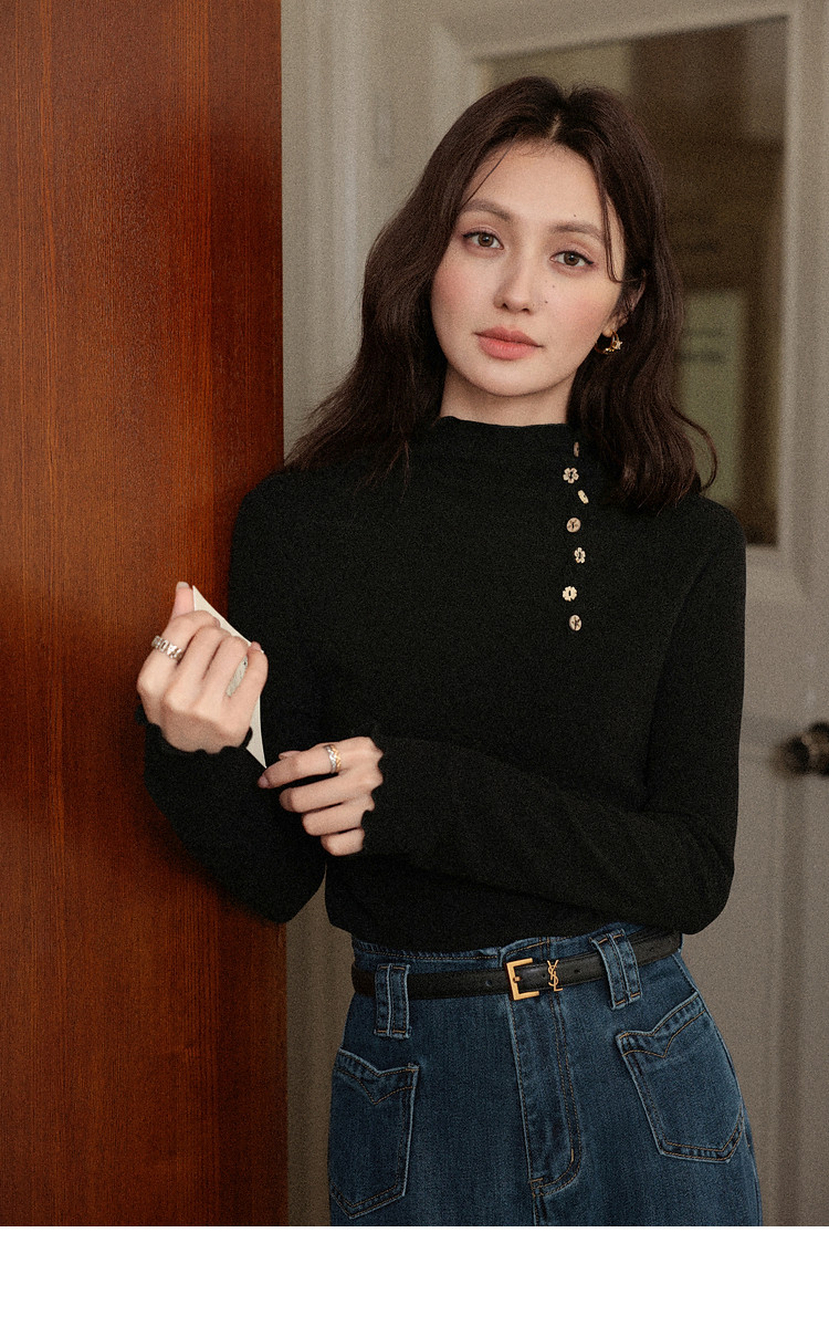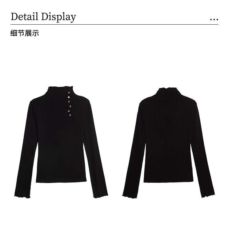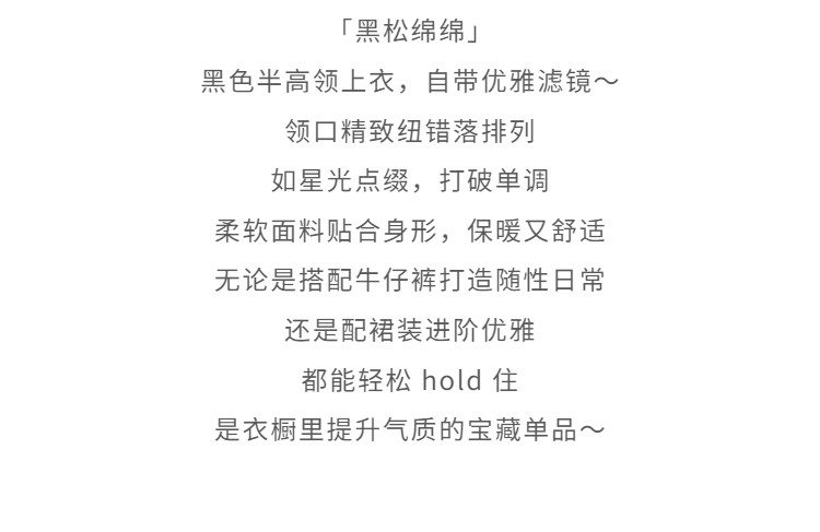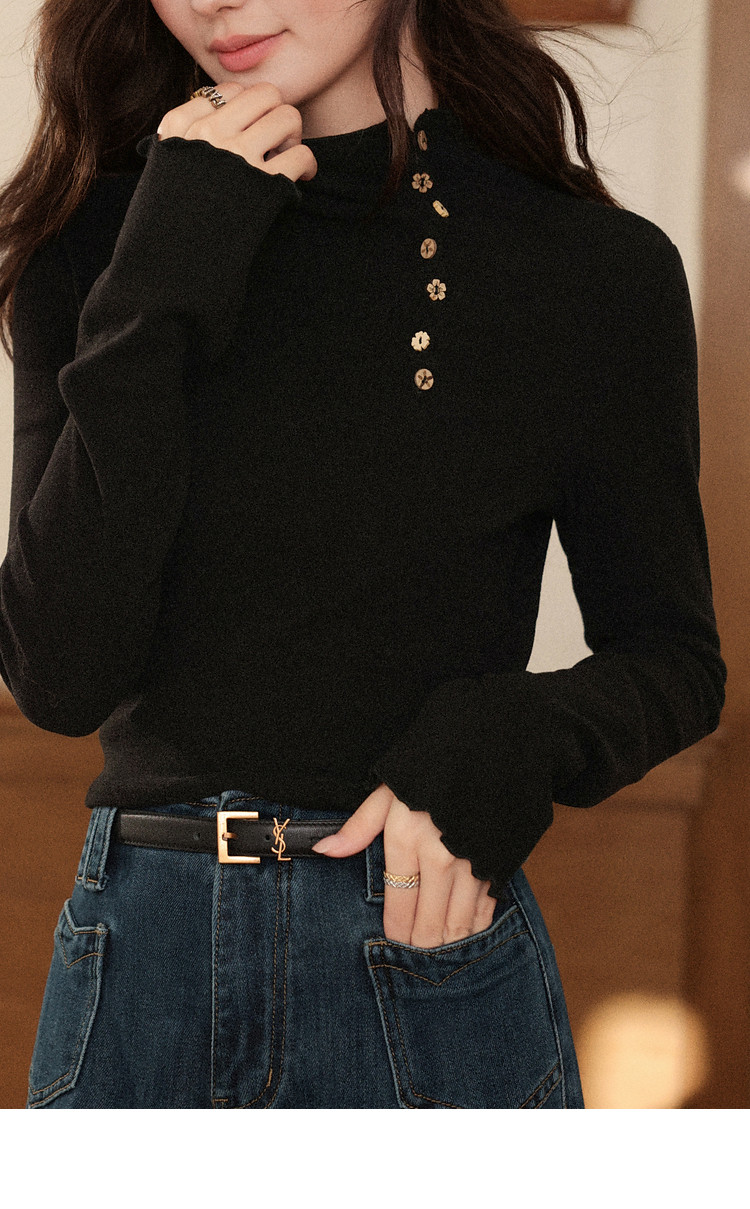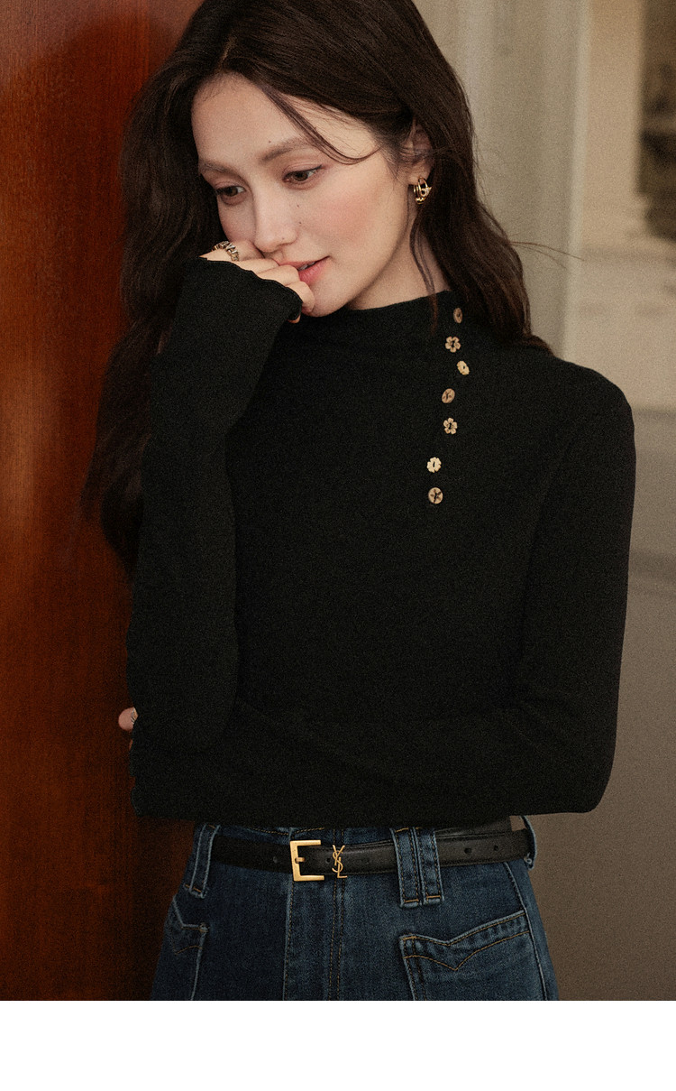 鹿向南「黑松绵绵」法式黑色T恤女秋冬季半高领内搭长袖上衣