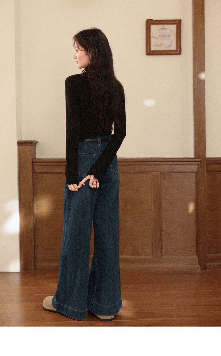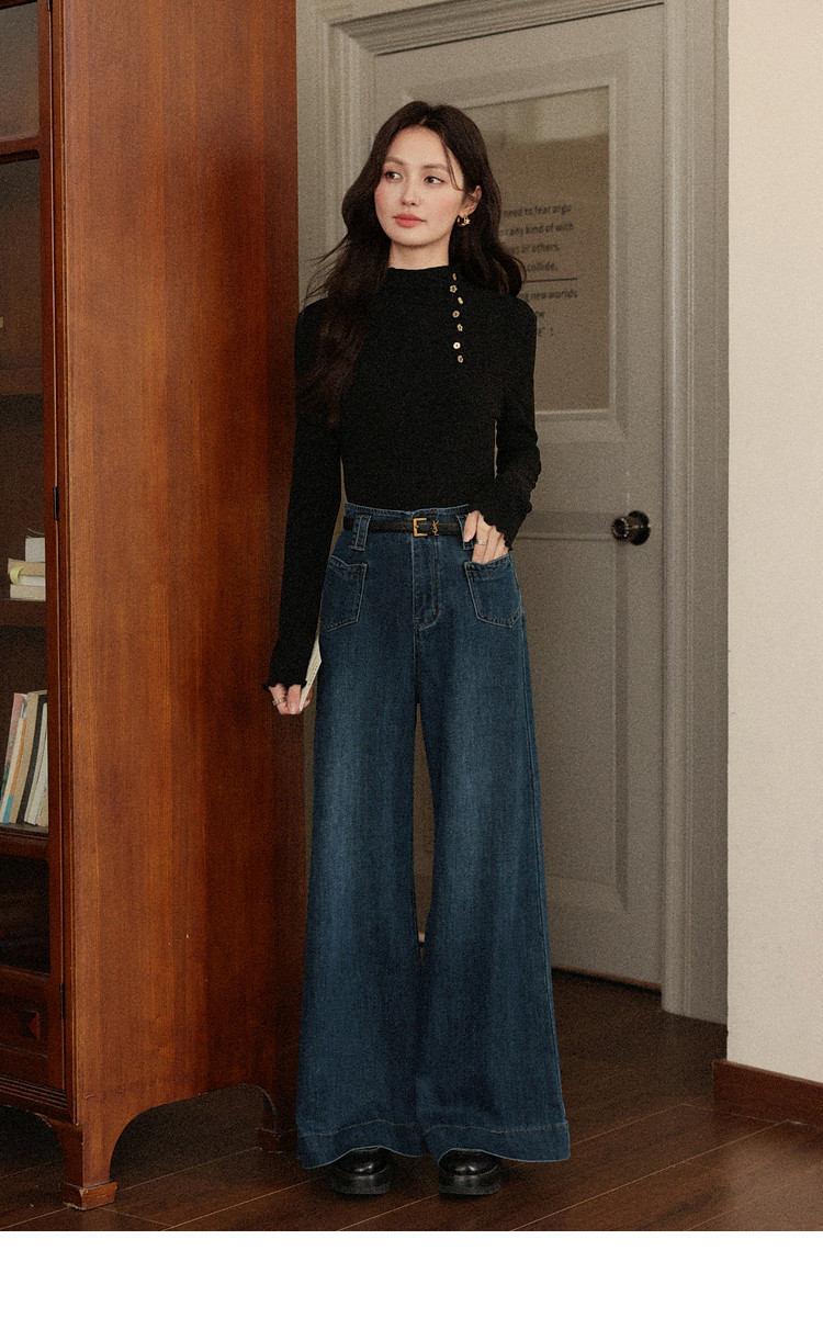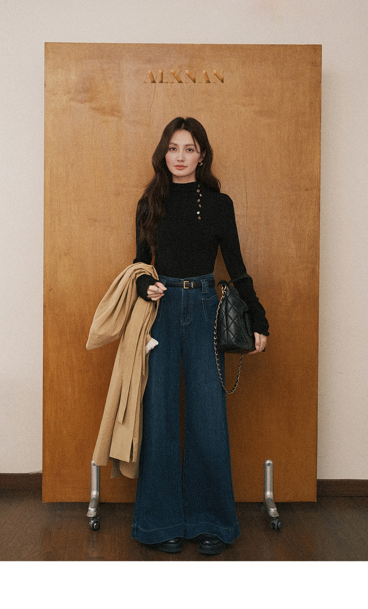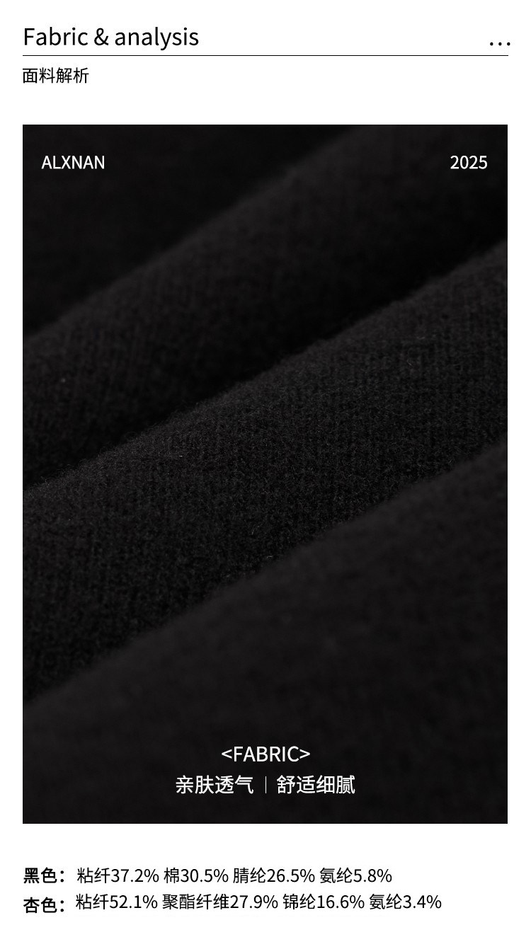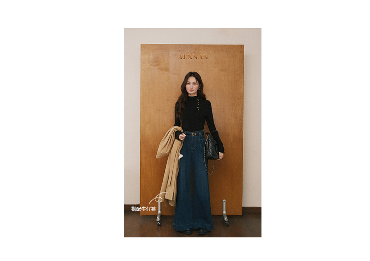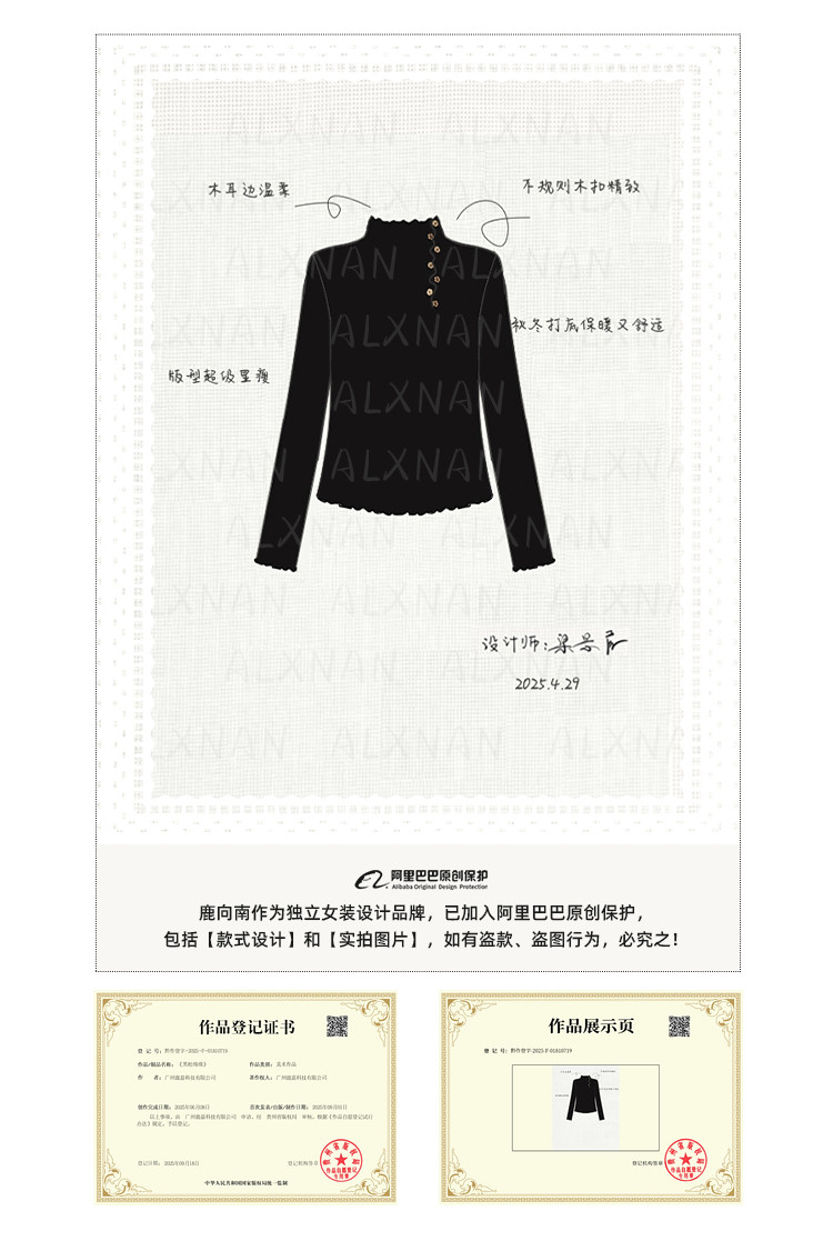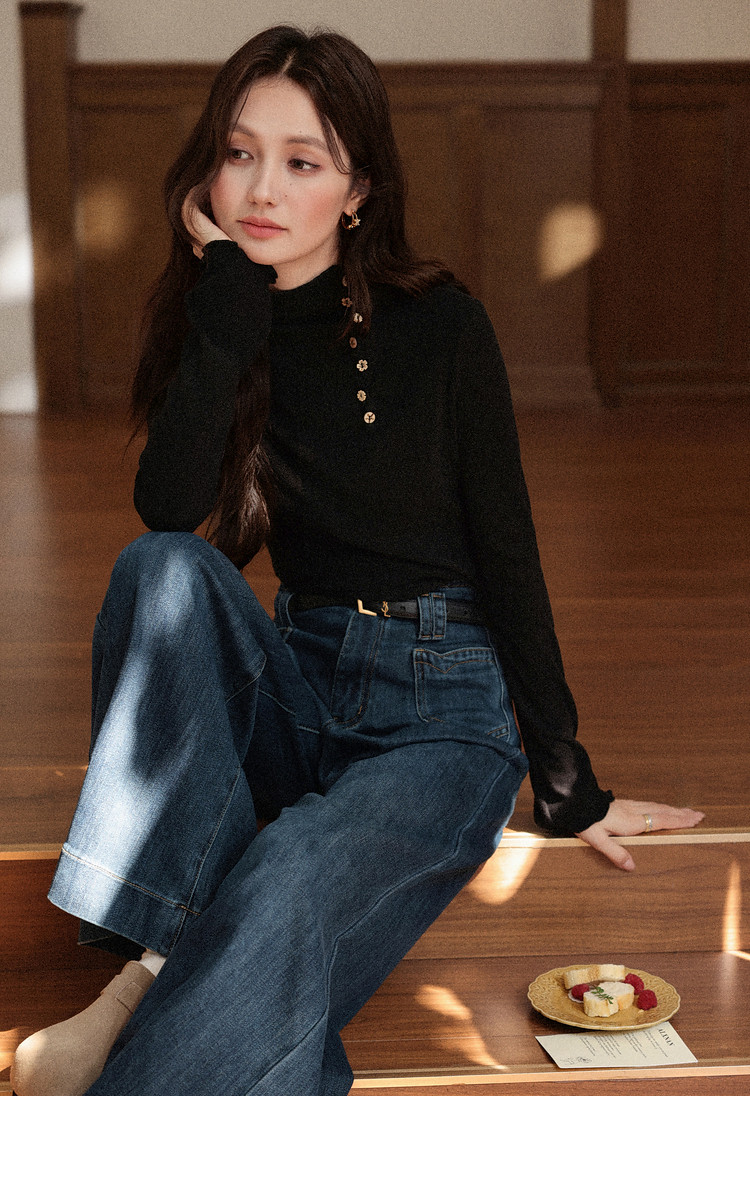 鹿向南「黑松绵绵」法式黑色T恤女秋冬季半高领内搭长袖上衣