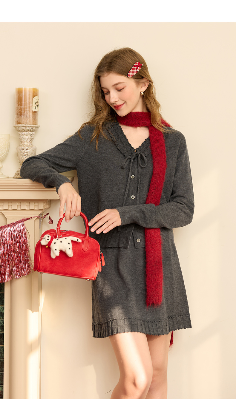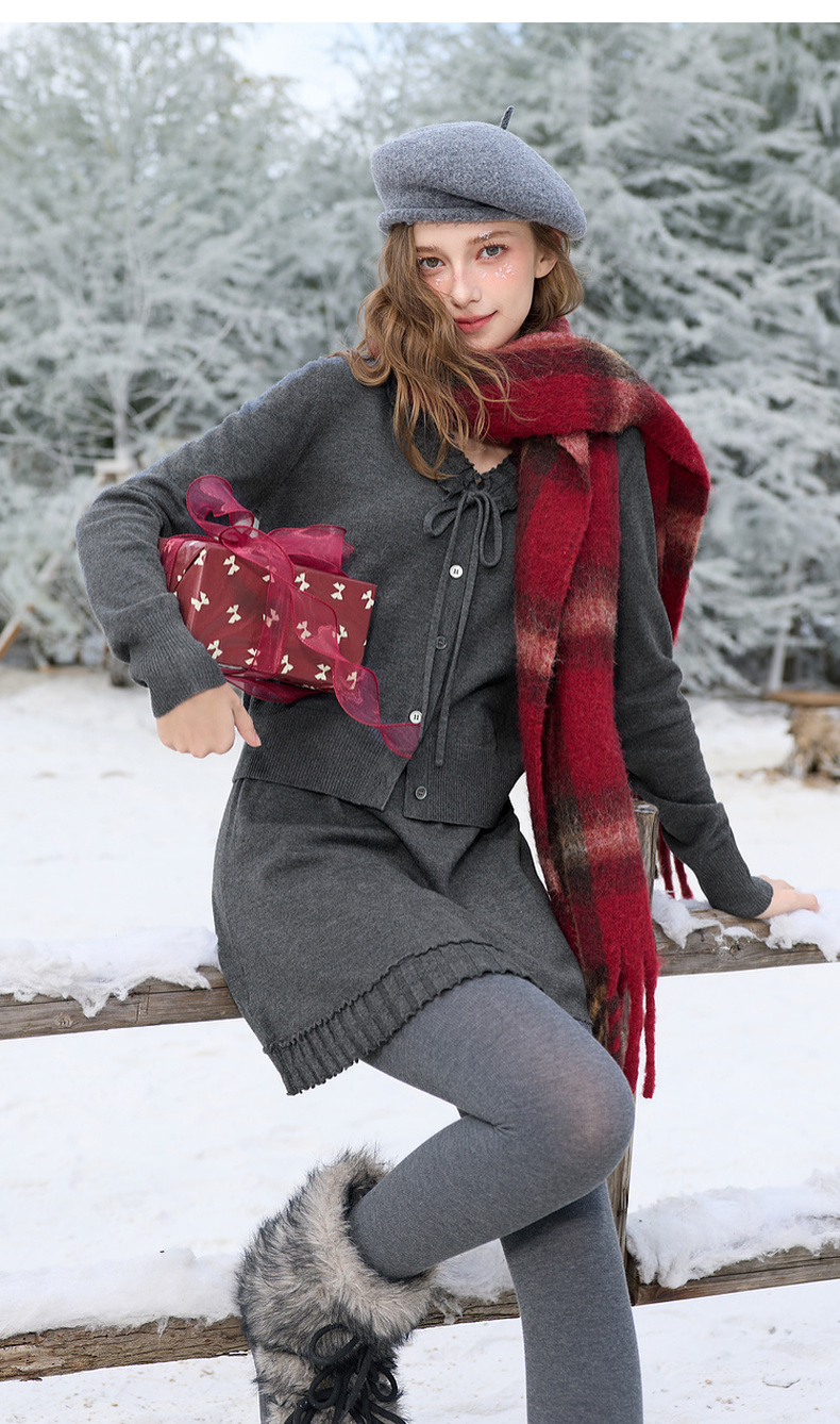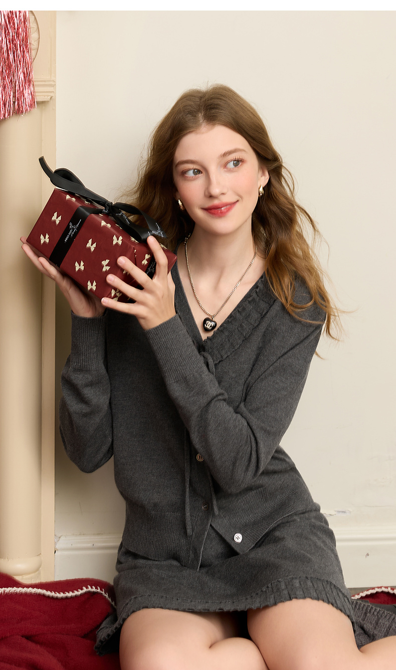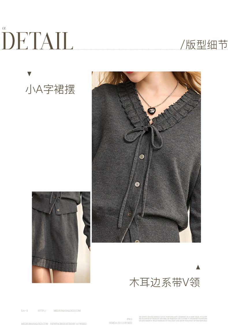 三彩2026春季新款针织套装V领针织衫高腰A字裙半身裙两件套M