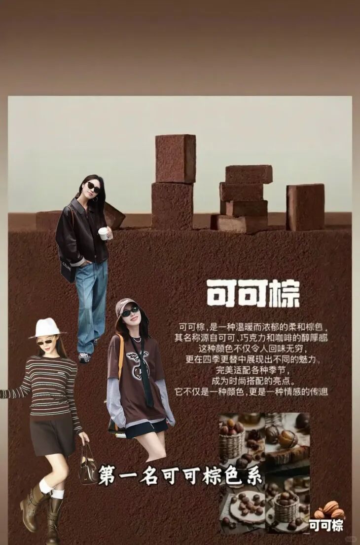 它是一种温暖、深沉且富有质感的棕色系,介于巧克力色和咖啡色之间,带有一种微妙的暖调,让人联想到浓郁的巧克力、醇香的咖啡和温暖的大地,给人一种温暖、沉稳、舒适、高级的感觉。