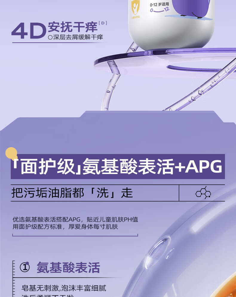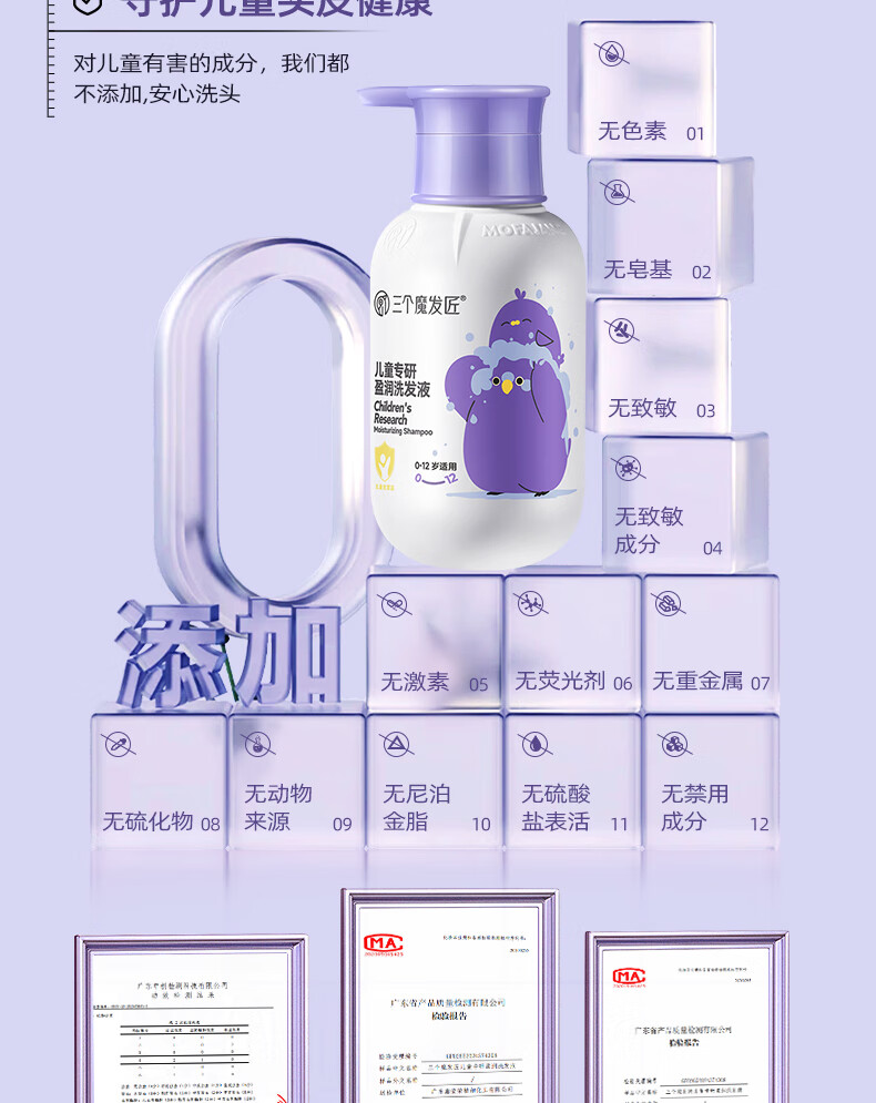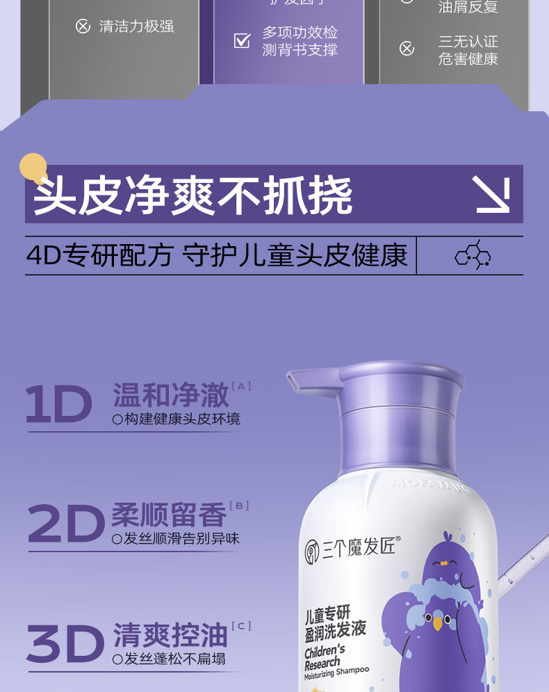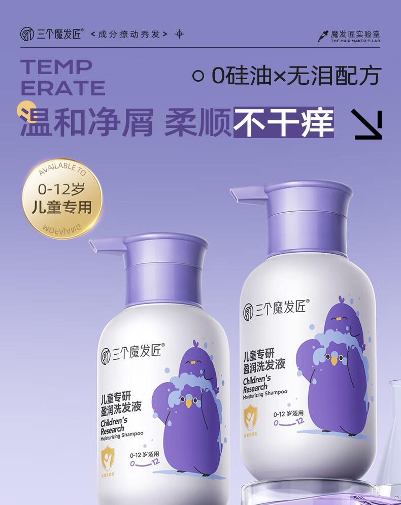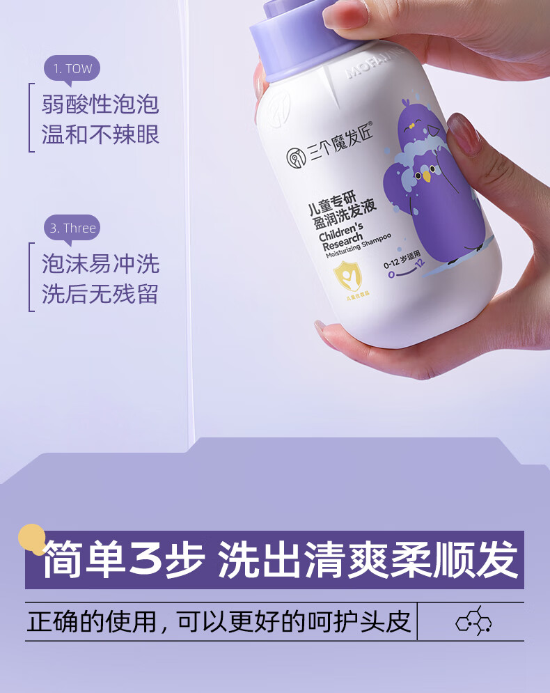 三个魔发匠儿童洗发水0-6-12岁氨基酸无硅油 温和清洁柔顺宝宝洗发露液380ml【工厂直发】