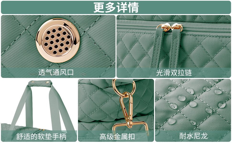 【耐用结构和可拆卸设计】:这款女士周末旅行包采用耐用防水尼龙制成,配有高品质拉链和金属纽扣,可保护您的物品。双手柄和可调节、可拆卸的肩带具有舒适的衬垫,可以减轻携带时的压力。这款旅行包的背面有一个行李带,方便您的旅行/商务旅行。您也可以将其作为手提包、单肩包或斜挎包携带。