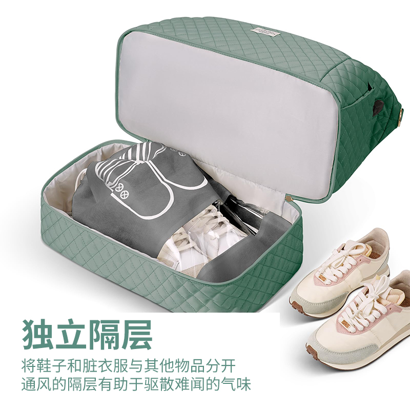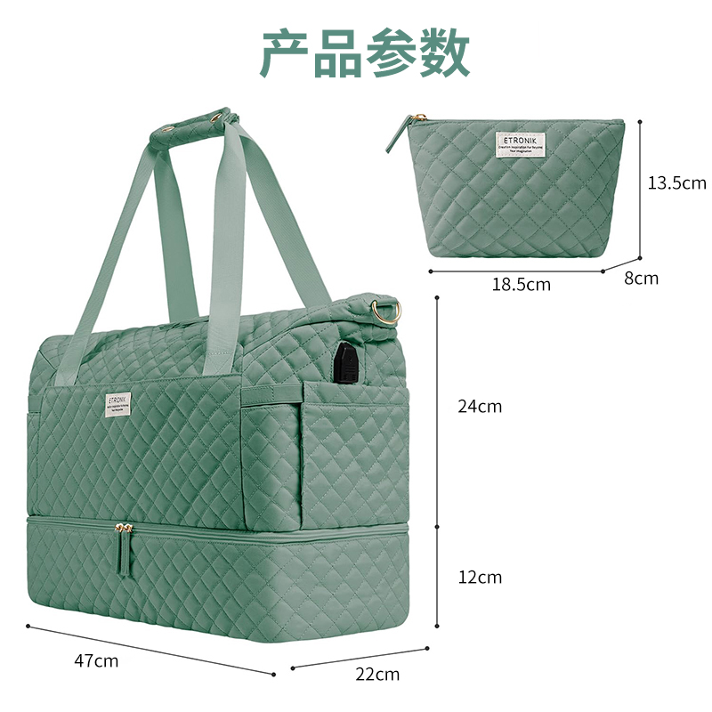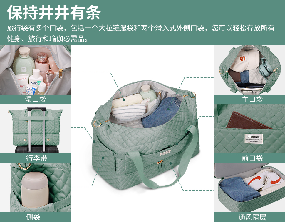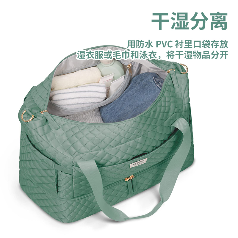 【干湿分离行李袋】:这款女士行李袋提供宽敞的主隔层来存放您的衣服和物品。带拉链的防水 PVC 衬里口袋,可存放湿衣服或毛巾和泳衣。此外,这款旅行行李袋还额外提供一个小化妆包,方便存放。