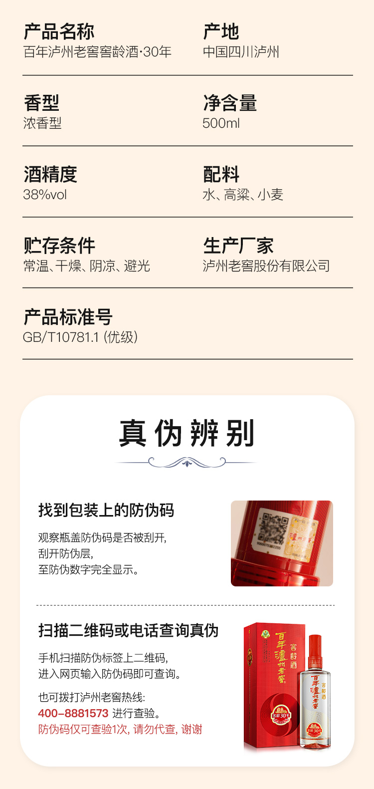 泸州老窖 窖龄30年 浓香型白酒 38度500ml 单瓶装