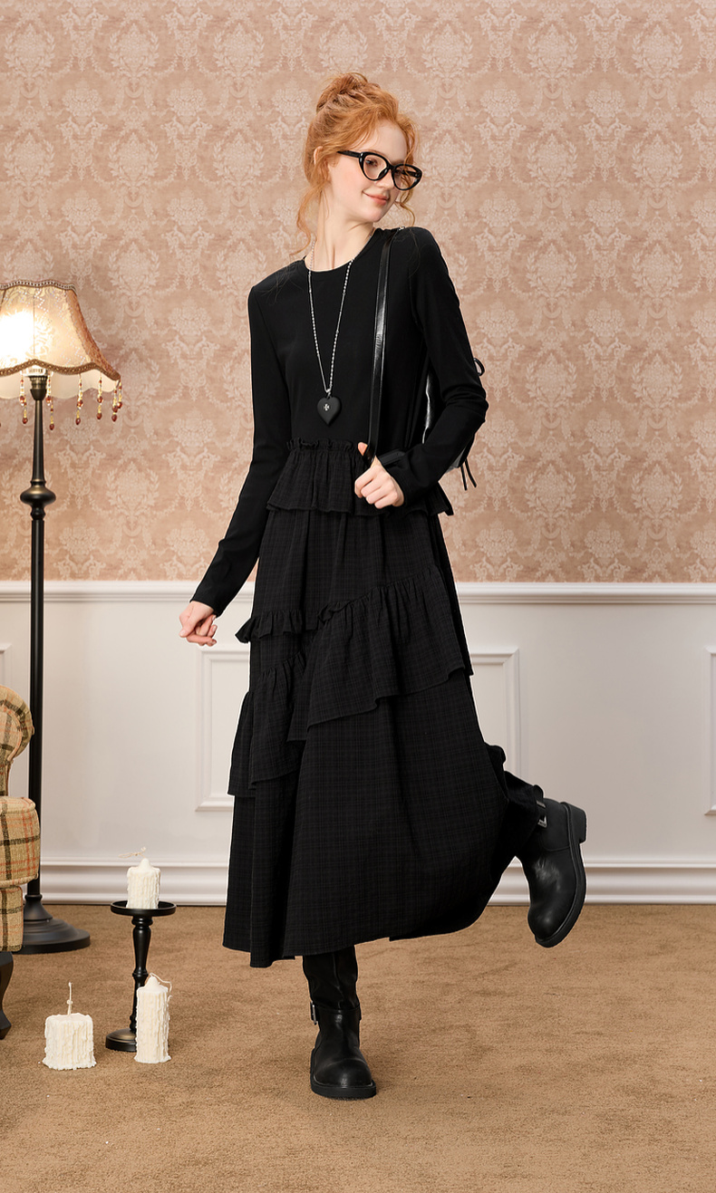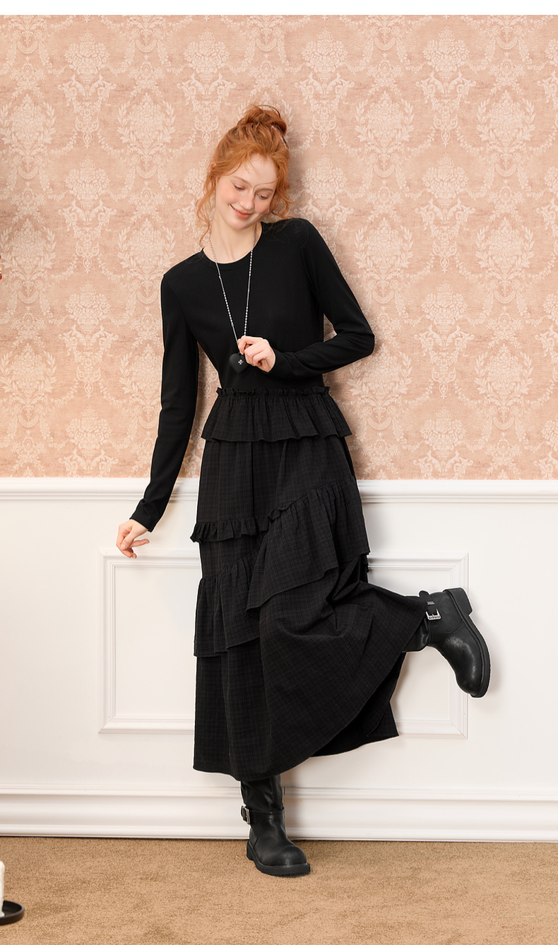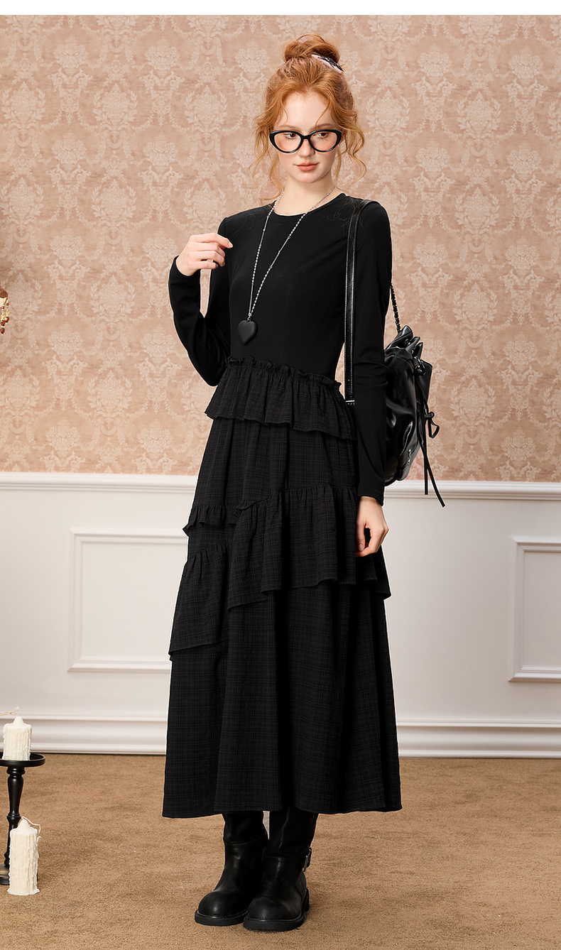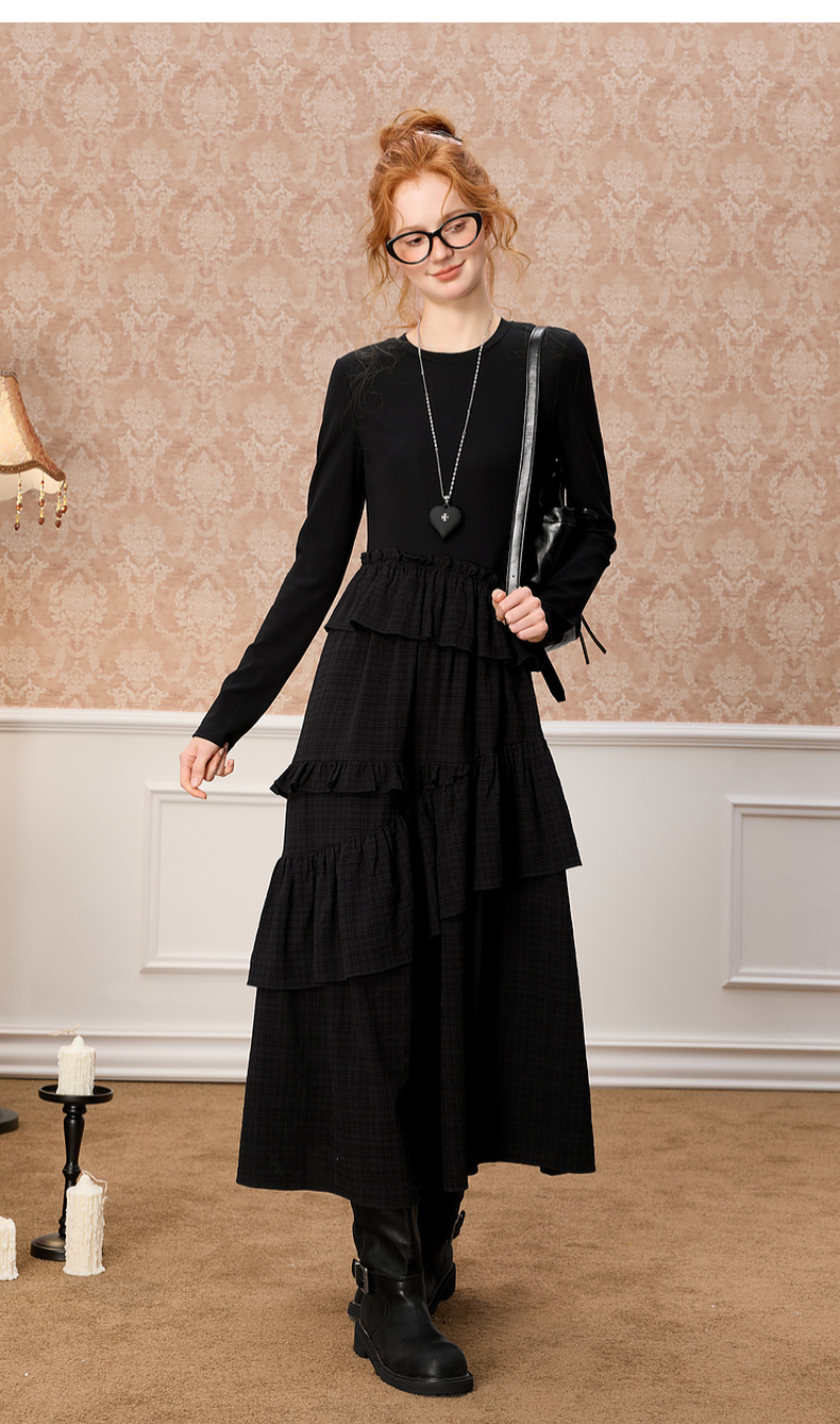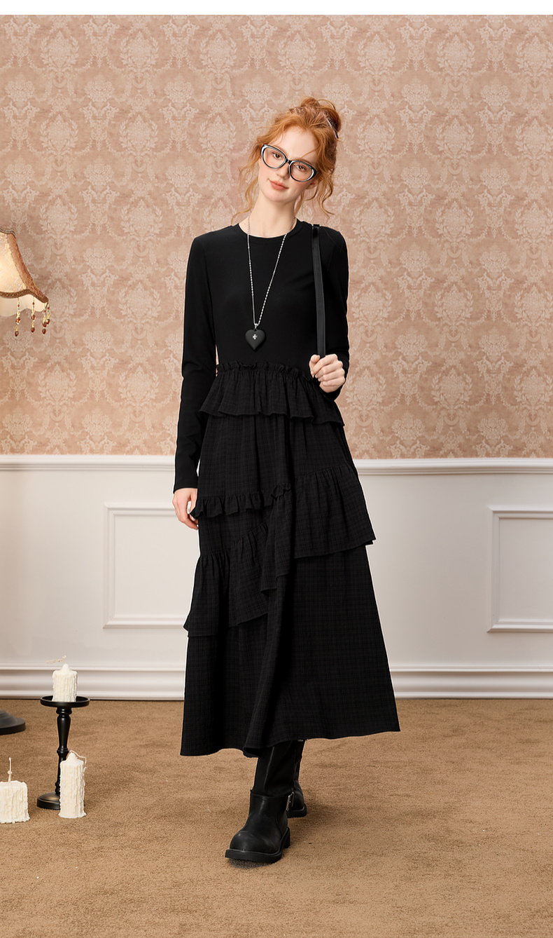 三彩独醒2025冬季新款拼接小黑裙荷叶边收腰A字裙长裙F