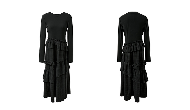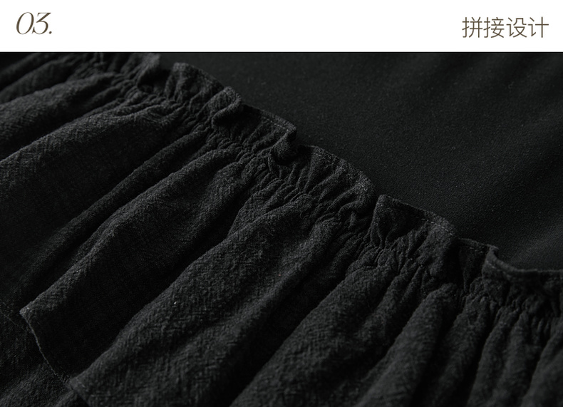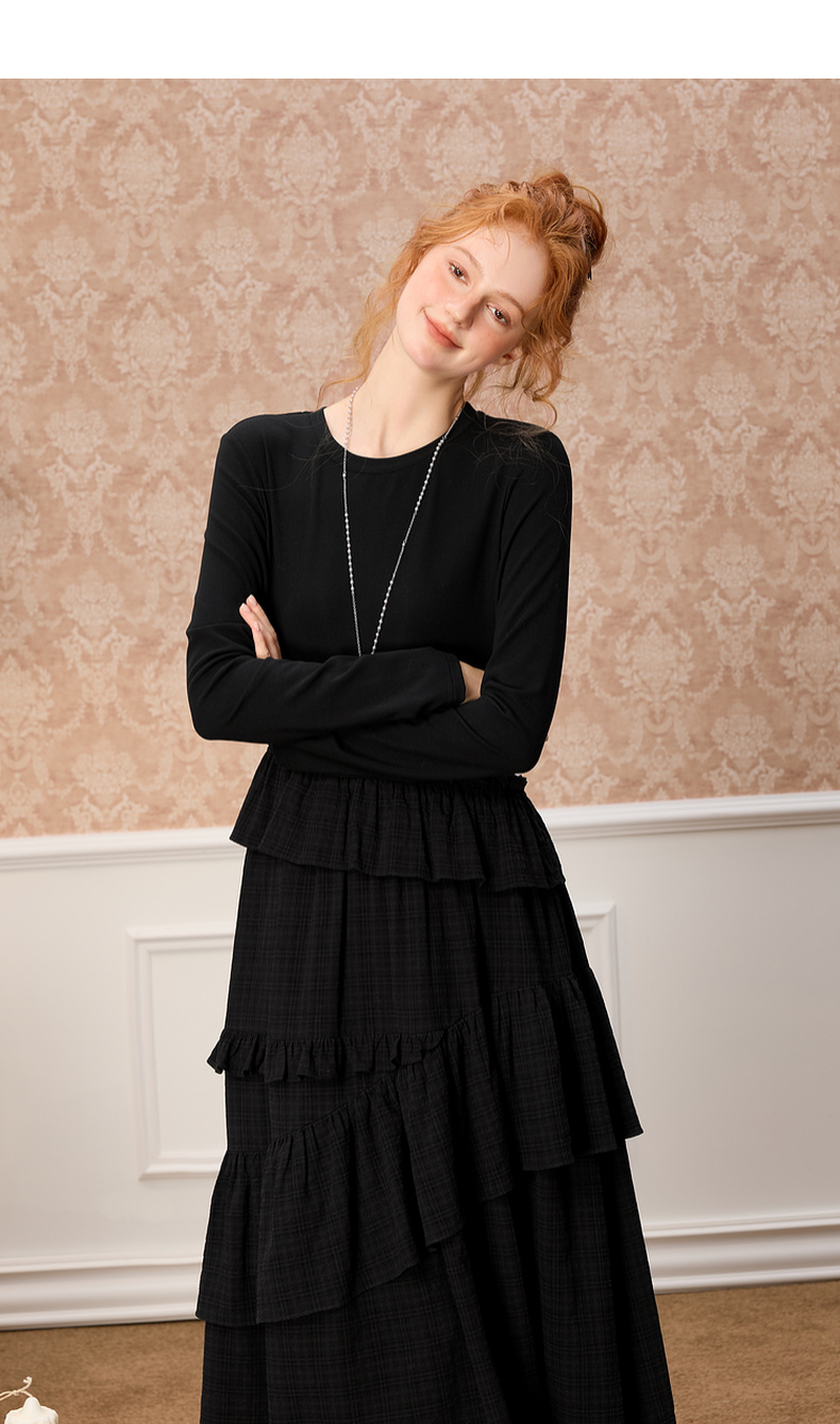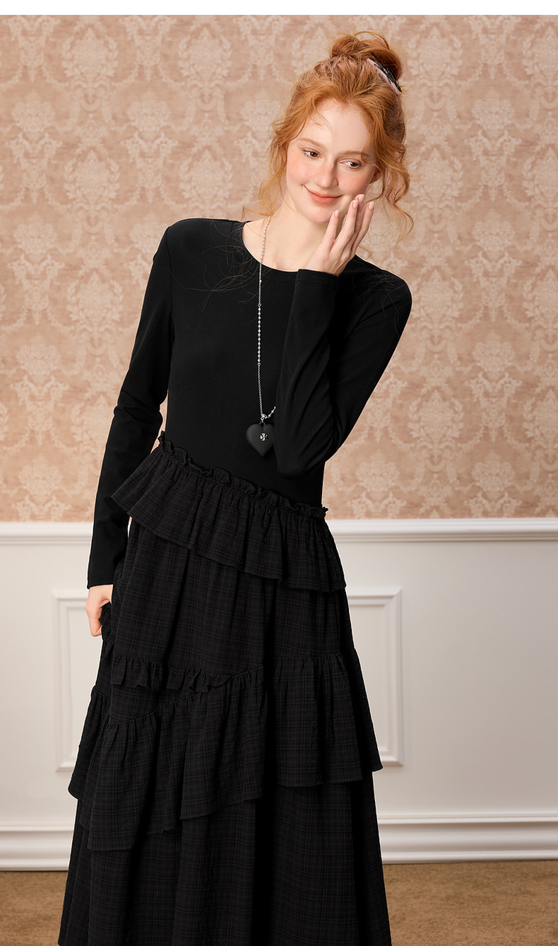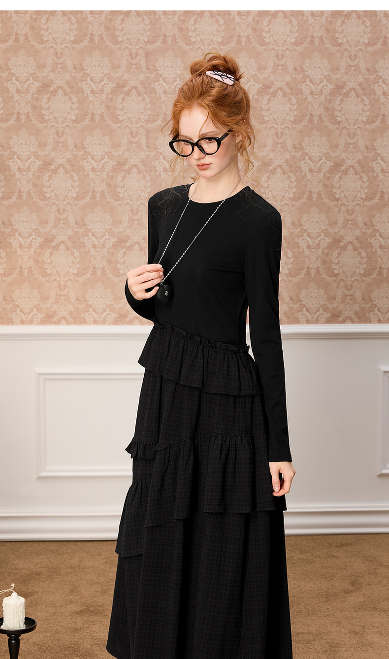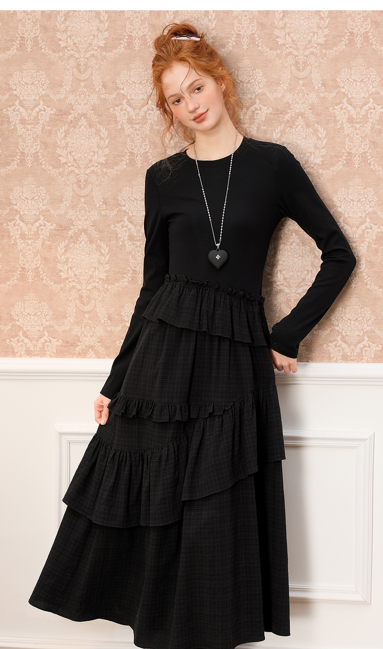三彩独醒2025冬季新款拼接小黑裙荷叶边收腰A字裙长裙F