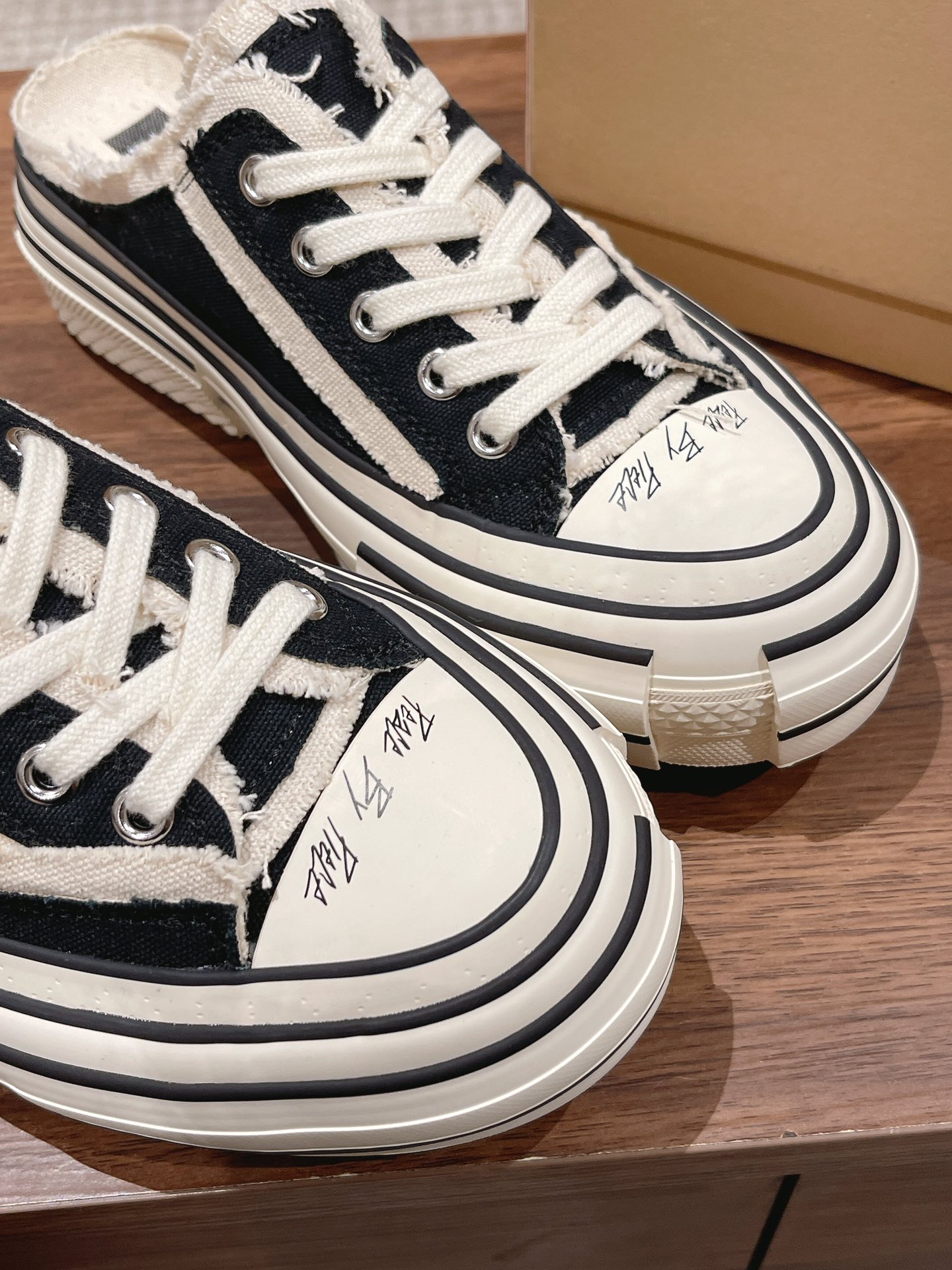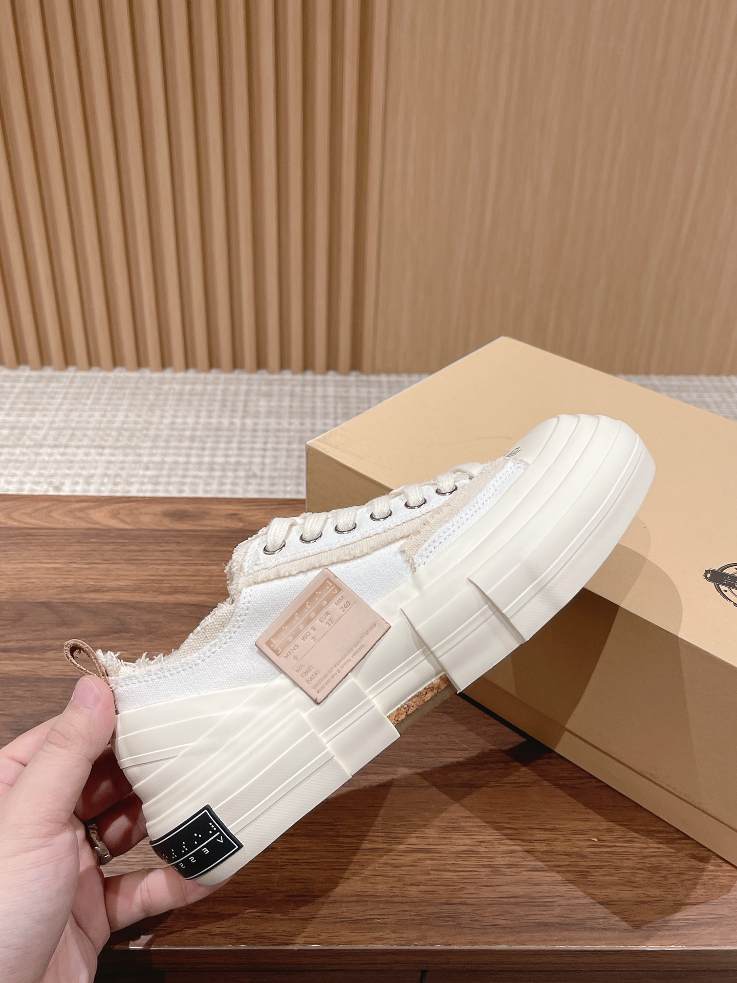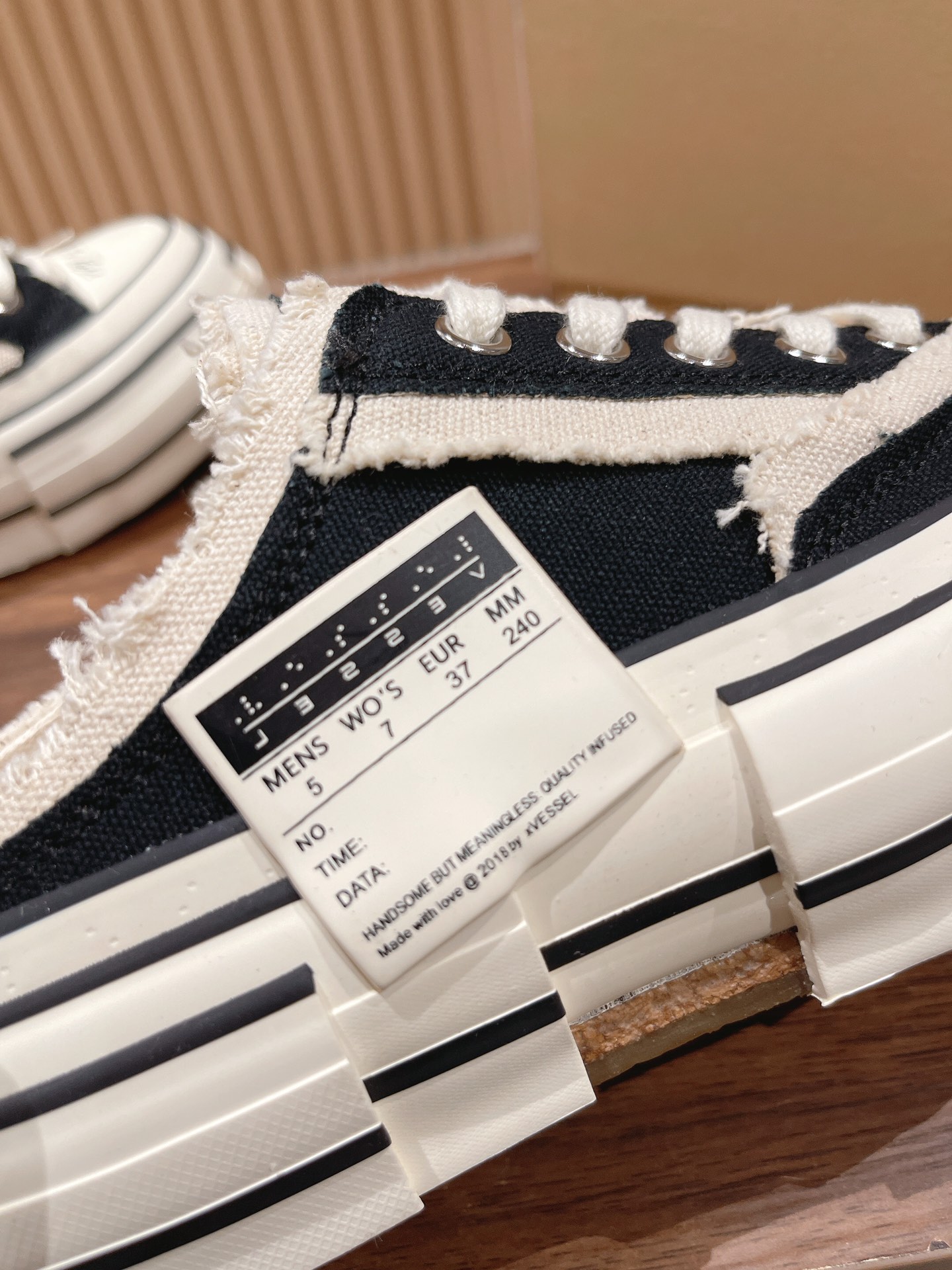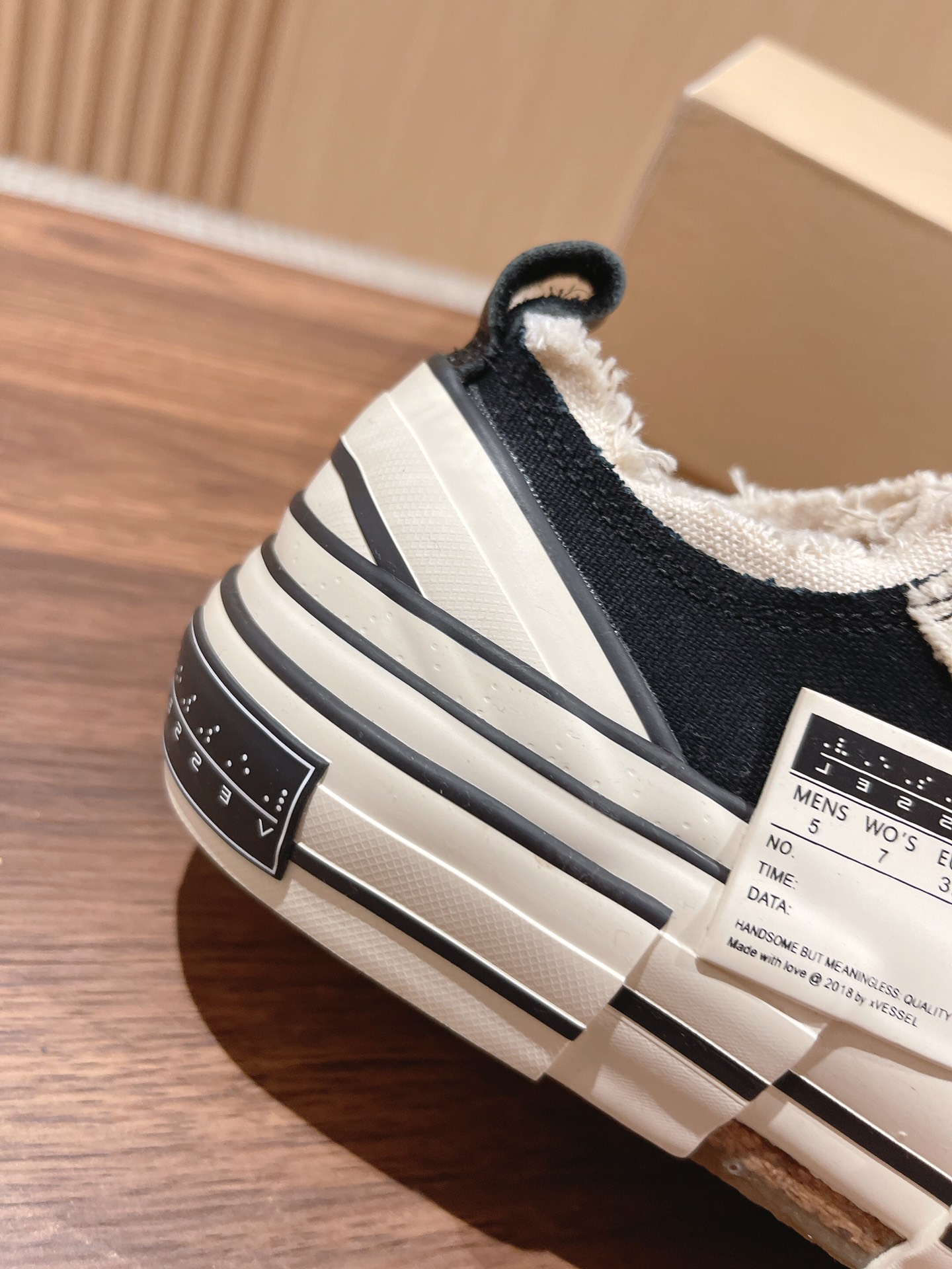 莞产|𝙭𝙑𝙀𝙎𝙎𝙀𝙇✅已认证💯 吴建豪 x Vessel 乞丐硫化帆布鞋情侣款 ——这款帆布鞋设计前卫,以三双拼接一双,鞋带和鞋舌的地方运用了毛边的设计,乞丐系列 𝙭𝙑𝙀𝙎𝙎𝙀𝙇号称是世界上第一双软木硫化鞋的鞋,充满了艺术感和复古的感觉,同时鞋子的设计颇有解构与重组的设计感,这也是这双鞋看起来像帆布鞋,却很有科幻感和空间感的原因所在。 中底软木填充 把古法手工皮鞋工艺与硫化鞋完美结合鞋面的设计也是沿袭了解构与重组的设计风格,将酷帅进行到底