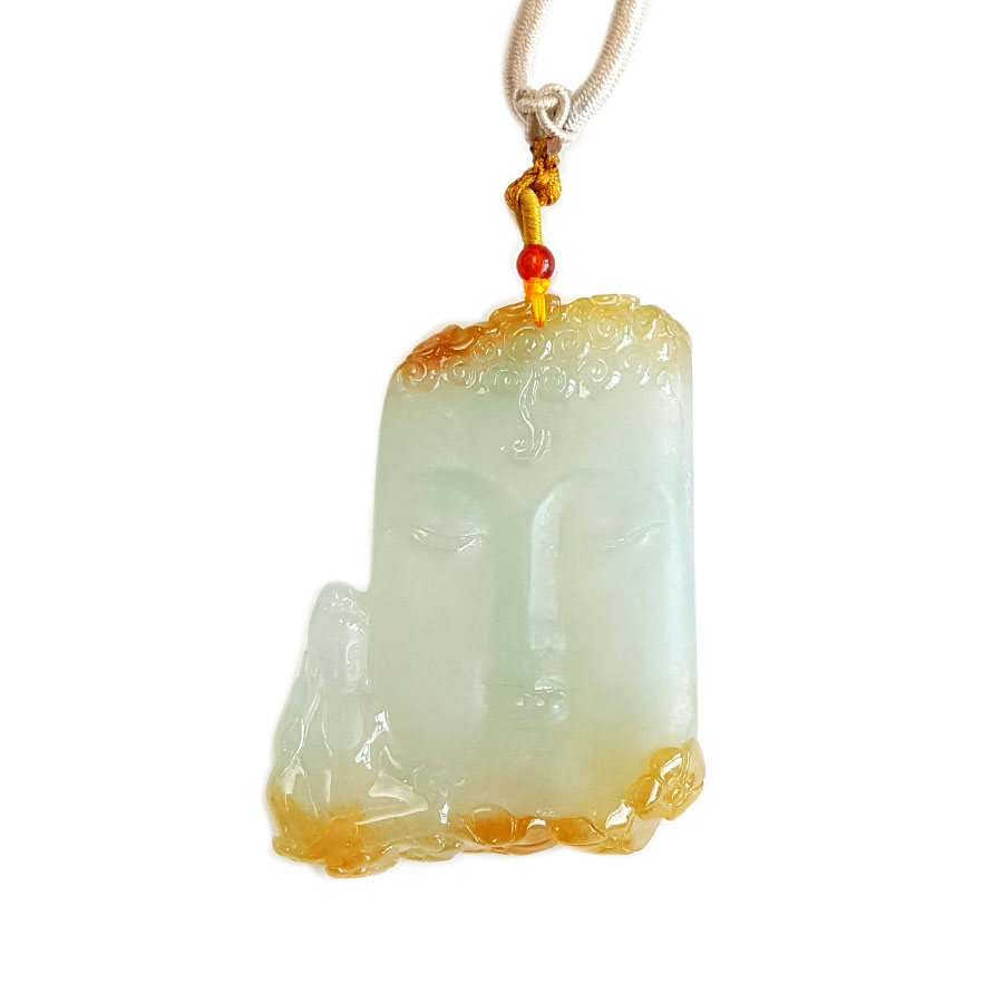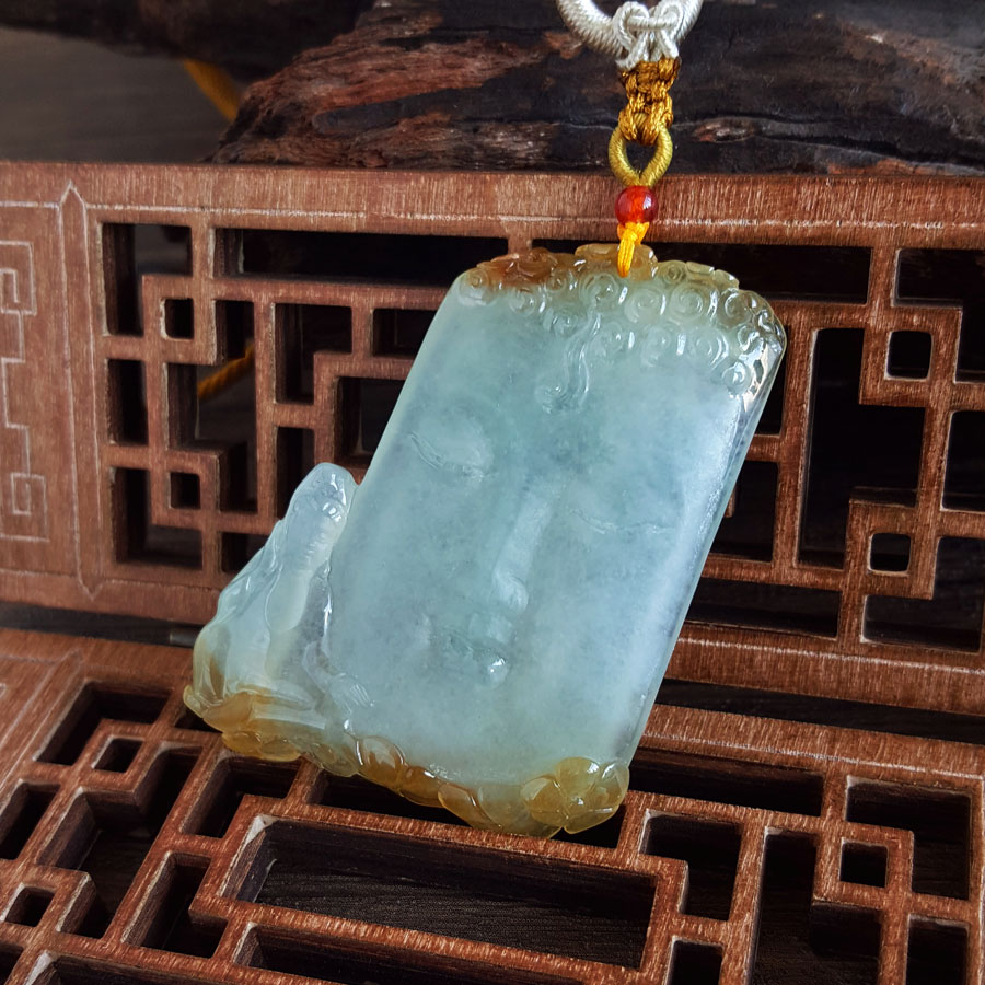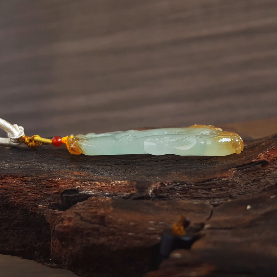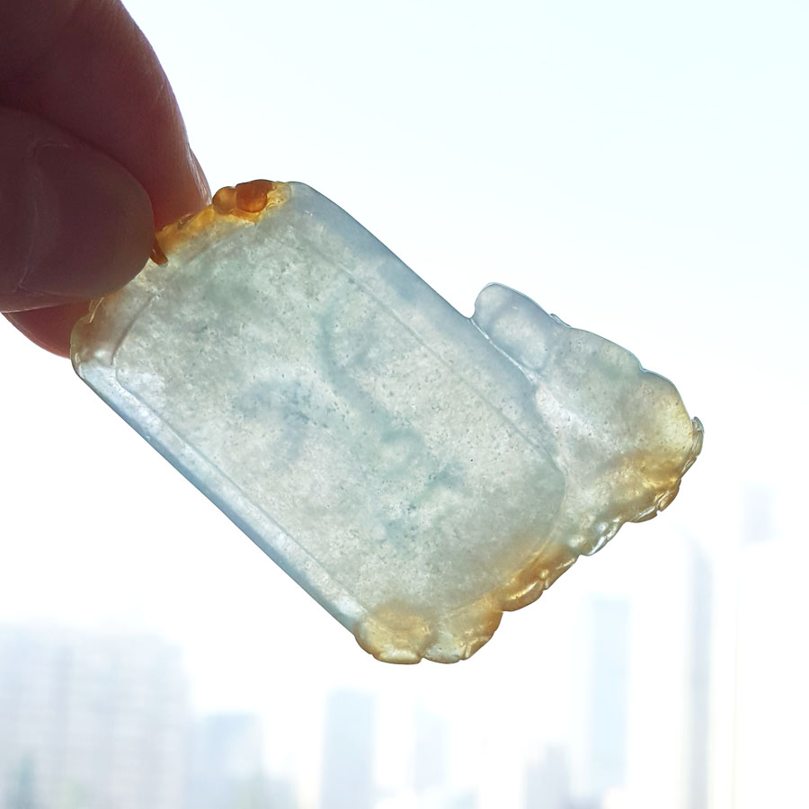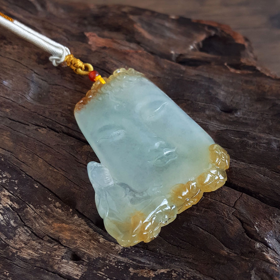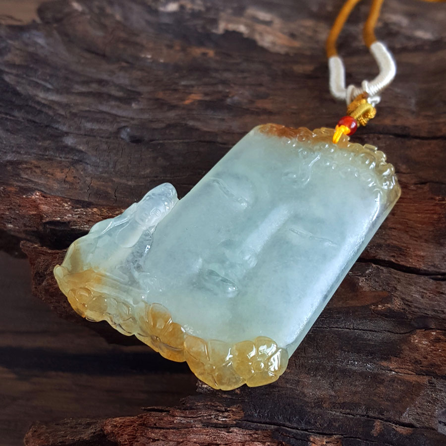 名称 | 天然精品细腻无纹裂冰种观音无事牌黄翡吊坠 |