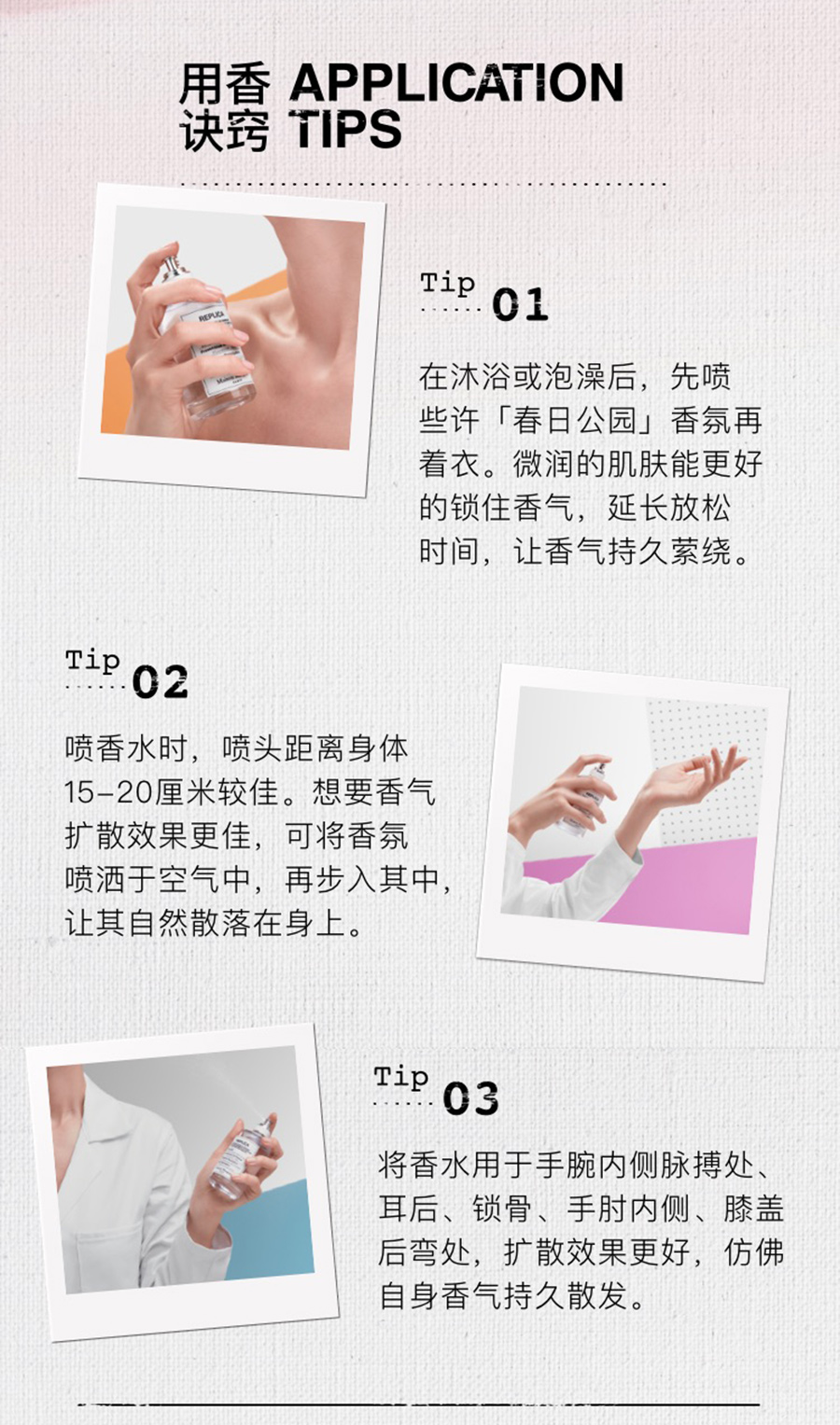 1.流汗处不要使用:避免香水和汗水混合在一起,而产生变化的味道,特别是头发、腋下等汗多的部位。