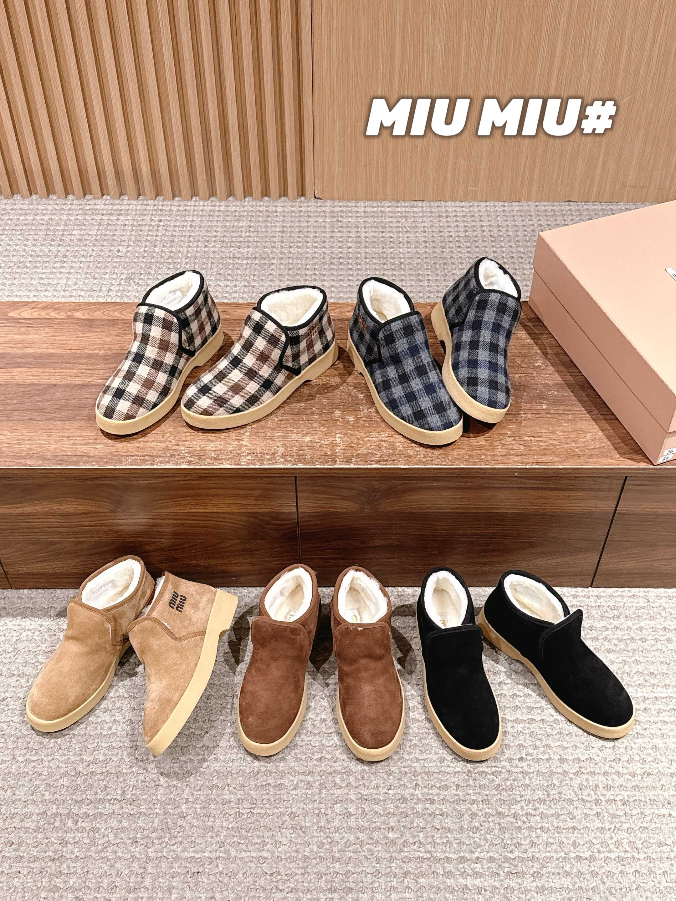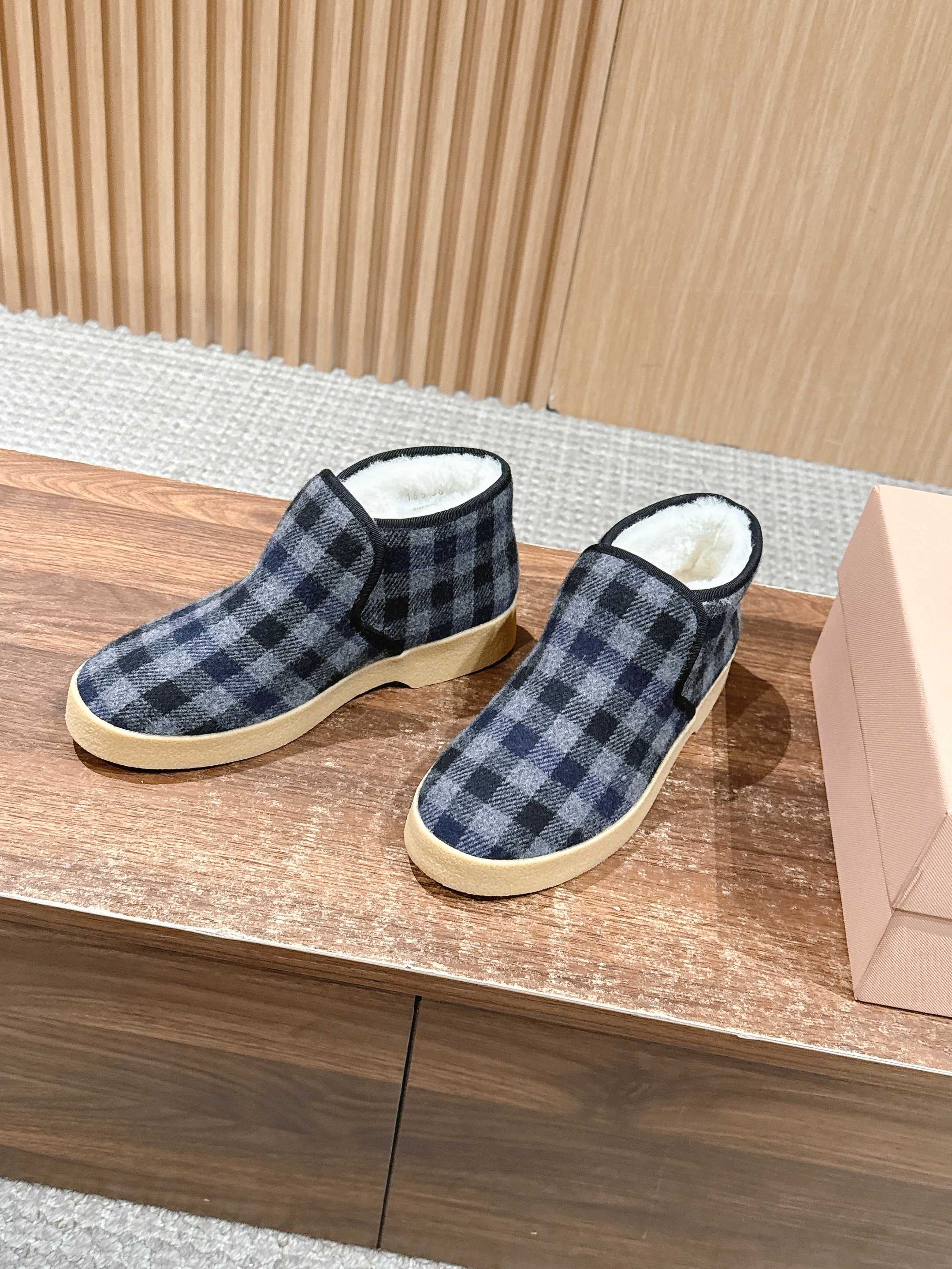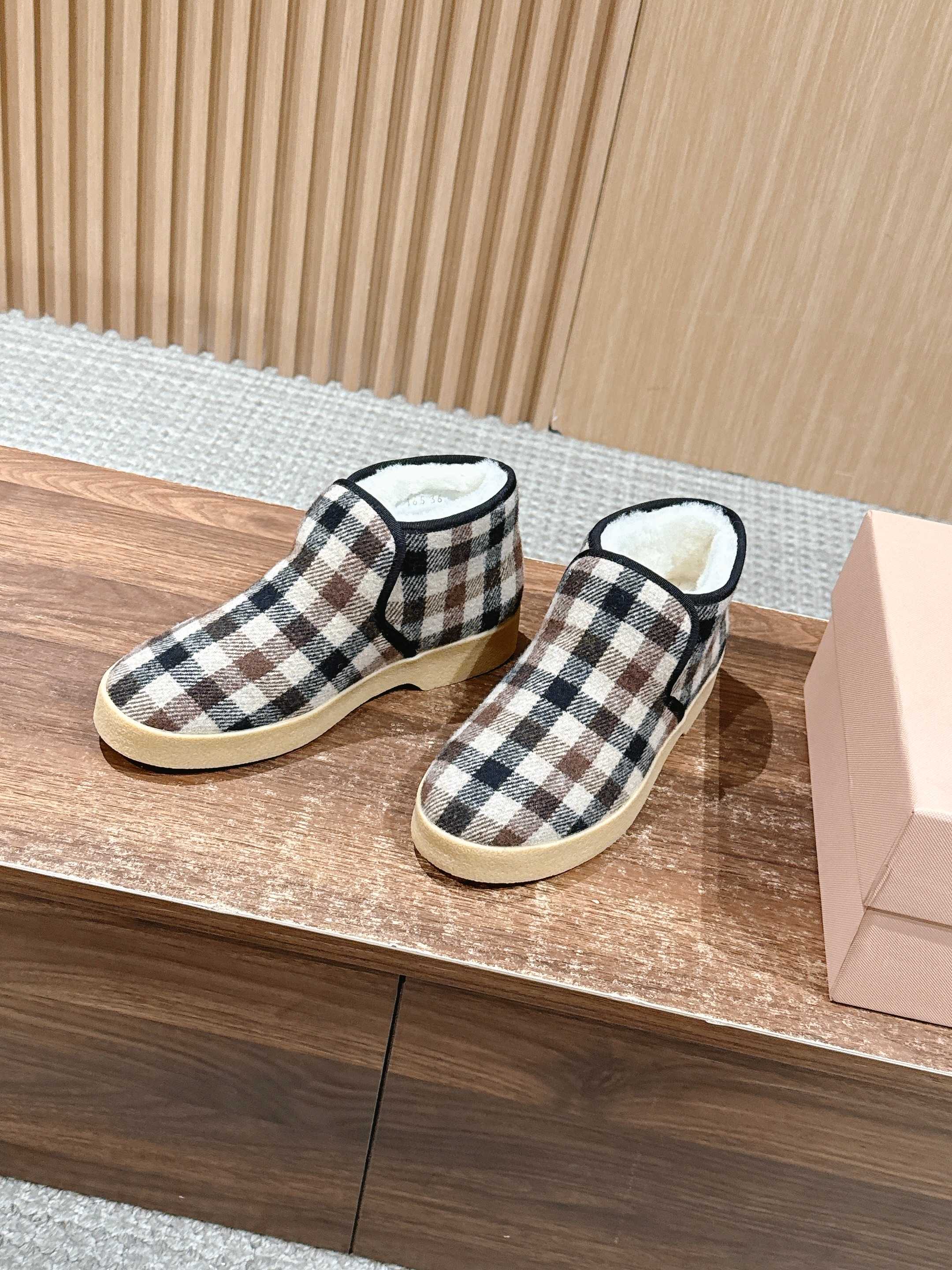 𝐌𝐈𝐔 𝐌𝐈𝐔# 缪缪秋冬复古保暖厚底雪地靴短靴 包跟设计能裹住脚踝,内里是厚实的毛绒材质,像给脚裹了层“小被子”,冬天能牢牢锁住热量,避免脚后跟受凉。鞋面用的软质面料,触感柔软亲肤;鞋底又轻又有弹性,踩上去像“踩在云朵上”,走路没负担,长时间穿也不累。 部分款式是一体成型工艺,不容易开胶脱线,能穿得更久;鞋面是防水、防污面料,脏了一擦就干净,不用频繁清洗。经典格子图案+低饱和色系,风格复古又简约,能搭配各种家居服,甚至短暂外出。 材质:高丝光牛反绒 内里:羊毛 大底:橡胶大底 增高:3.5cm size:35-40码(40码定制不退换)