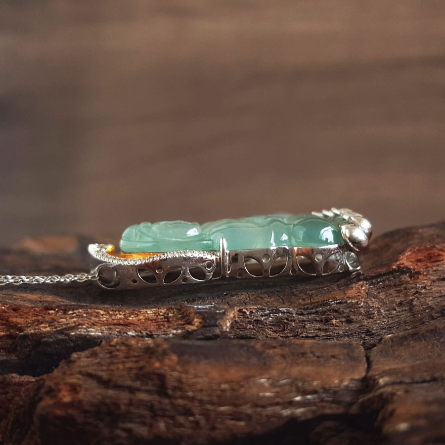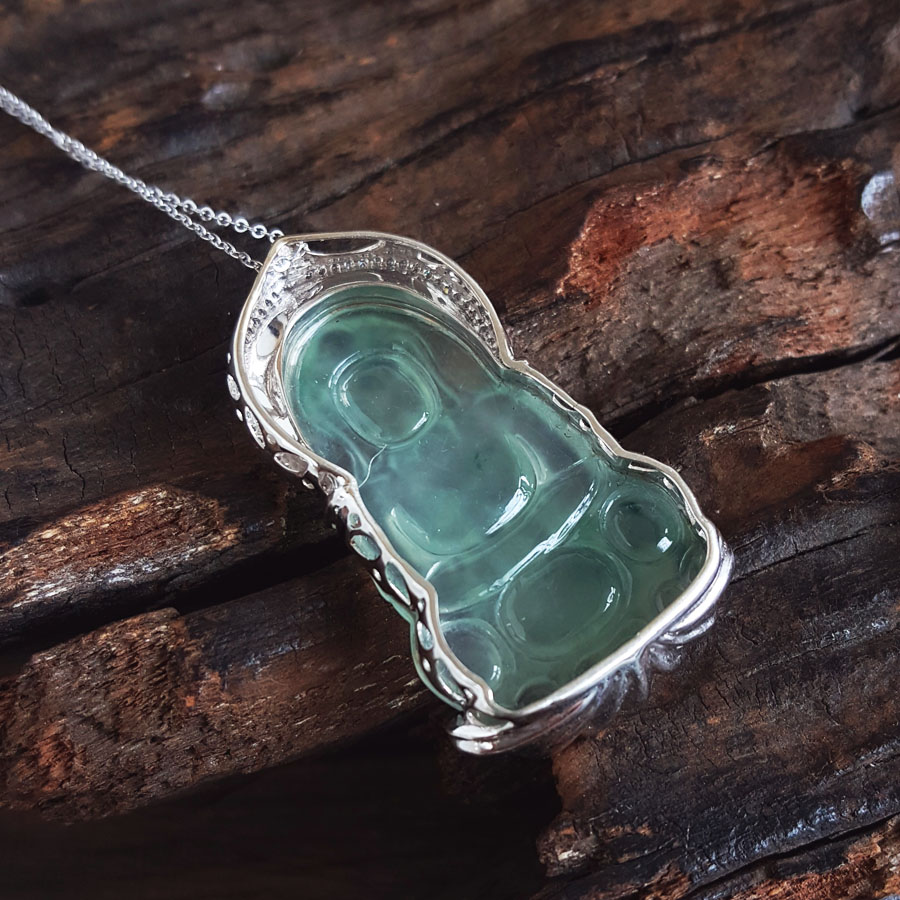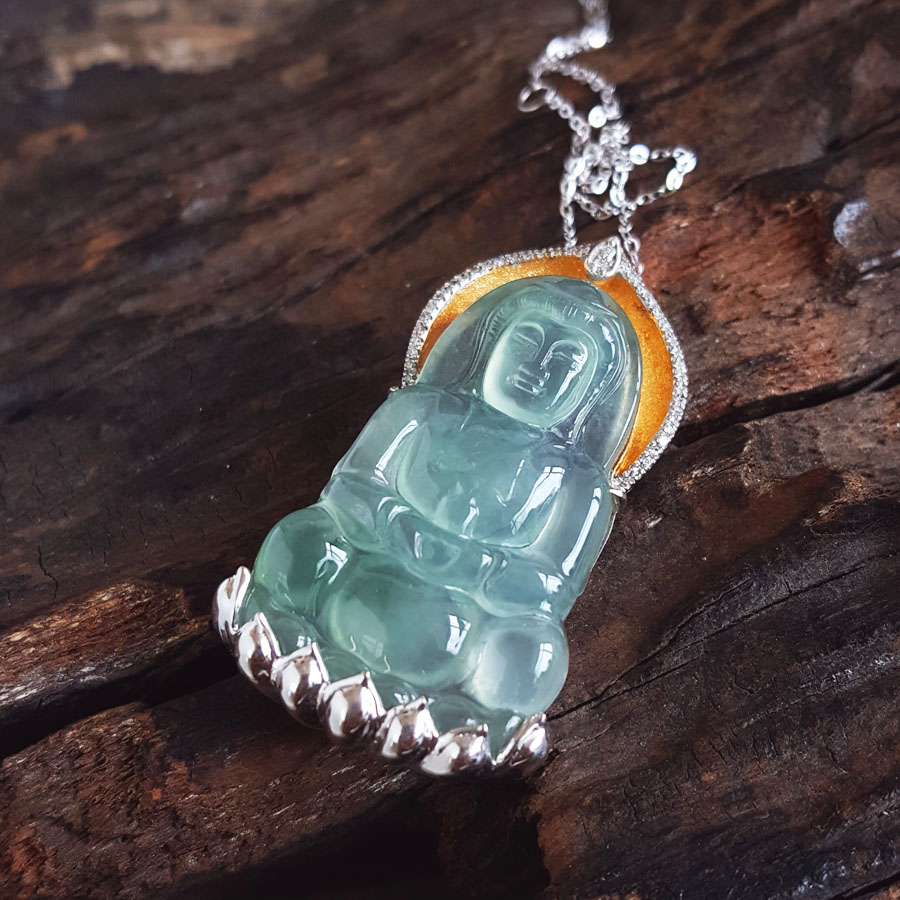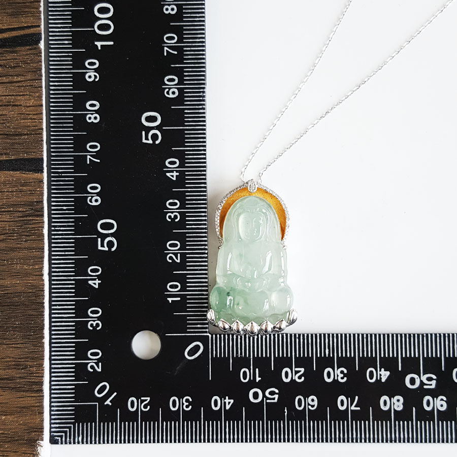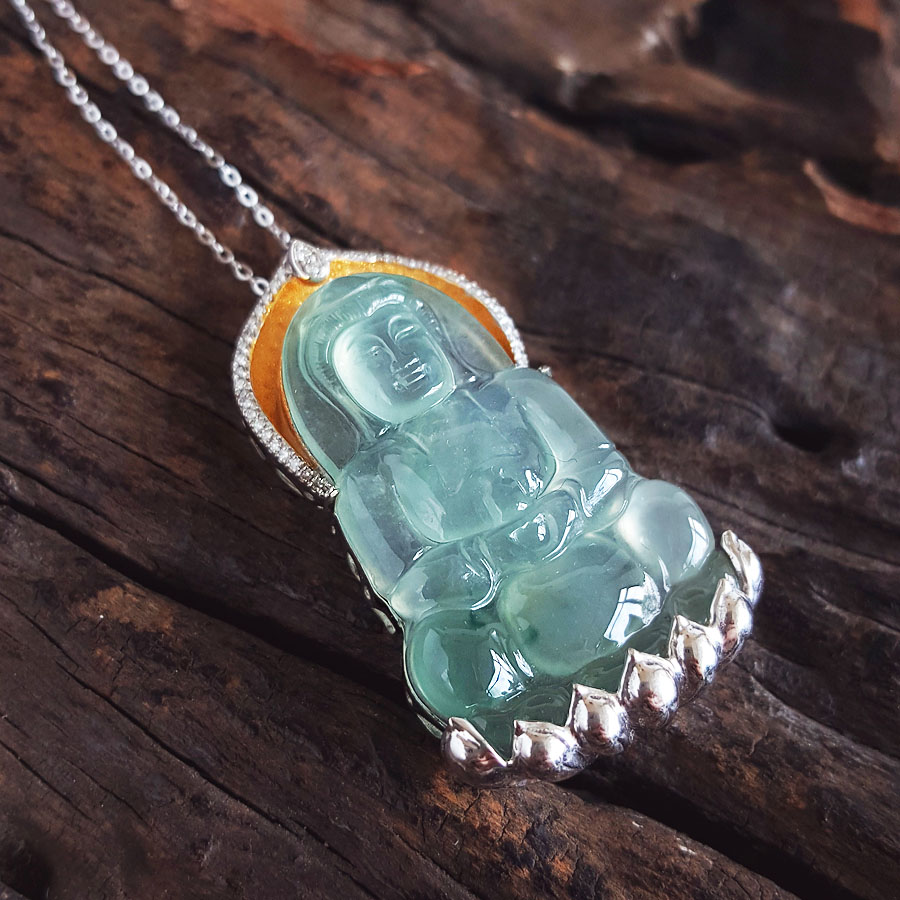 名称 | AU750收藏级双色金镶钻镶天然细腻高冰种飘蓝花观音坐莲(平安安乐)翡翠吊坠项链 |