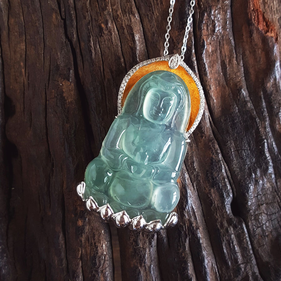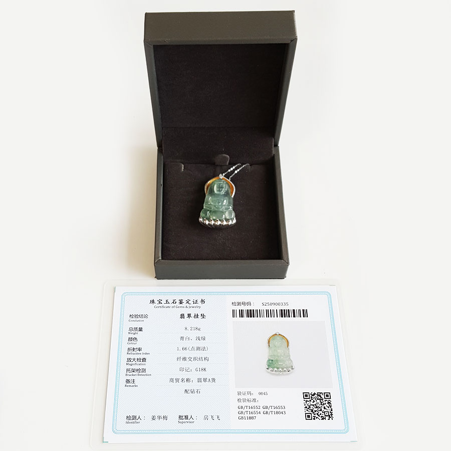 【天然正品】AU750收藏级双色金镶钻镶天然细腻高冰种飘蓝花观音坐莲(平安安乐)翡翠吊坠项链160925XY18 现售价:9380