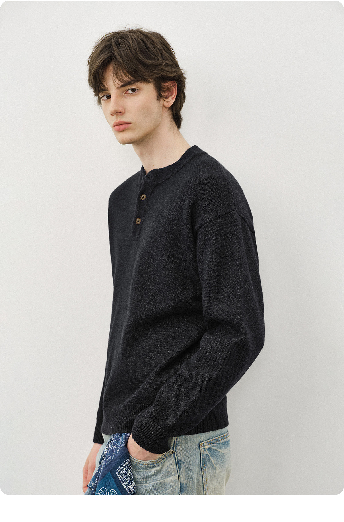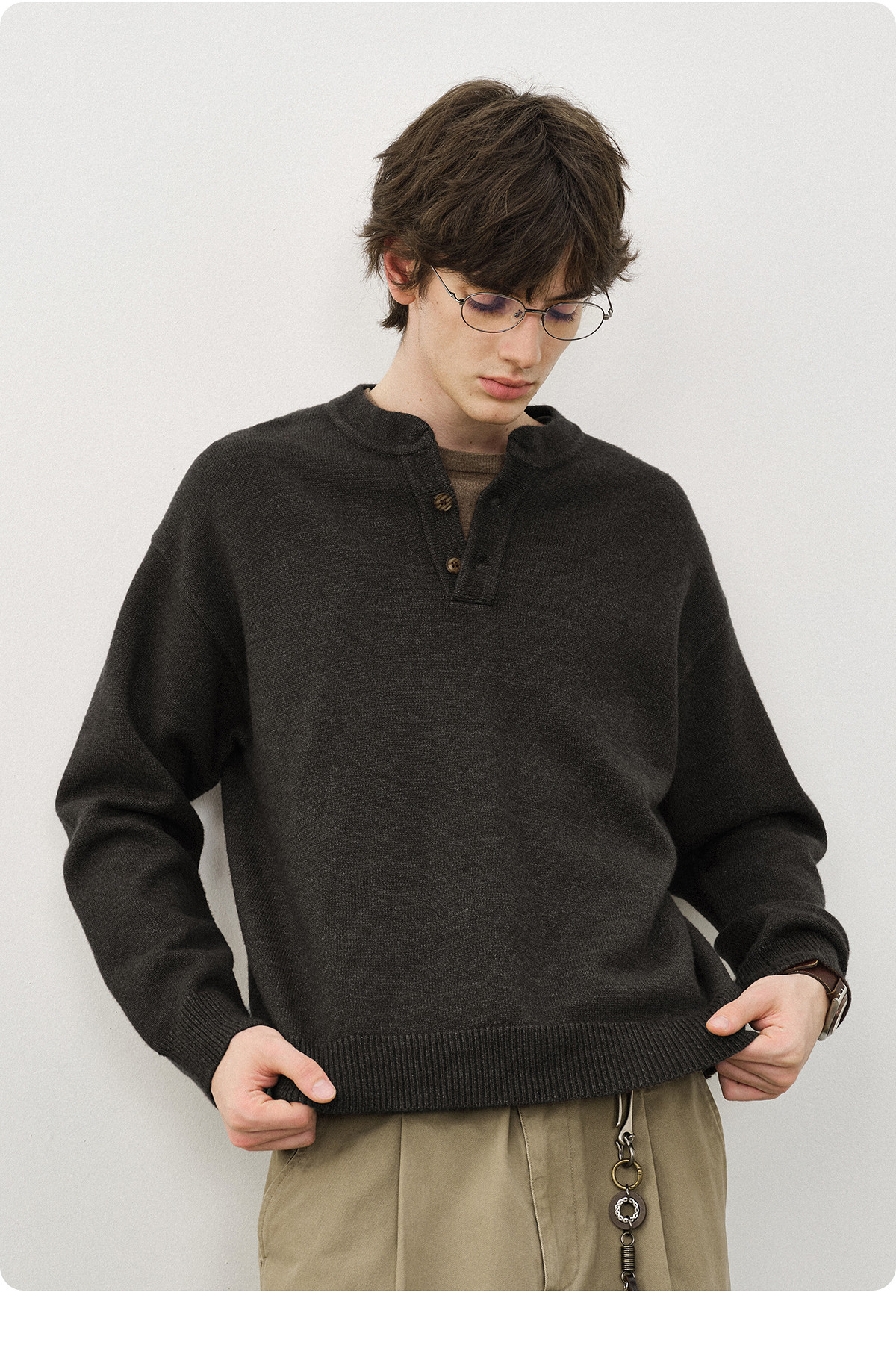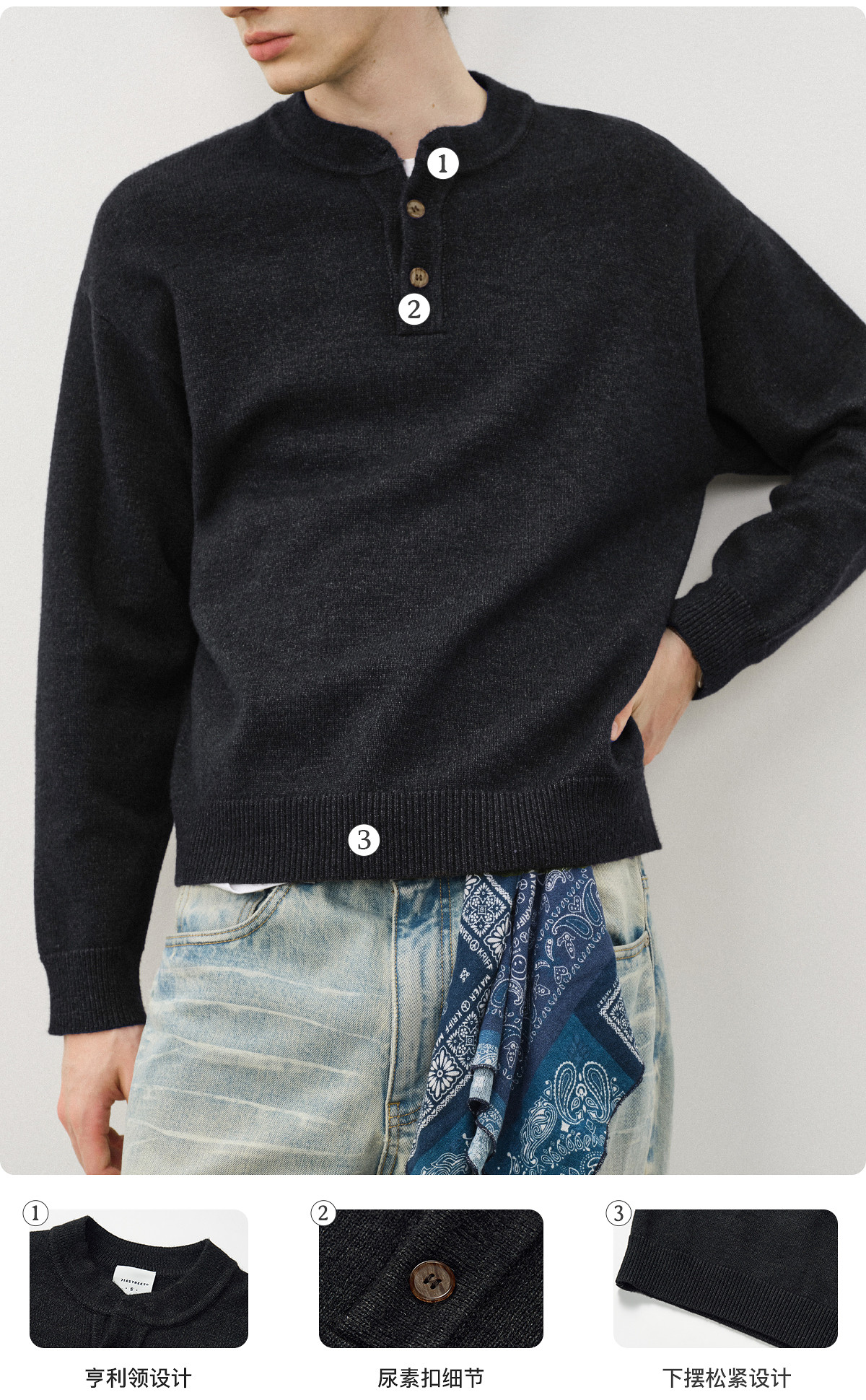 714street复古亨利领黑色毛衣男2025秋冬新款亲肤挺括合身针织衫