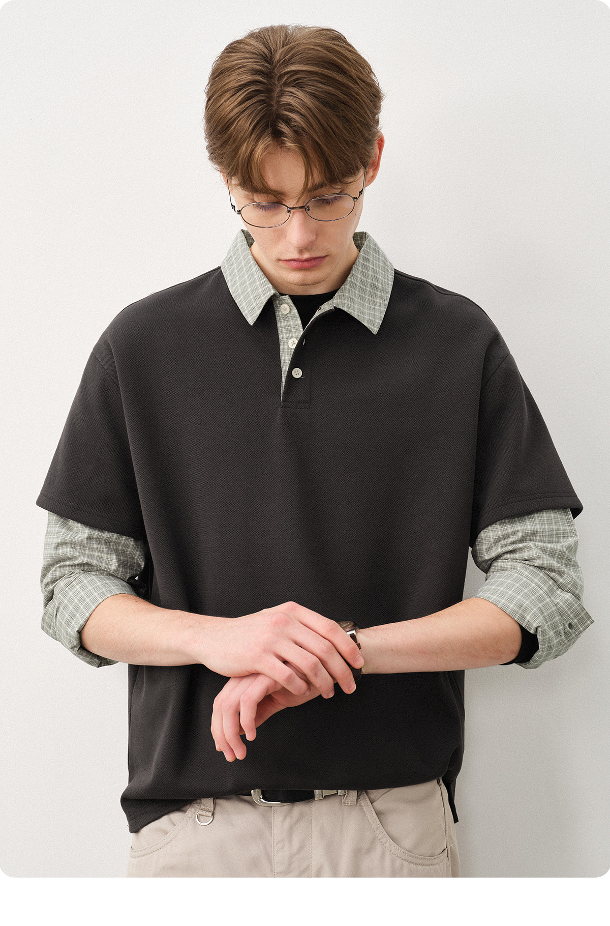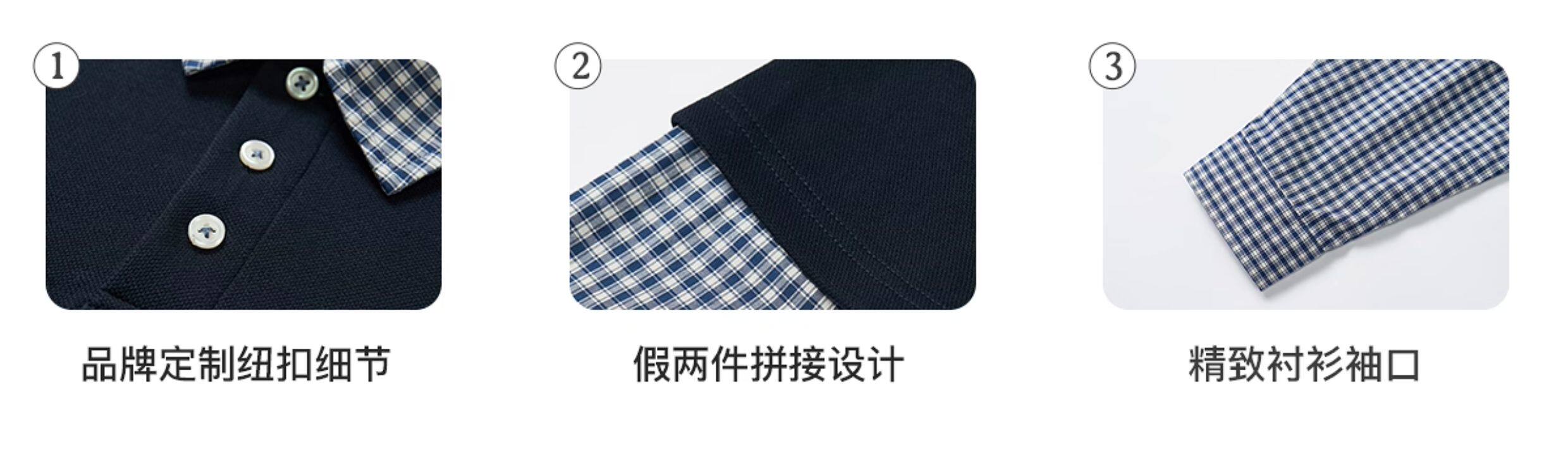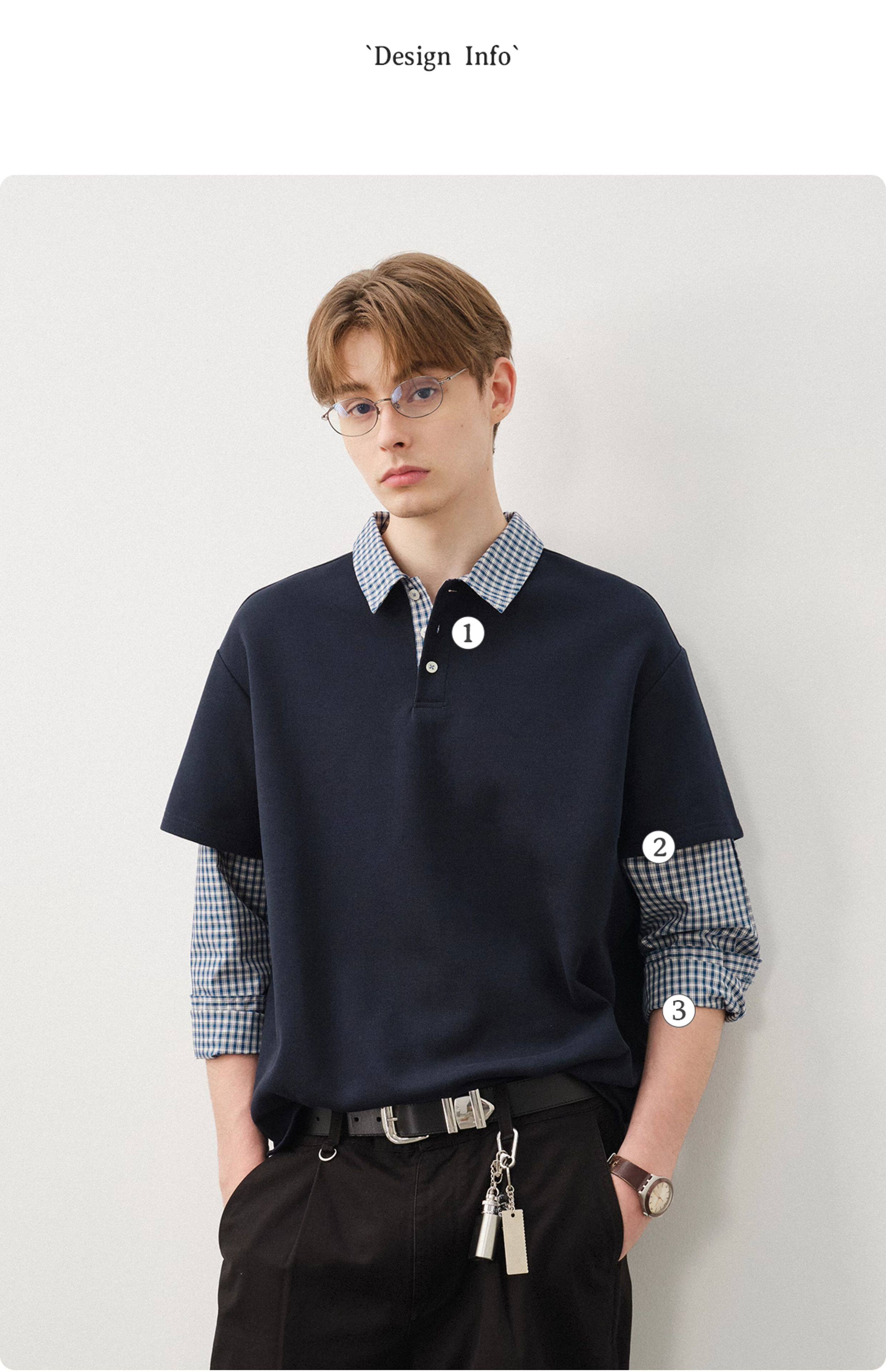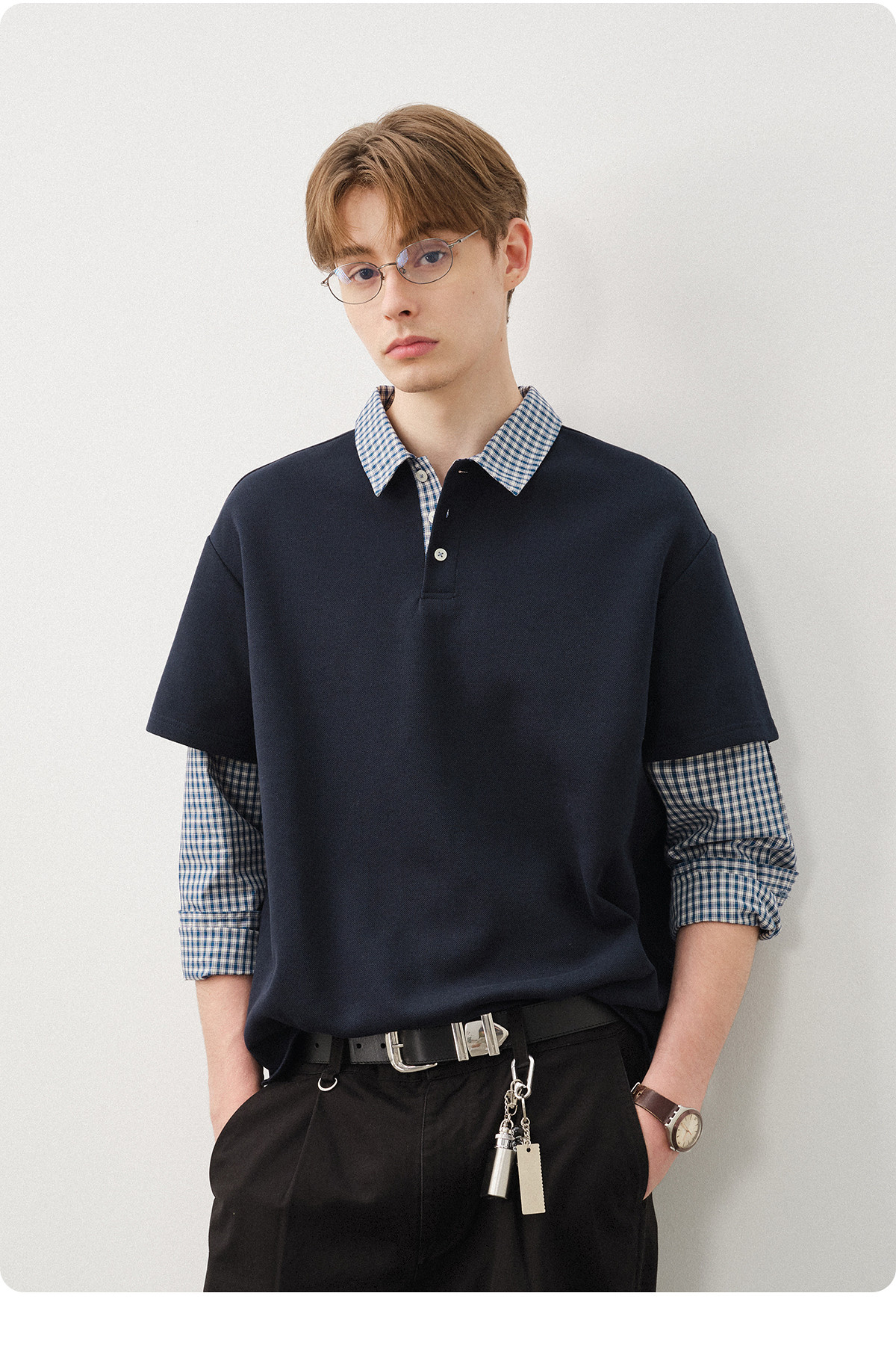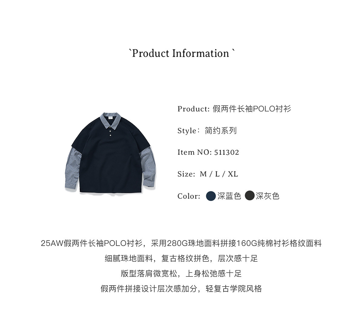 714street秋季假两件长袖POLO衬衫男2025纯棉休闲宽松针织杉衬衣