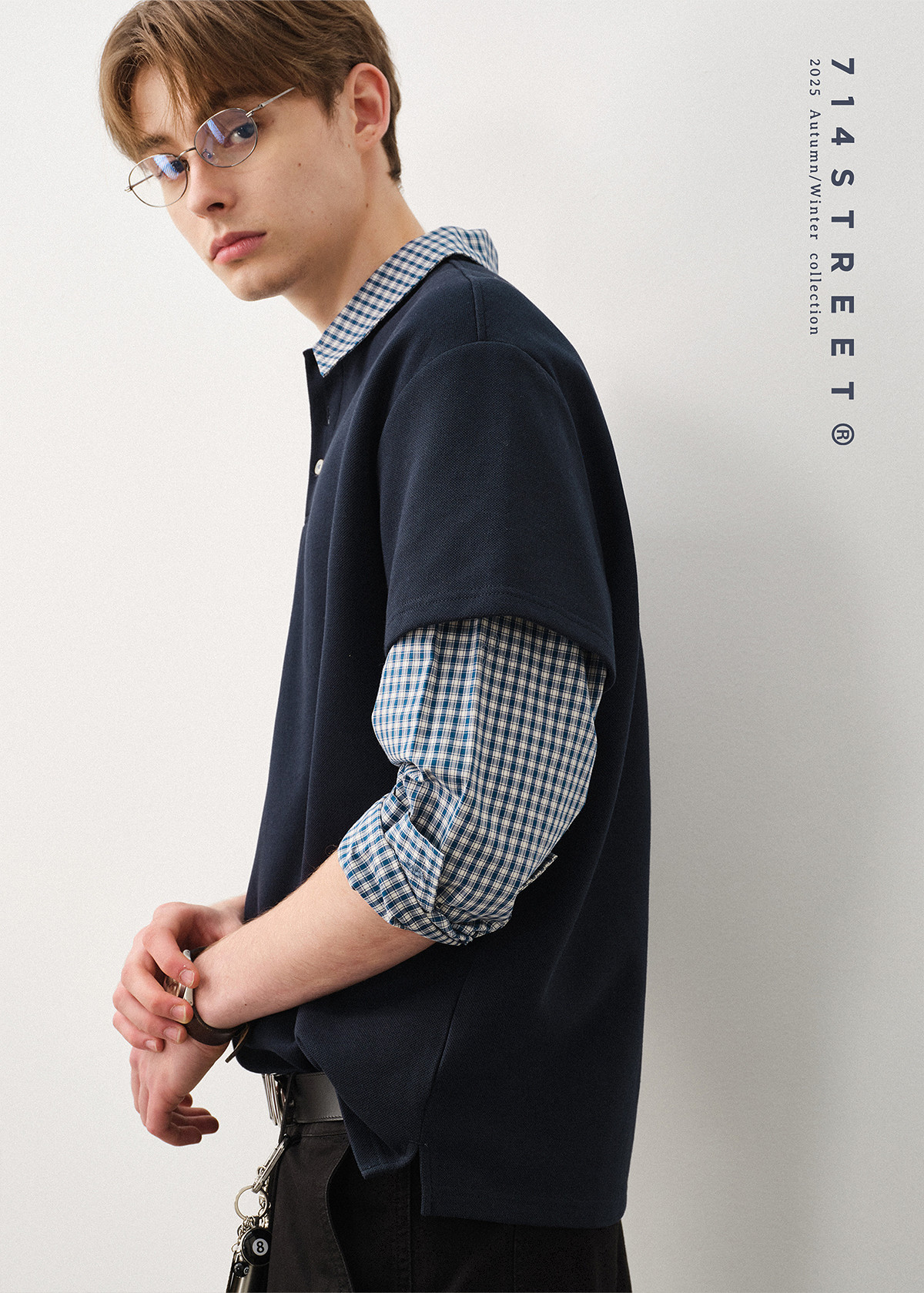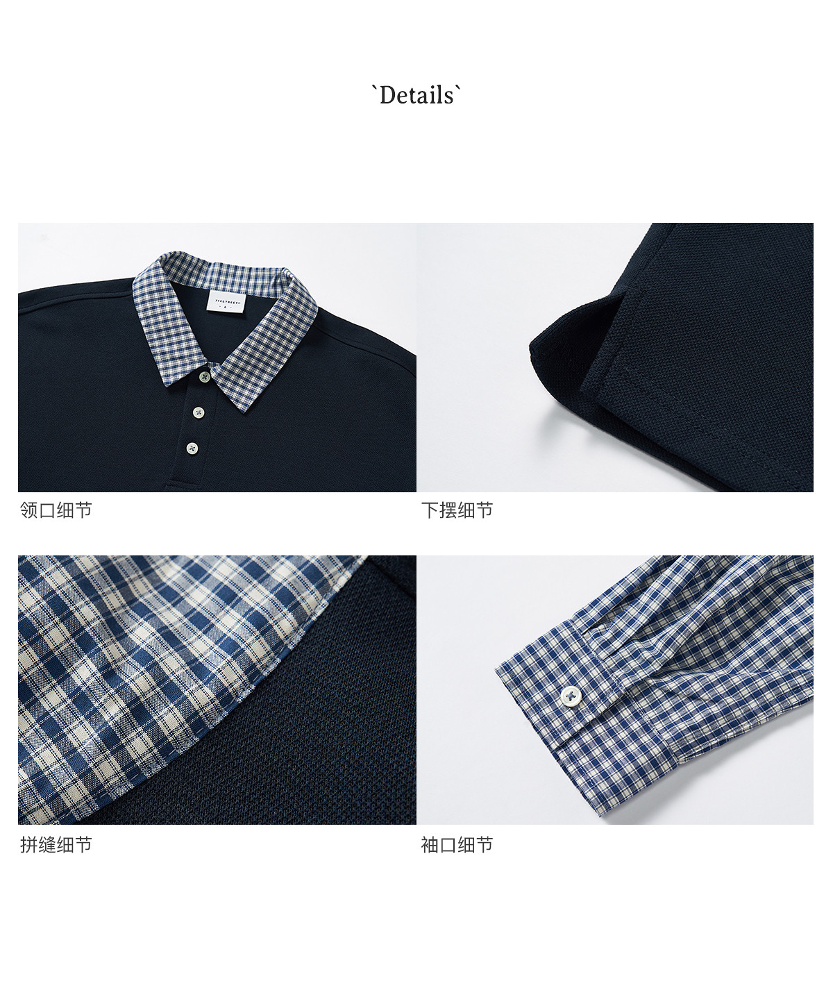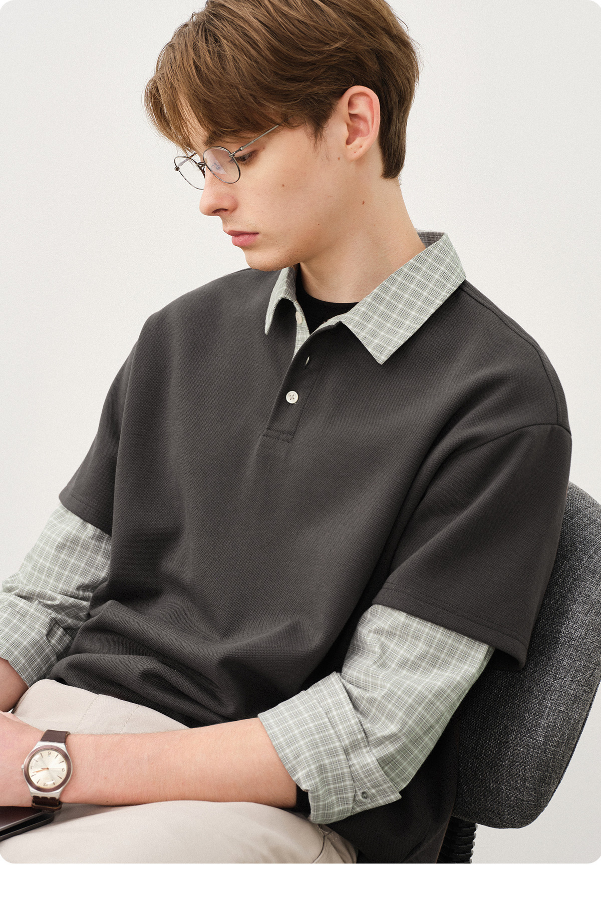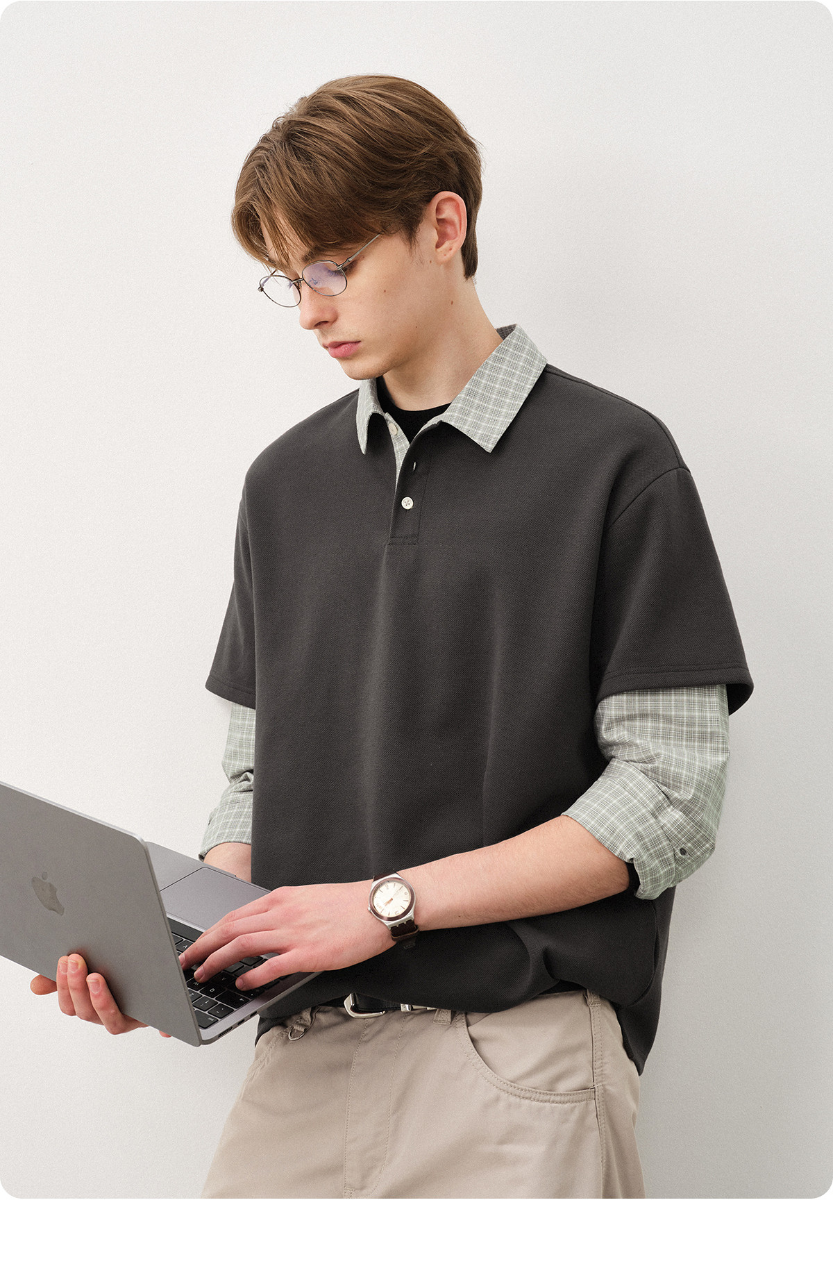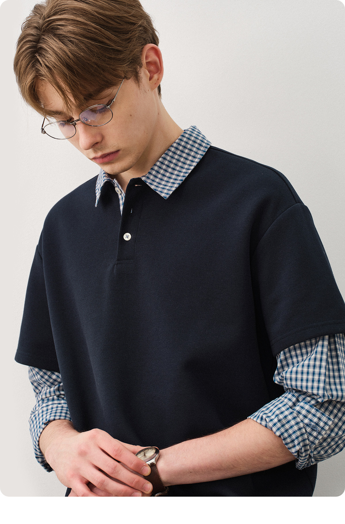 714street秋季假两件长袖POLO衬衫男2025纯棉休闲宽松针织杉衬衣
