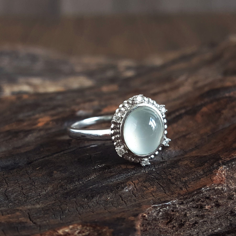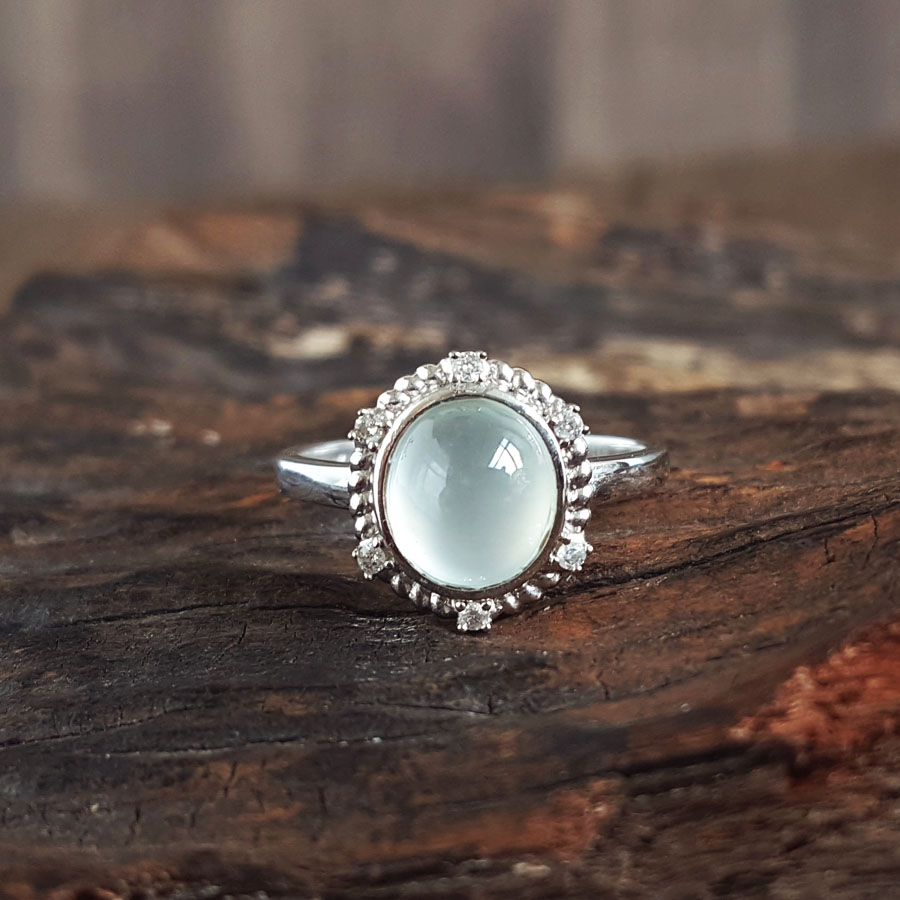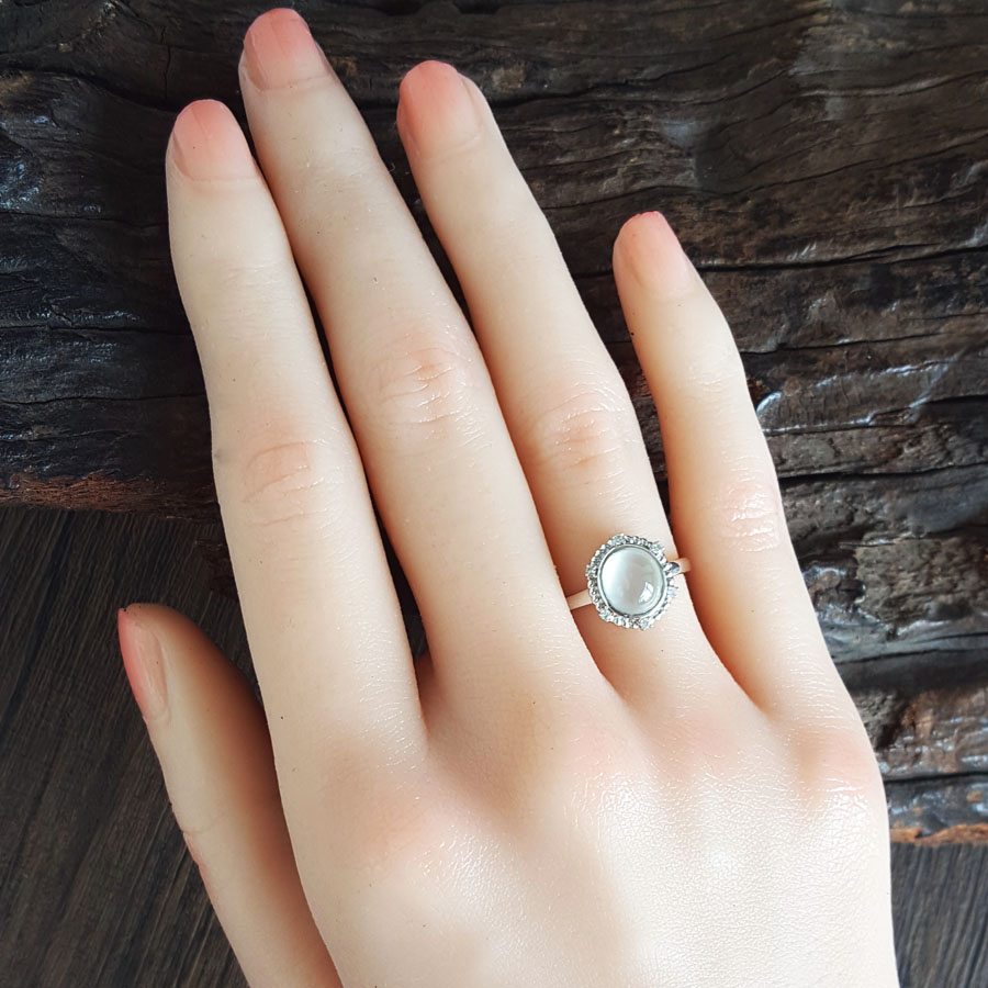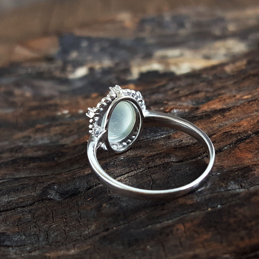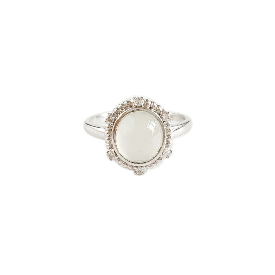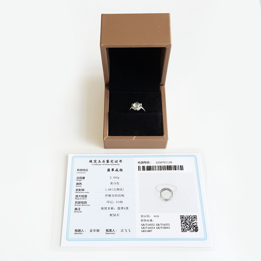 名称 | AU750白金镶钻镶天然细腻白色冰种蛋面翡翠戒指 |