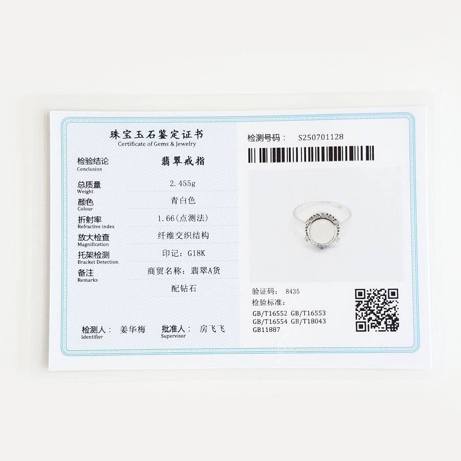 【天然正品】A货翡翠AU750白金镶钻镶天然细腻白色冰种蛋面翡翠戒指9.4*7.7MM(皆取最大值)戒圈:10号(戒圈可改)女士现售价:2680!310325AH49