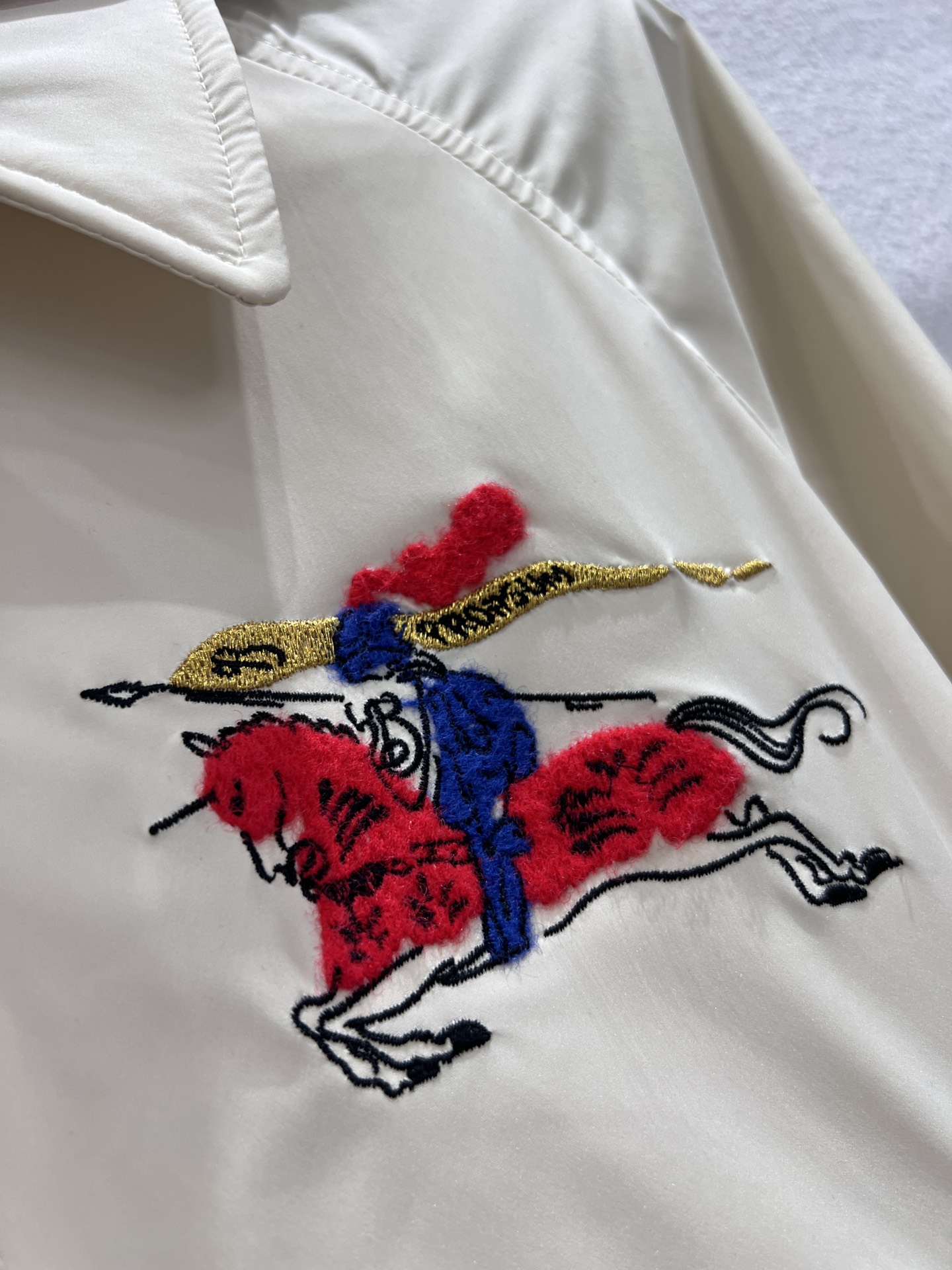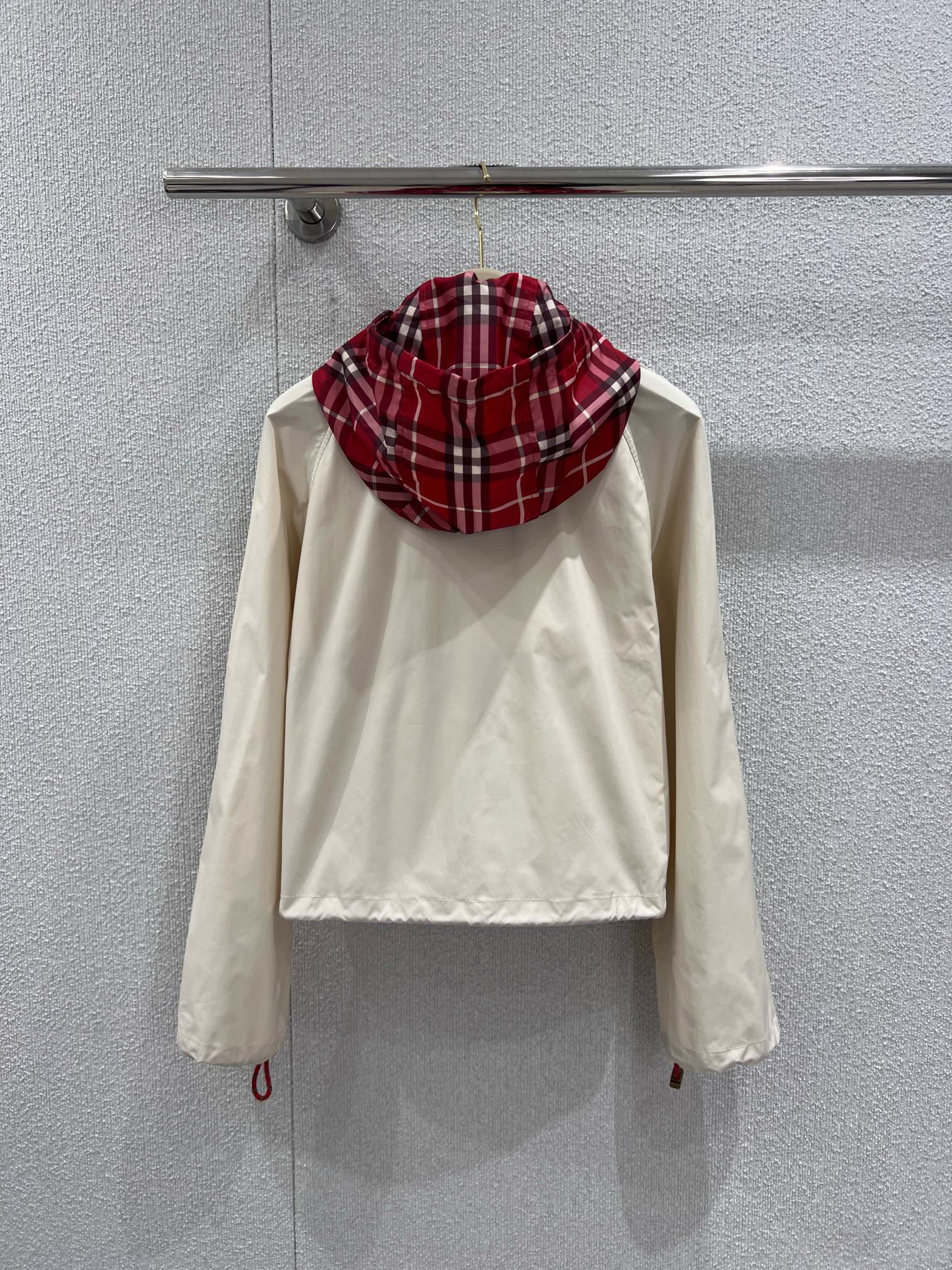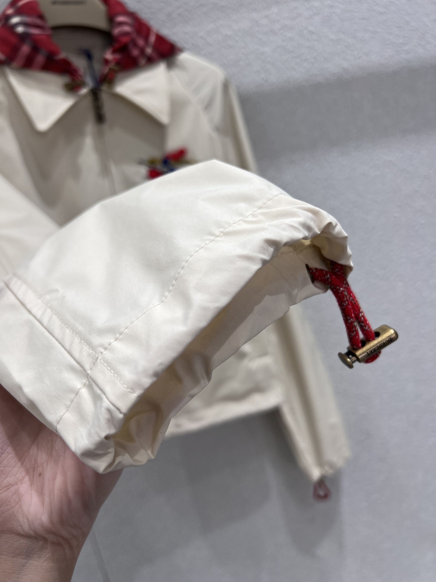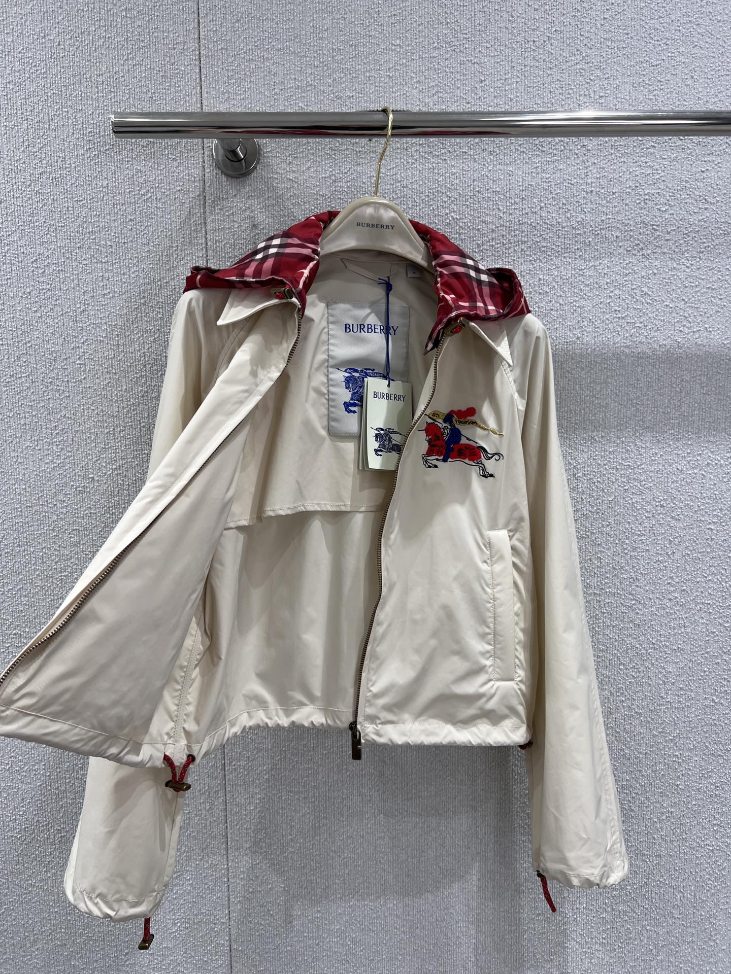 26Ss早春新禧贺岁系列 连帽短款外套丨⚠独家yb开发!高版出品!以米白基底承载英伦基因。标志性战马刺绣跃于左胸,红黑格纹连帽内衬暗藏经典细节,抽绳收摆与松紧袖口利落勾勒身形。轻量防风面料兼顾春日灵动与实用,无论是搭配同系列针织衫还是牛仔单品,都能在日常与场合间自如切换,是新岁衣橱里兼具仪式感与实穿性的点睛之笔。现货发售S/M/L