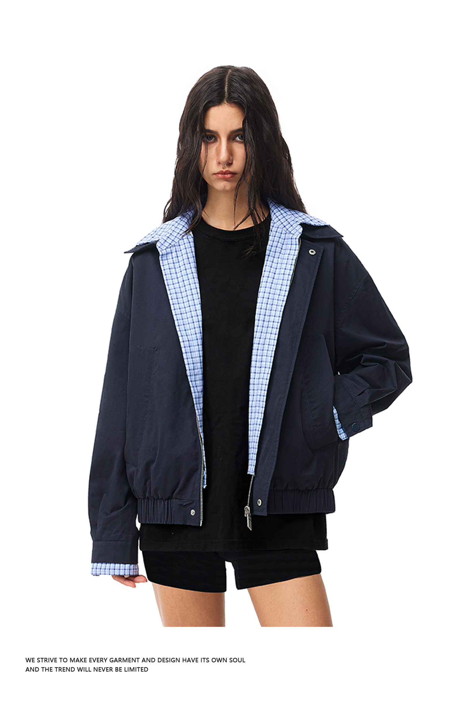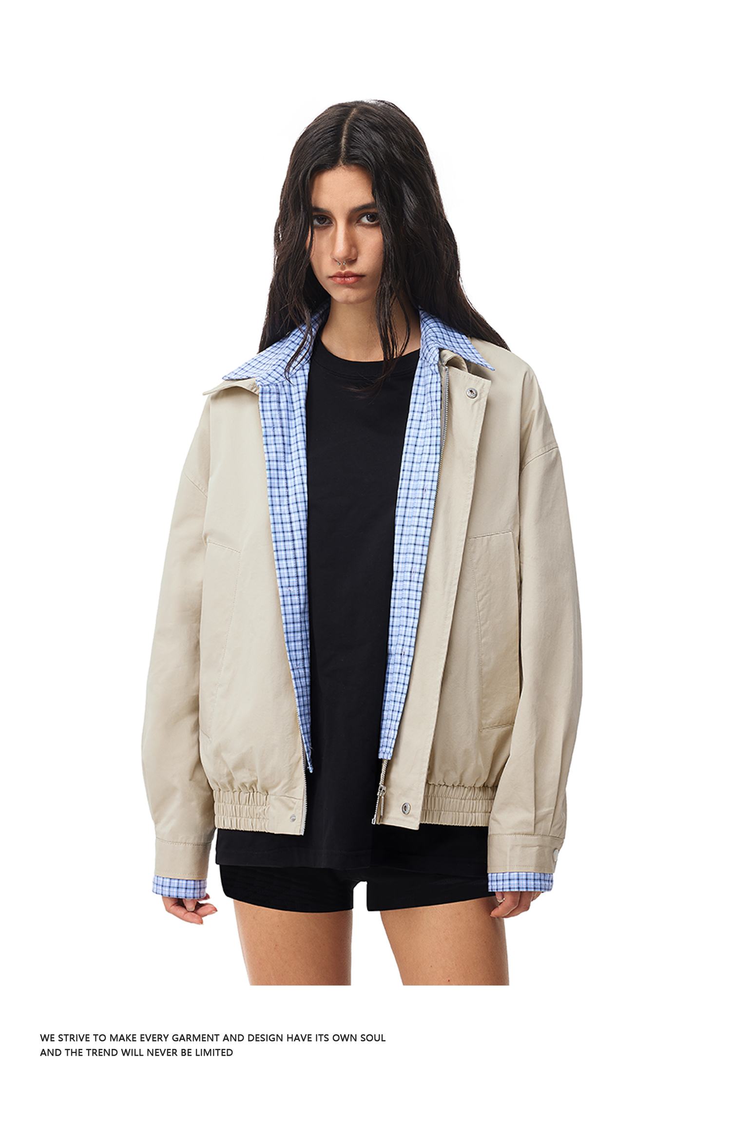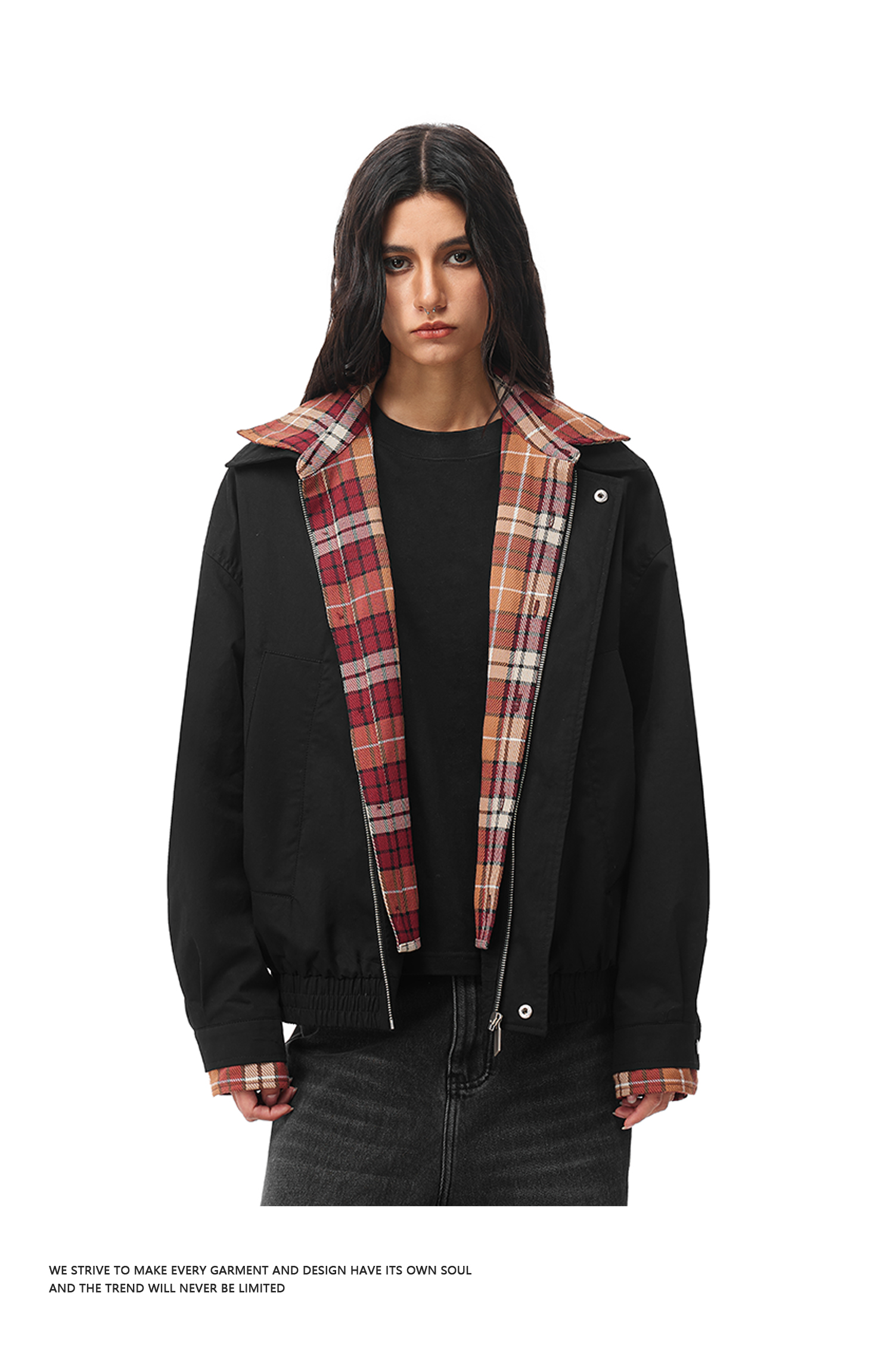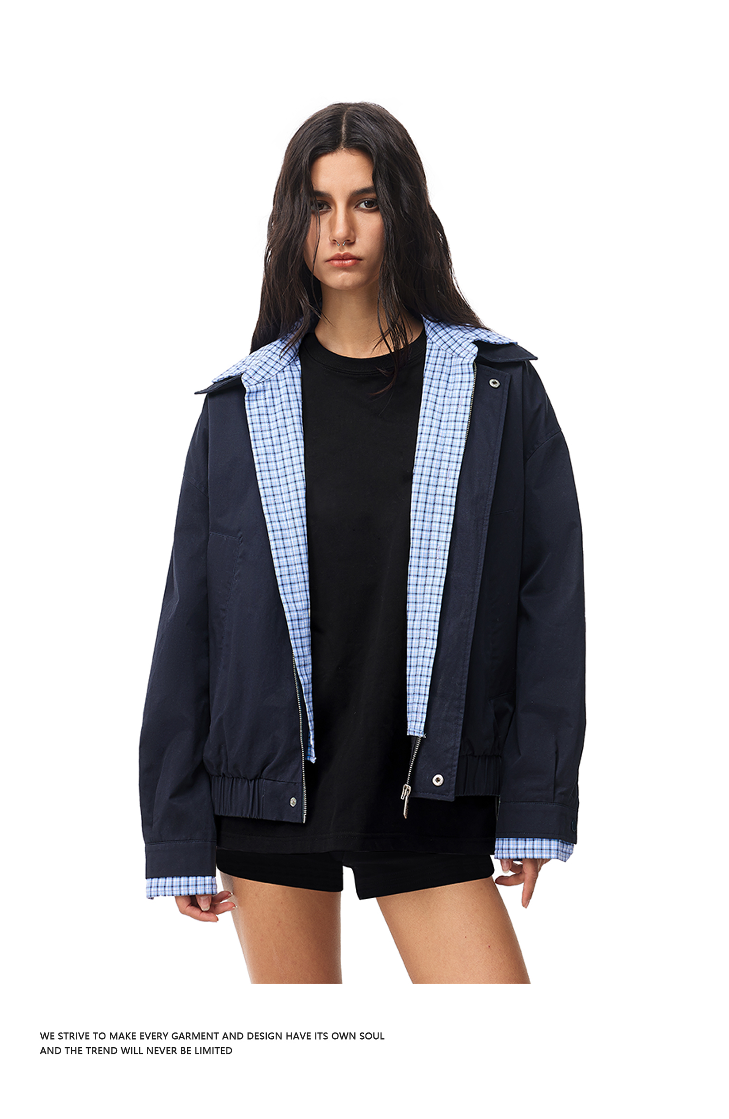 FDR官方店 撞色拼接格子假两件夹克外套男女春季翻领情侣开衫上衣