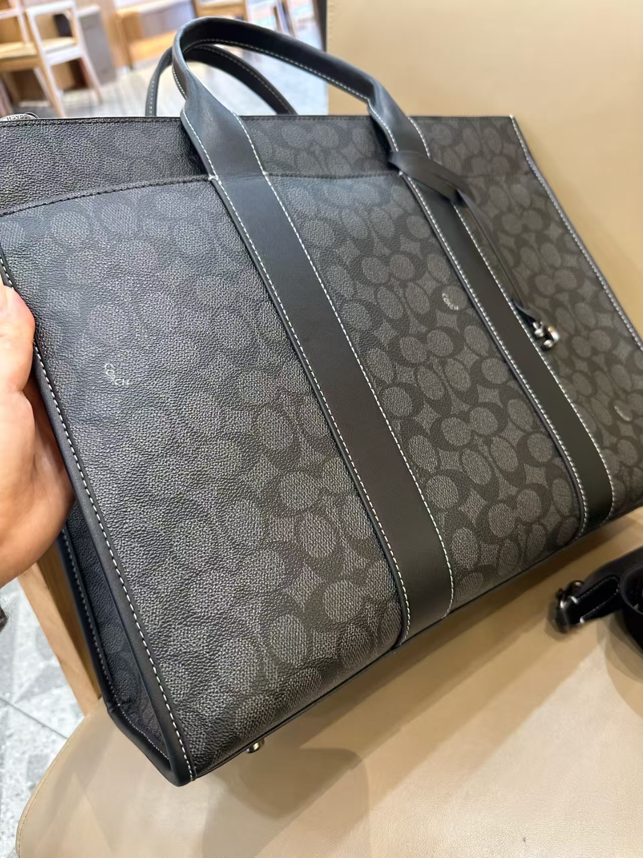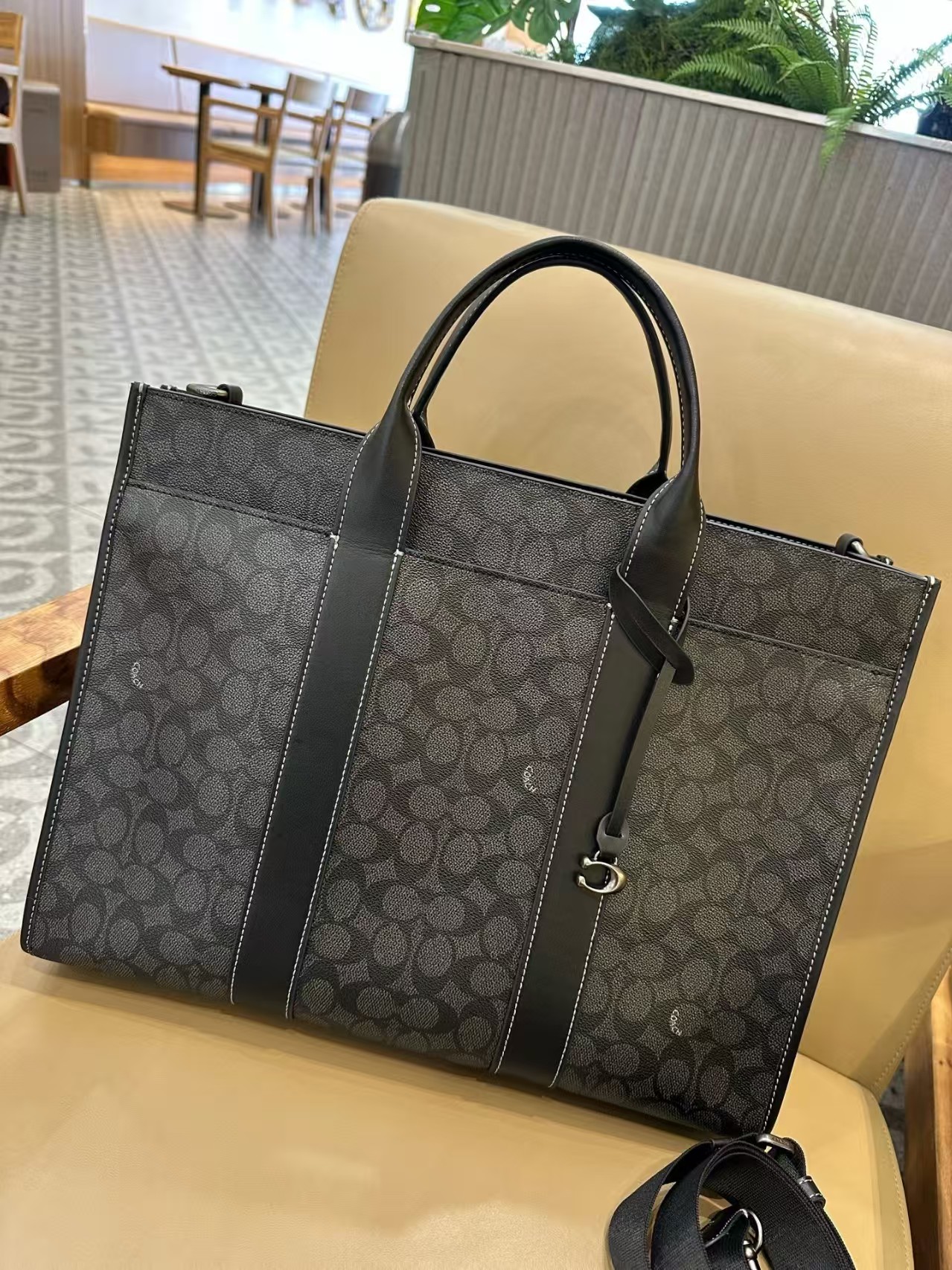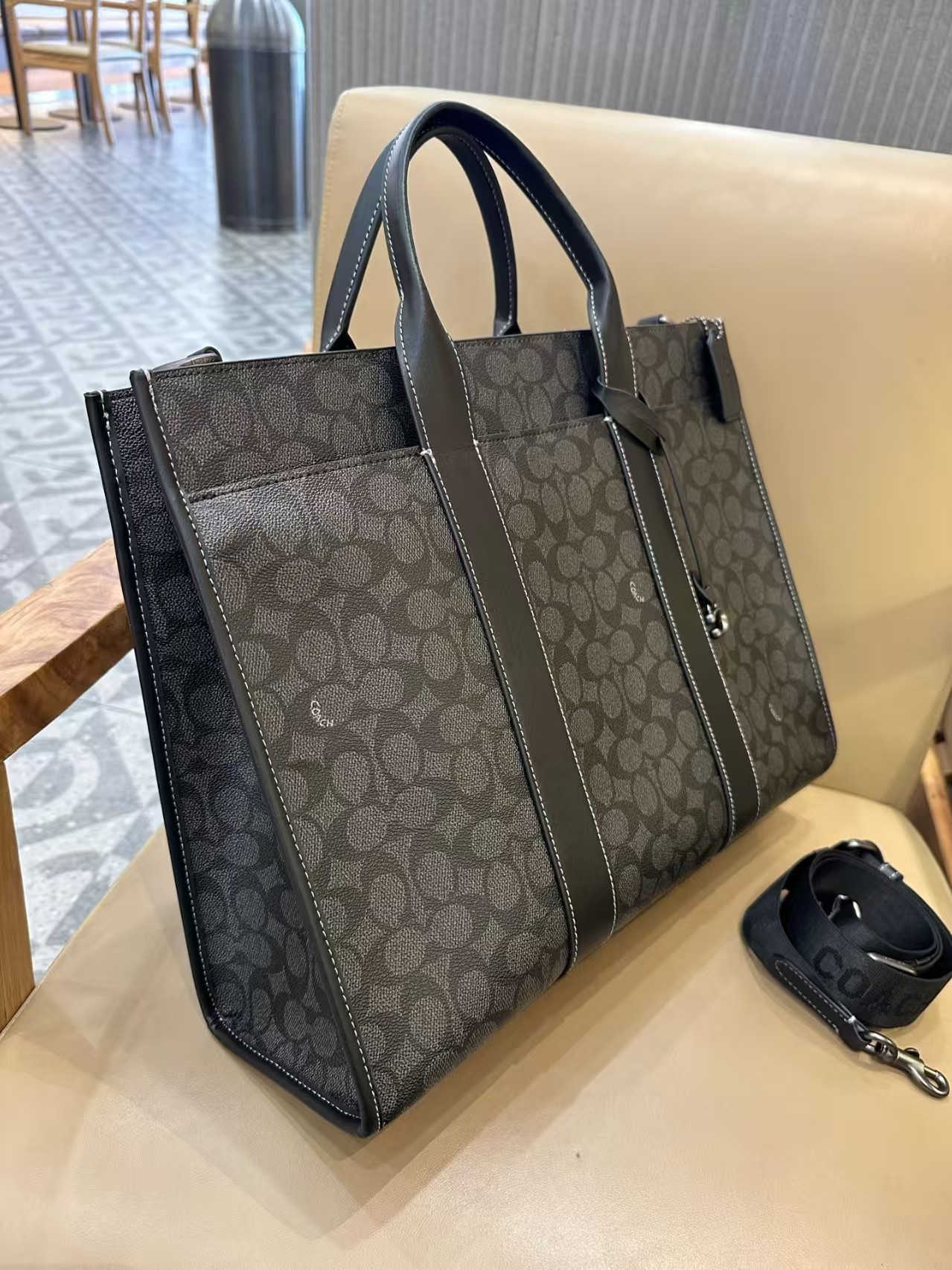 COACH蔻驰 Wesley 41 品牌徽标拉链开合 人造革 托特包ote包购物袋单肩手提包 大号 男女同款情侣款 木炭灰色
