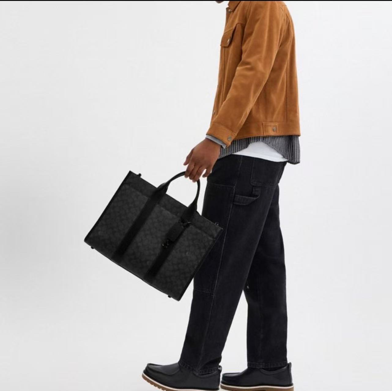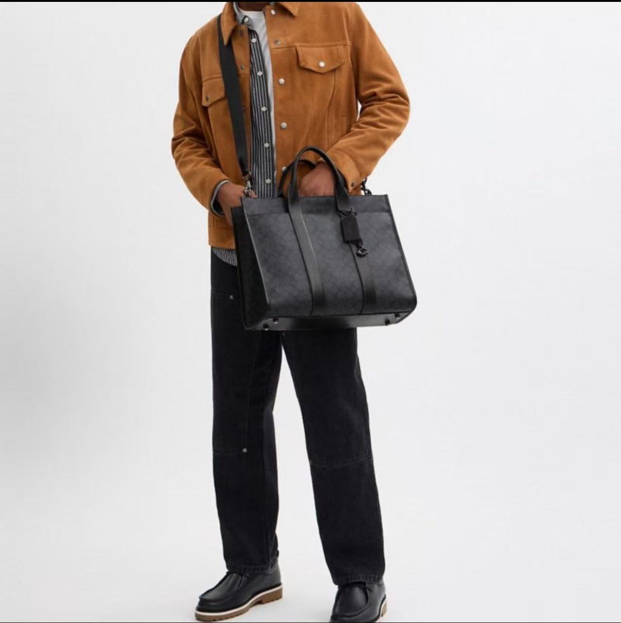 男士经典标志WESLEY托特包单肩包商务文件袋包,人造革配牛皮革,内置拉链袋,顶部拉链开合,织物衬里,垂直长度11cm手柄,外置磁扣袋垂直长度66cm可拆卸肩带,可肩背或斜挎,4个底部保护脚,可存放一台40cm笔记本,