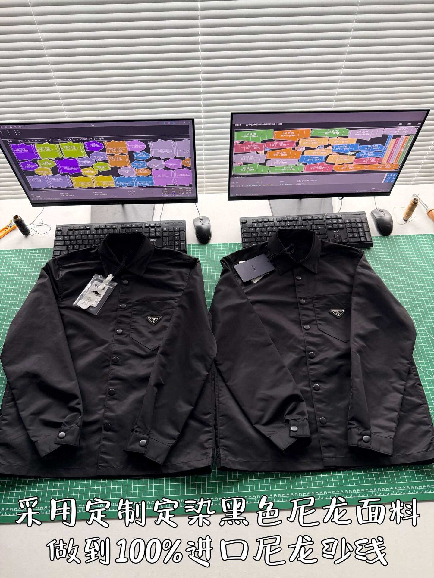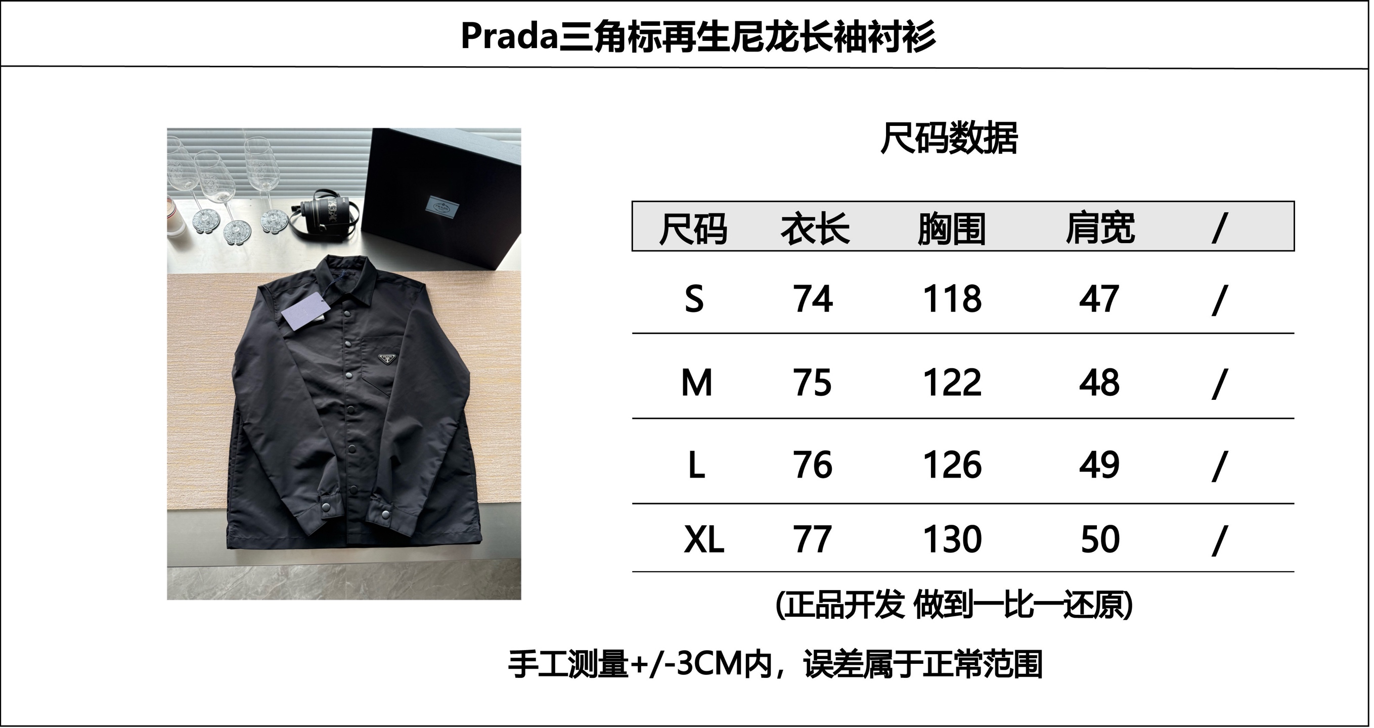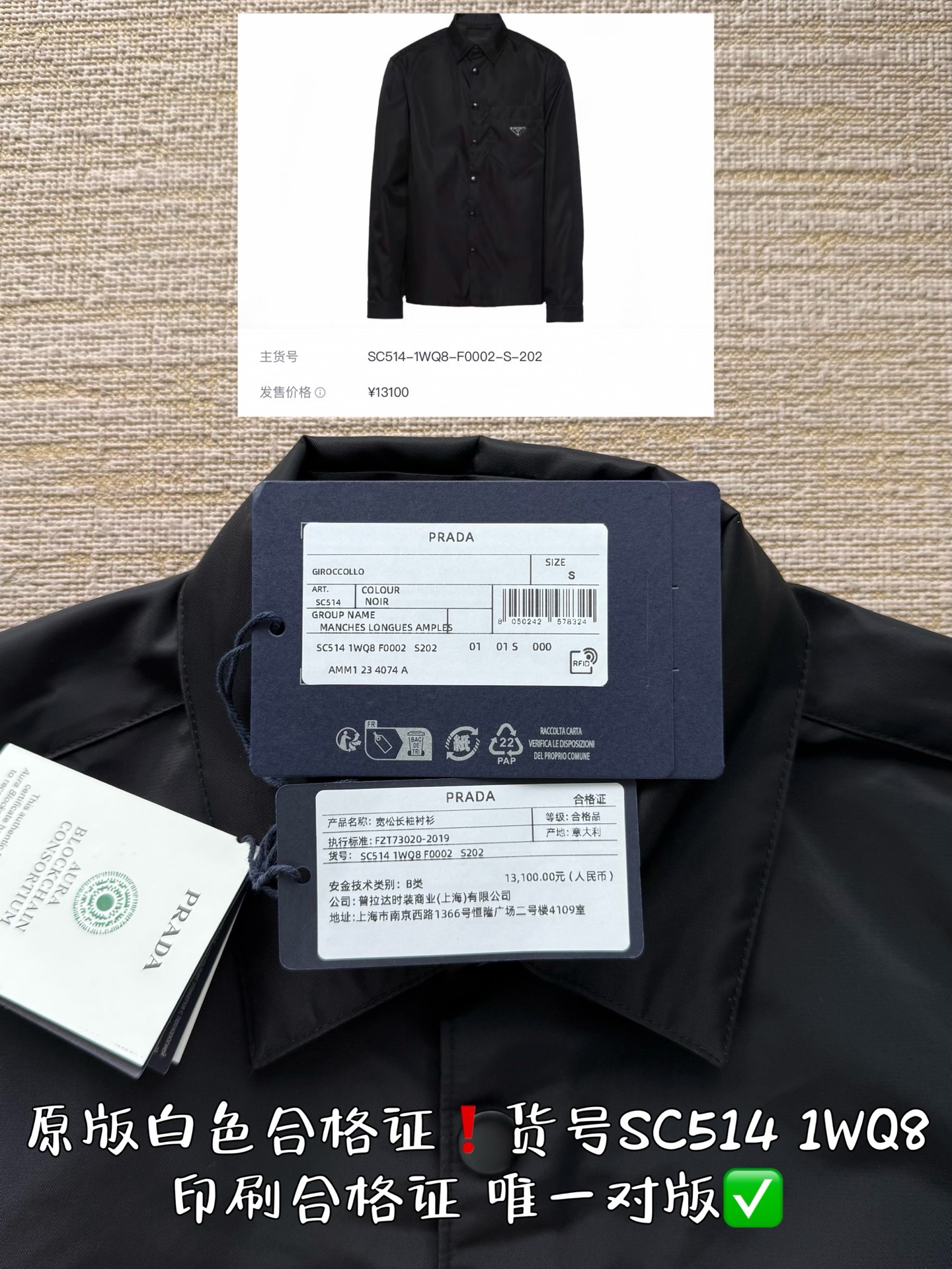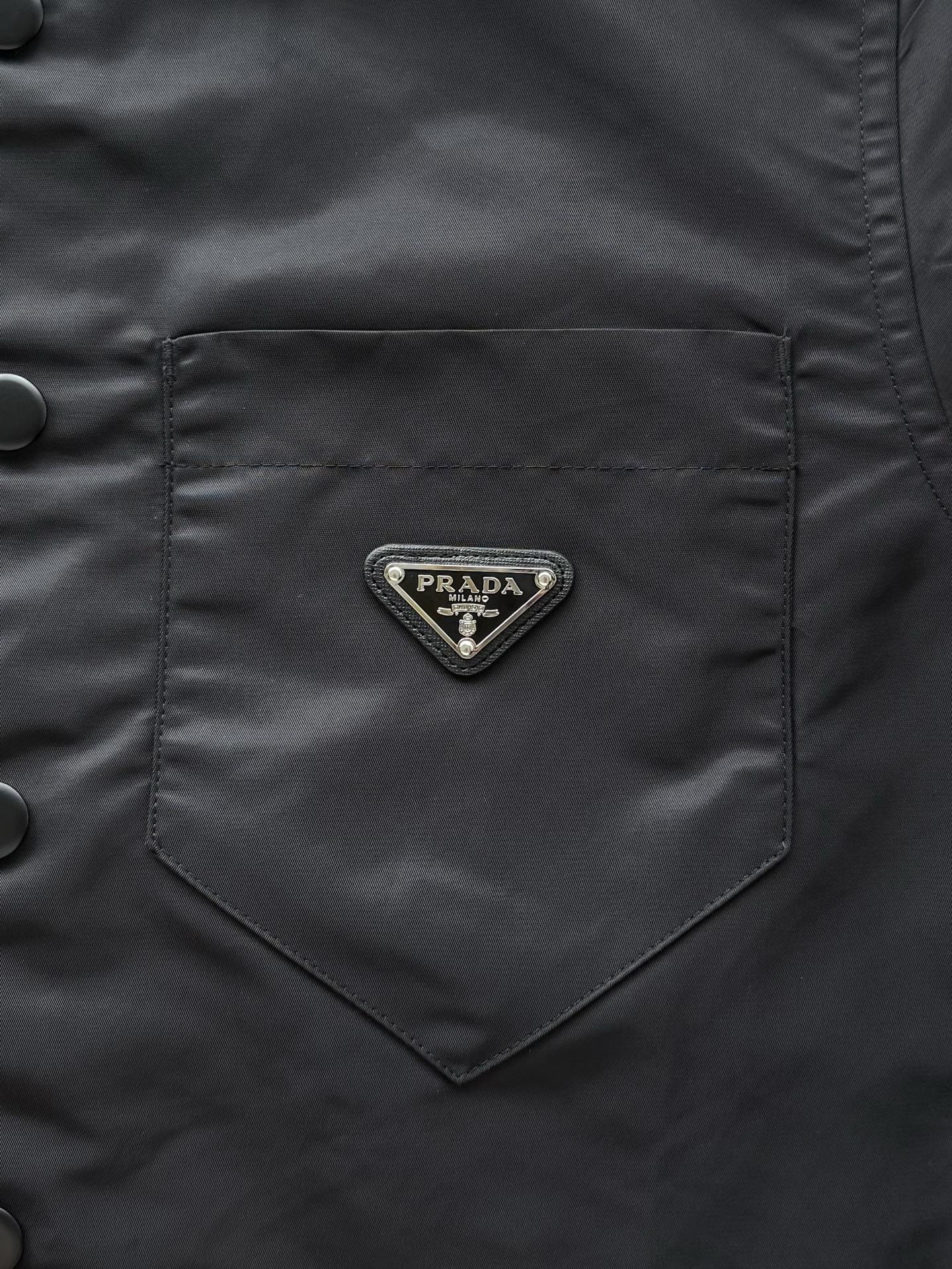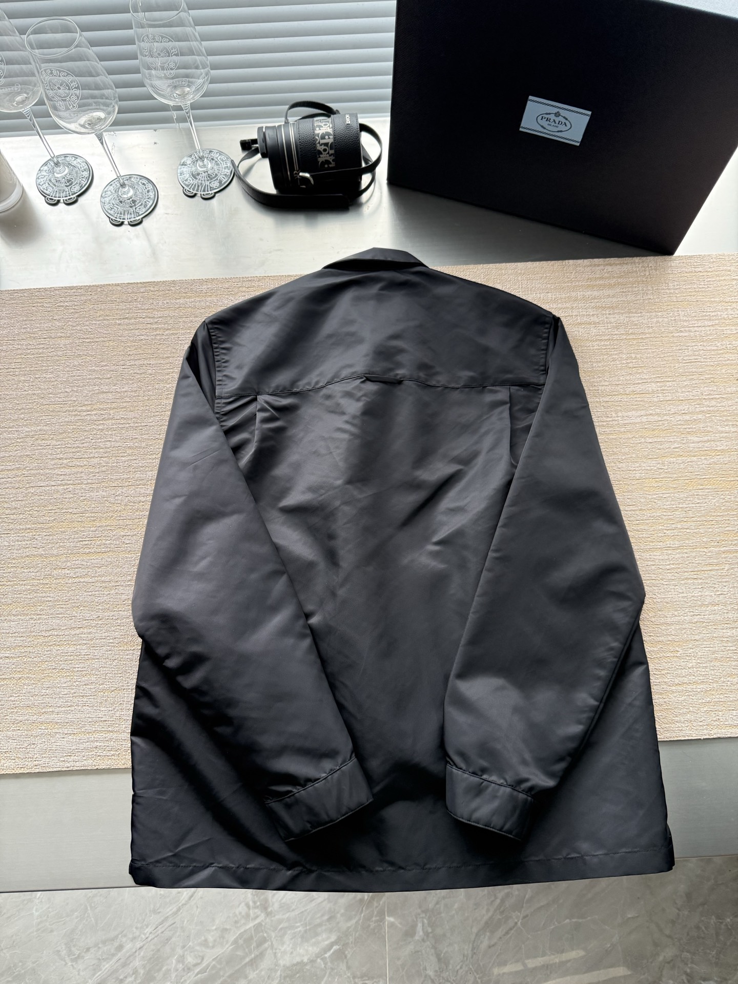 PRADA25FW三角标再生尼龙长袖衬衫‼️整件衣服13100购买ZP拆解打造,定制黑色再生尼龙面料,胸前贴袋设计,饰以三角标字母标识徽章,门襟 袖口开模定制纯色电镀五金纽扣,真正做到1:1copy 闭眼入 码数:S M L XL