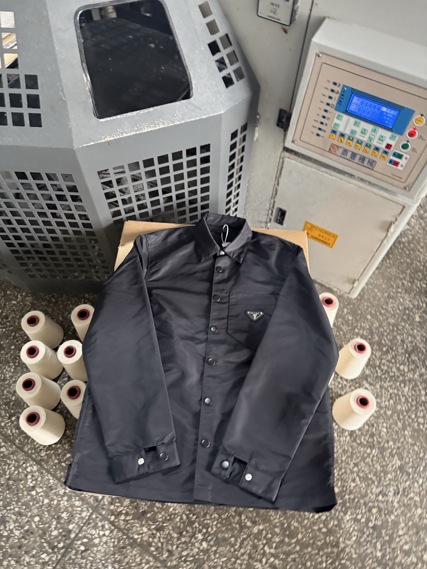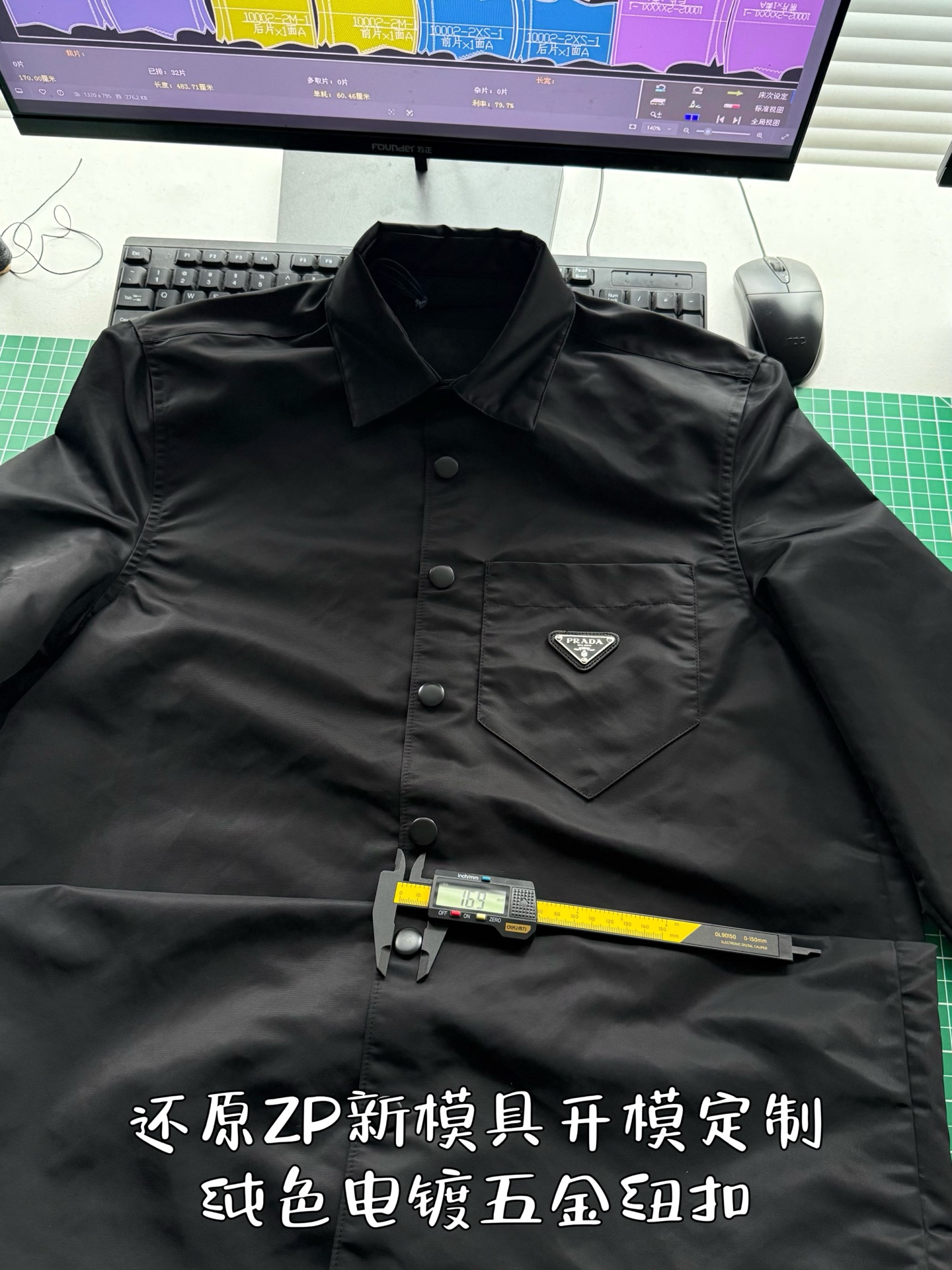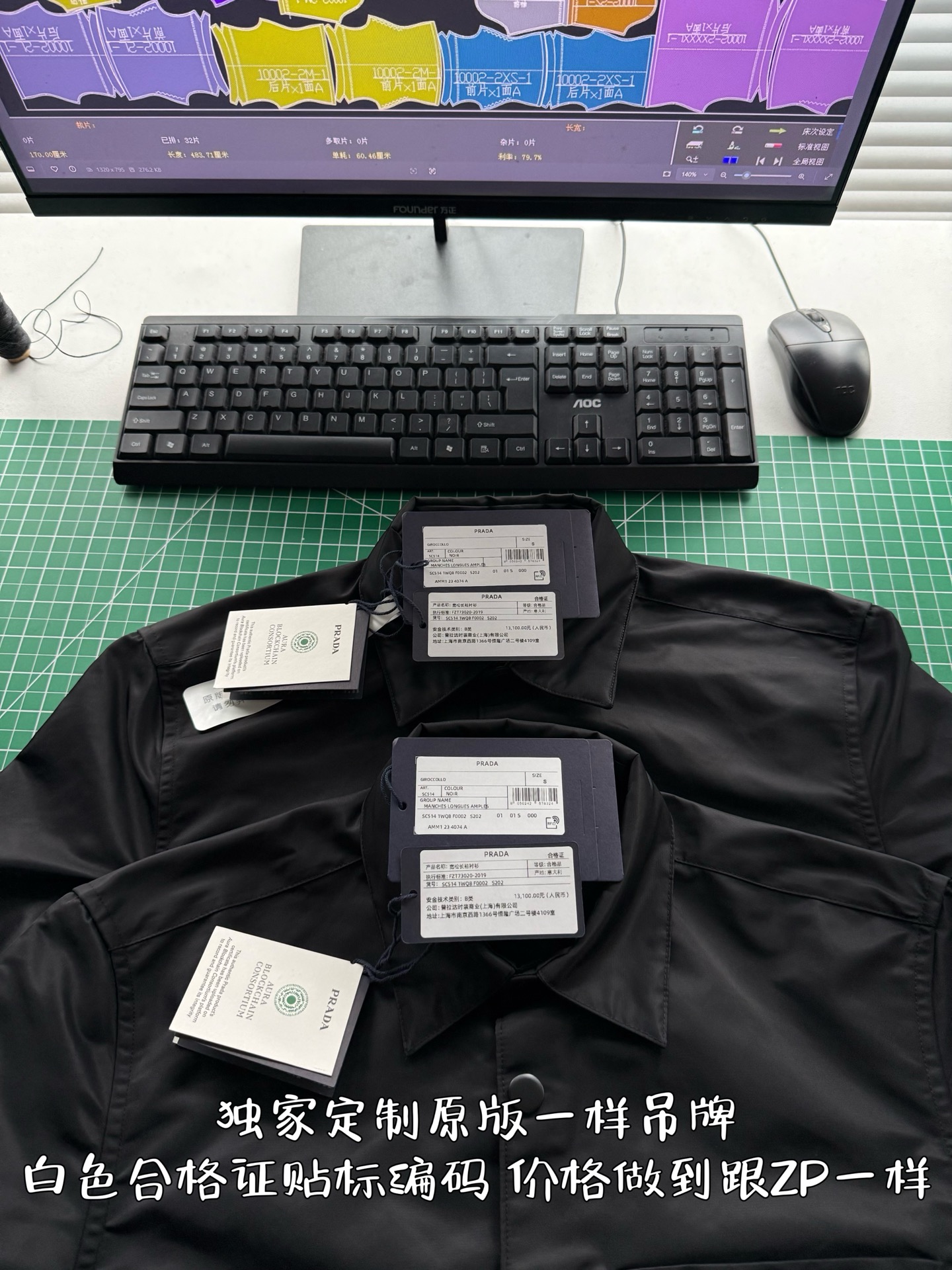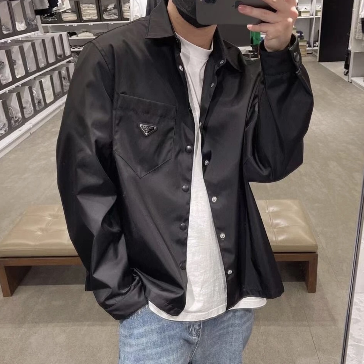 PRADA25FW三角标再生尼龙长袖衬衫‼️整件衣服13100购买ZP拆解打造,定制黑色再生尼龙面料,胸前贴袋设计,饰以三角标字母标识徽章,门襟 袖口开模定制纯色电镀五金纽扣,真正做到1:1copy 闭眼入 码数:S M L XL