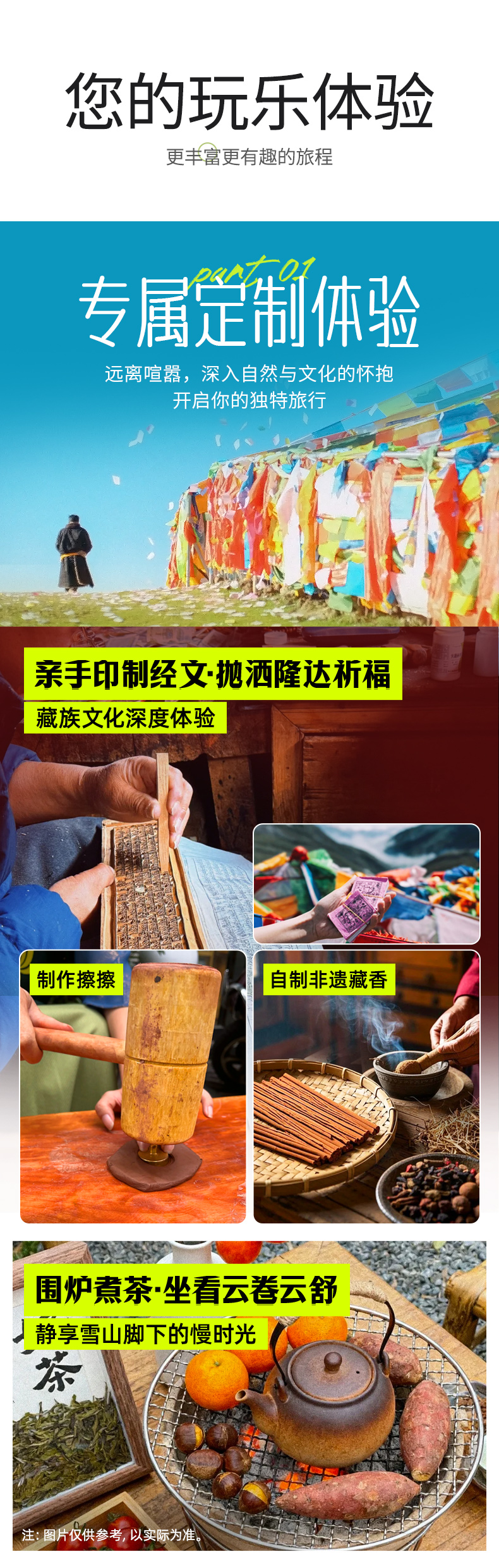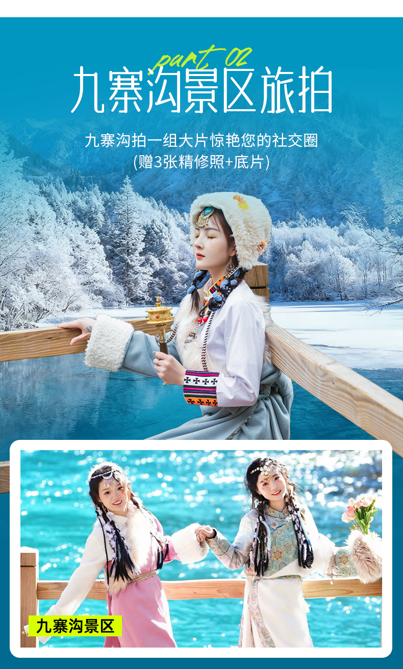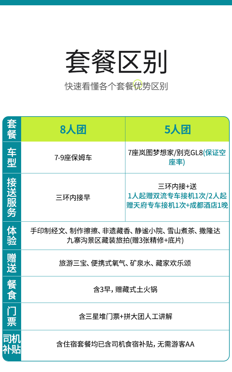 2-8人团:赠三环内上门接、便携氧气瓶1瓶/人、旅游三宝、 赠九寨沟景区藏装旅拍(赠3张精修照+底片;提供藏装/汉服使用,无头饰,无化妆)、矿泉水、藏家欢乐颂、手印制经文·制作擦擦·非遗藏香+静谧小院雪山煮茶+撒隆达祈福