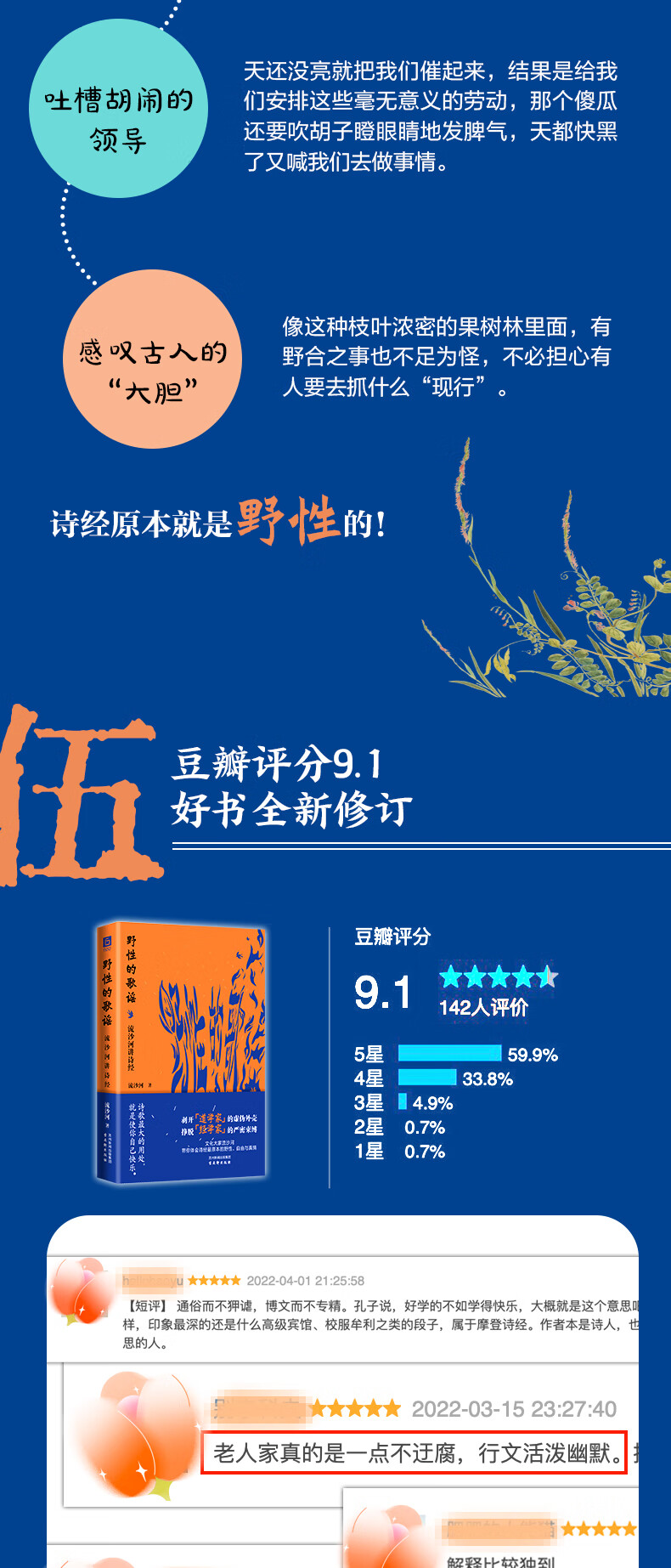 与市面上其他“注解”《诗经》的书不同,流沙河先生在书中的讲解非常注重当时的社会场景,注重诗歌的感情,语言非常生动活泼,幽默风趣,其中还有不少四川方言的使用,让人读起来非常轻松愉快。