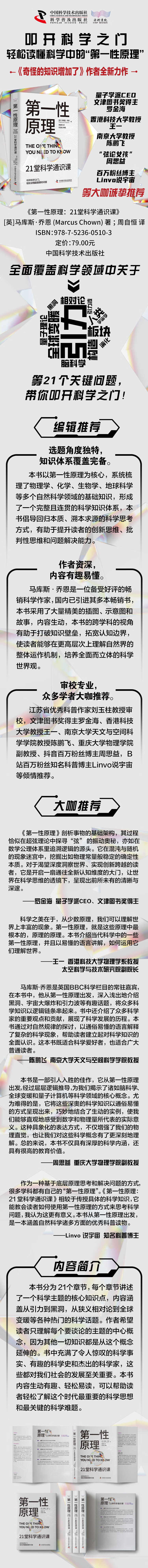 1.选题角度独特,知识体系覆盖完备。本书以第一性原理为核心,系统梳理了物理学、化学、生物学、地球科学等多个自然科学领域的基础知识,形成了一个完整且连贯的科学知识体系,本书倡导回归本质、溯本求源的科学思考方式,有助于提升读者的创新思维、批判性思维和问题解决能力。