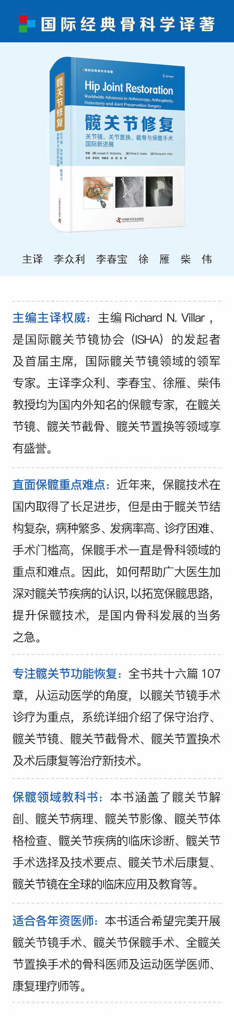 本书分十六篇,通过与正常生长发育对比的髋关节病理学帮助读者理解相关内容。前面的部分章节主要着重于区分关节外和关节内髋关节疼痛的病因。其中,CT、MRI 和超声等数字成像技术极大提高了我们对关节和关节周围软组织的诊断理解。
