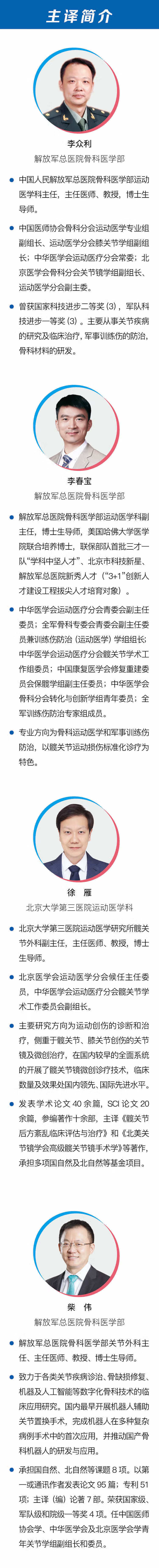 李众利,医学博士,主任医师,教授,博士生导师。中国人民解放军总医院骨科副主任、关节镜运动医学中心主任。中国医师协会骨科分会第一届委员,医师协会骨科分会运动医学专业组委员,SICOT中国部肩肘外科分会第一届副主任委员,中国研究型医院学会冲击波医学分会副主任委员,中国人民解放军骨科专业委员会关节镜与运动医学分会委员,中华医学会运动医疗分会上肢学组委员,北京医学会骨科分会关节镜学组副组长,北京医学会运动医学分会副主任委员,国家体育总局奥运医疗专家,ISAKOS会员。2006年获“军队科技进步一等奖”,2007年获“国家科技进步二等奖”。作为主要成员参与了军队、国家“863”重大专项课题的实验研究。先后在德国、美国、韩国等国的世界著名关节中心及运动医学中心进修,学习人工关节置换、关节镜的理论和手术技术。承担国家“十三五”重点专项“新型人工髋”分课题及军队课题“腔内冲击波治疗软骨损伤的研究”,军事医学创新课题“PRP修复军事训练伤致软骨缺损的实验研究”等。主要从事关节疾病的实验研究及临床治疗,特别是关节镜及骨科运动医学,肩、膝关节疾病,人工关节置换等。