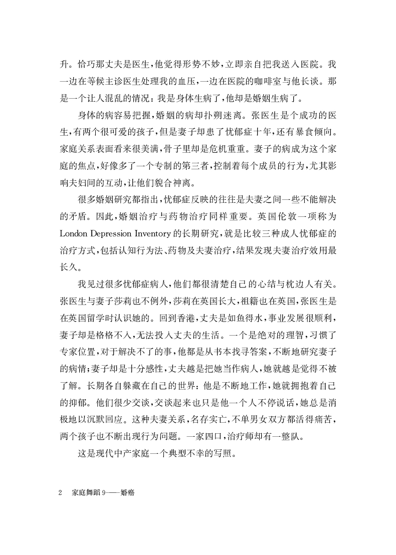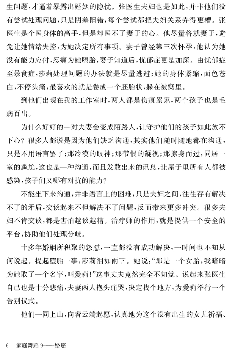 “家庭”是人际关系最初、最基础的单元,有的家庭是爱的港湾,为个体遮风避雨;有的家庭却成为无形之“塔”,限制个体自然成长,成为个体自由飞翔的羁绊。 作者李维榕用“家庭舞蹈”来比喻家庭成员间的互动关系,认为很多个体的心理问题,是由于家庭成员间的互动关系出了问题——彼此太近或太远,导致“家庭舞蹈”的“舞步”彼此纠缠、相互碰撞,进而导致个体出现心理问题;家庭治疗师如果能找到“家庭舞蹈”的纠缠结点,厘清家庭成员间的关系,让家庭实现和谐“共舞”,个体的心理问题将迎刃而解。 《家庭舞蹈》1-9系列,以时间为脉络,汇集了作者各个时期家庭治疗的真实案例,通过一篇篇独立的文章,向读者逐一展示、分析不同“问题个体”背后的家庭及其“家庭舞蹈”纠缠的方式……读者既是看官,走进别人的家庭,看别人的“家庭舞蹈”如何演绎,“舞步”如何纠缠;又是判官,在家庭治疗师的带领下,发现“家庭舞蹈”纠缠的结点、解决的方案,以及作者个人的思考——对该家庭治疗案例的个人思考,以及对家庭、对婚姻、对个人成长的思考;更是 “舞者”,反观自己乃至自己的家庭,一并“预防”或“治疗”存在于自己“家庭舞蹈”中的纠缠与碰撞,让自己家庭成员彼此和谐共舞,每一位个体享受美好人生。 《家庭舞蹈9:婚癌》中的家庭治疗案例侧重于婚姻本身遭遇严重危机的情况,具体包括“逃出抑郁”“婚姻的作业”“夹在三代中间的婚姻”“产后忧郁症之谜” “婚姻的面相”“老师的一课” “婆媳之争”“老人院四天”“最后的吉他”“化作千风”等。