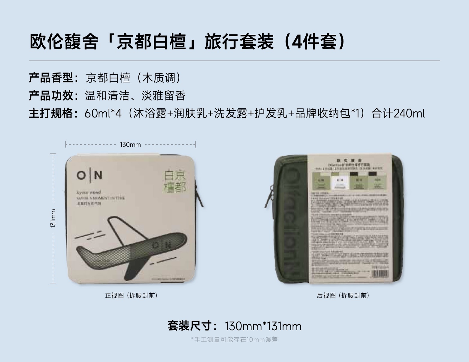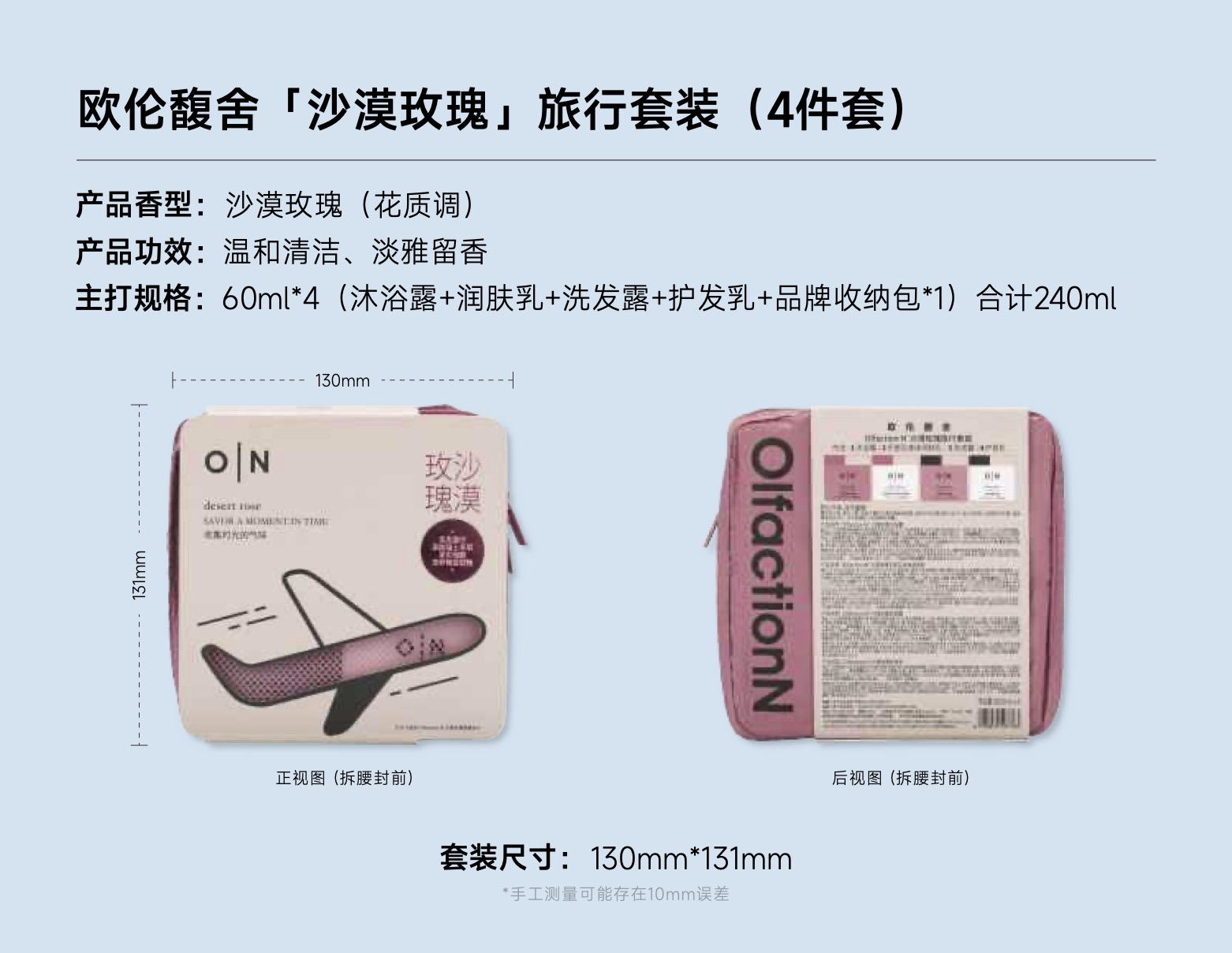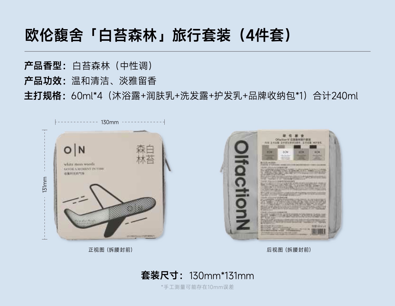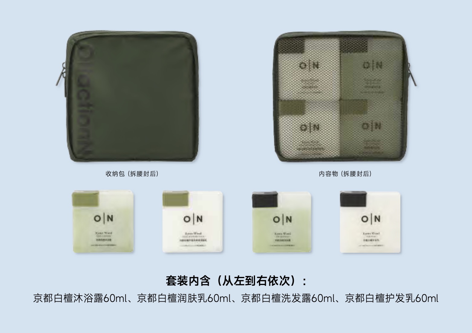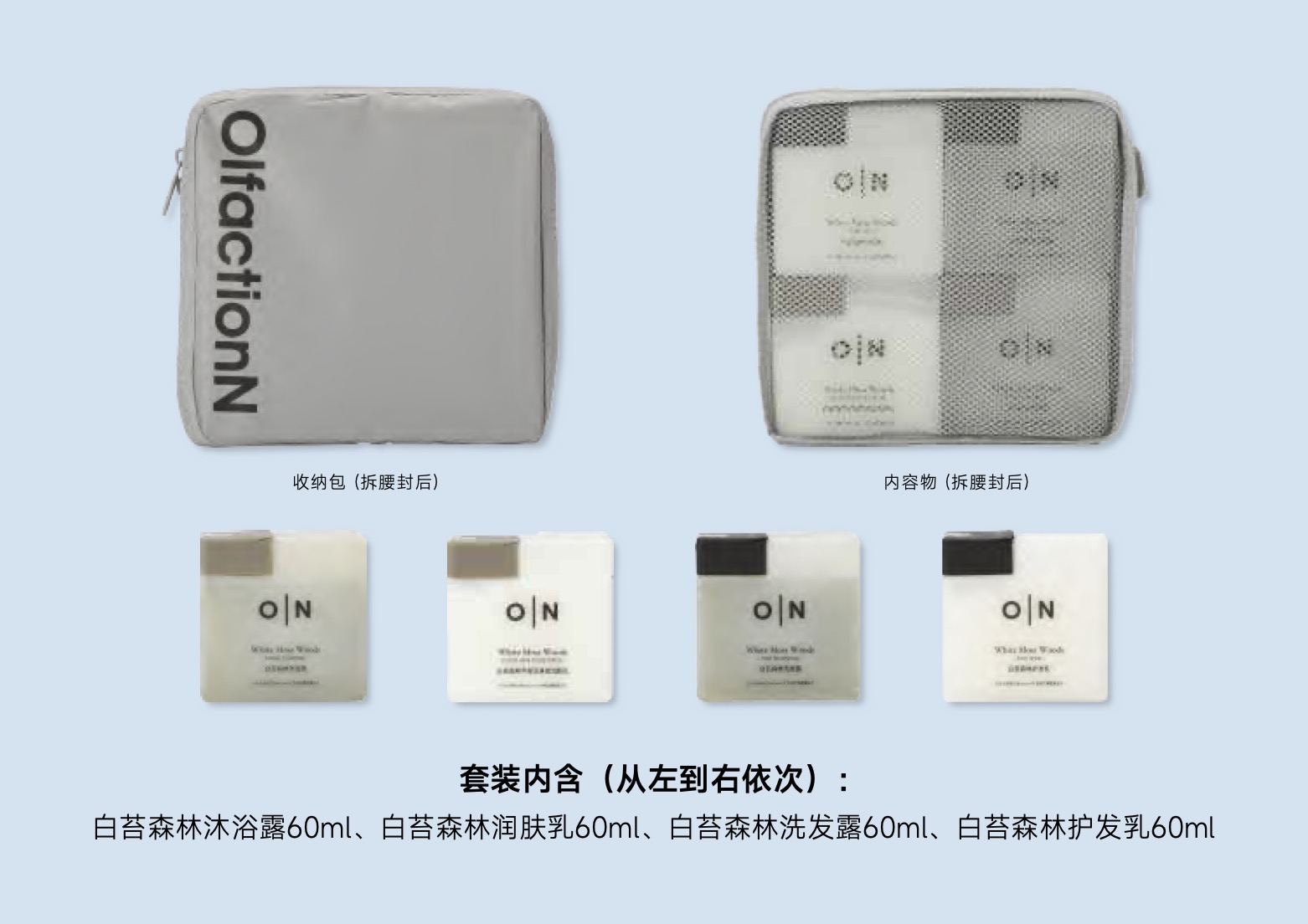 「特价品-效期2027年5月或12月」O|N 欧伦馥舍OlfactionN · 人气品 沐浴露旅行装240ml 内含:洗发水护发素沐浴露身体乳护手霜 五合一(持久留香)