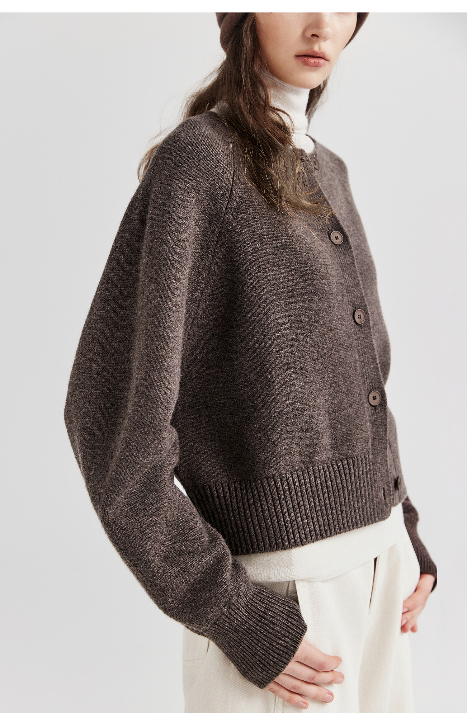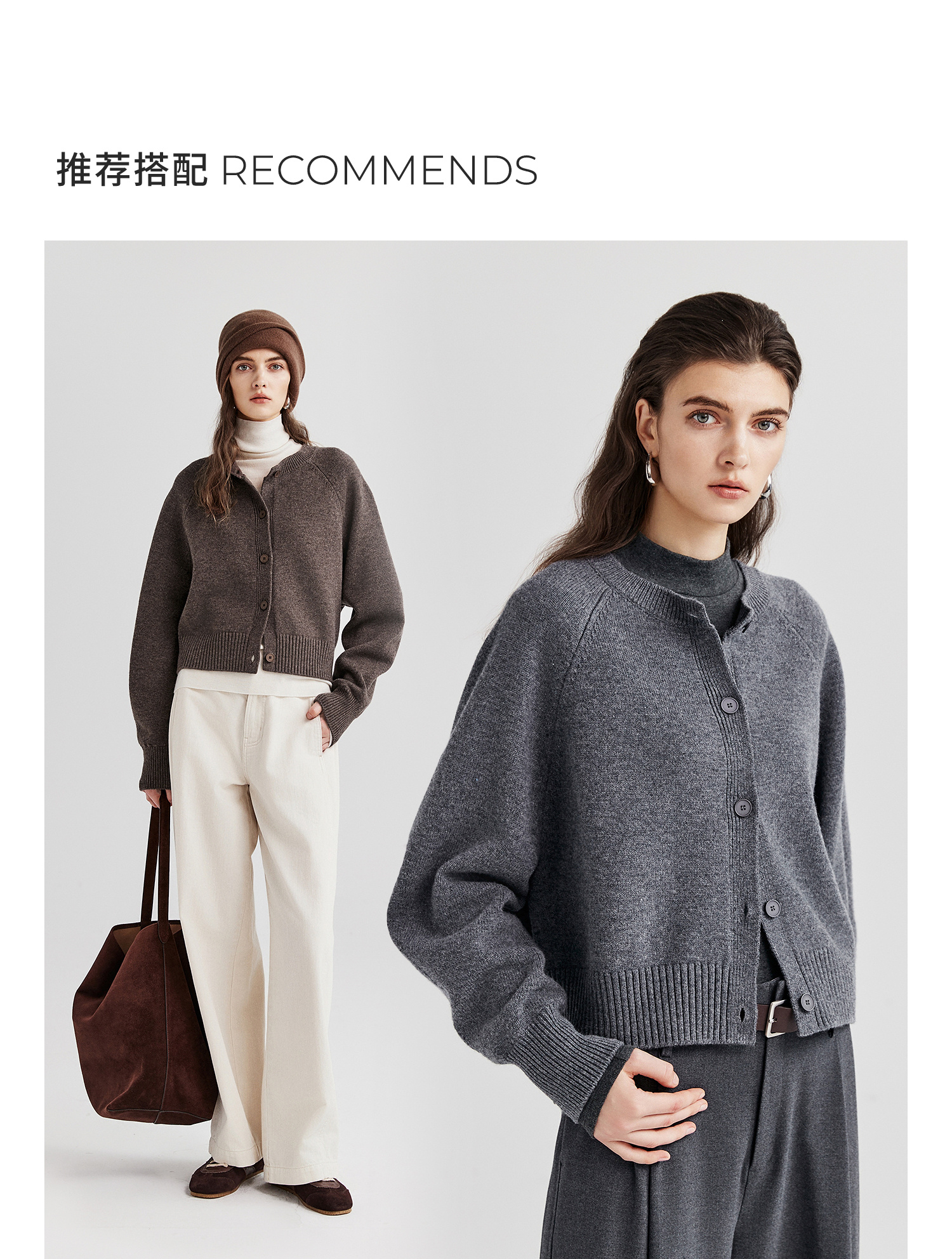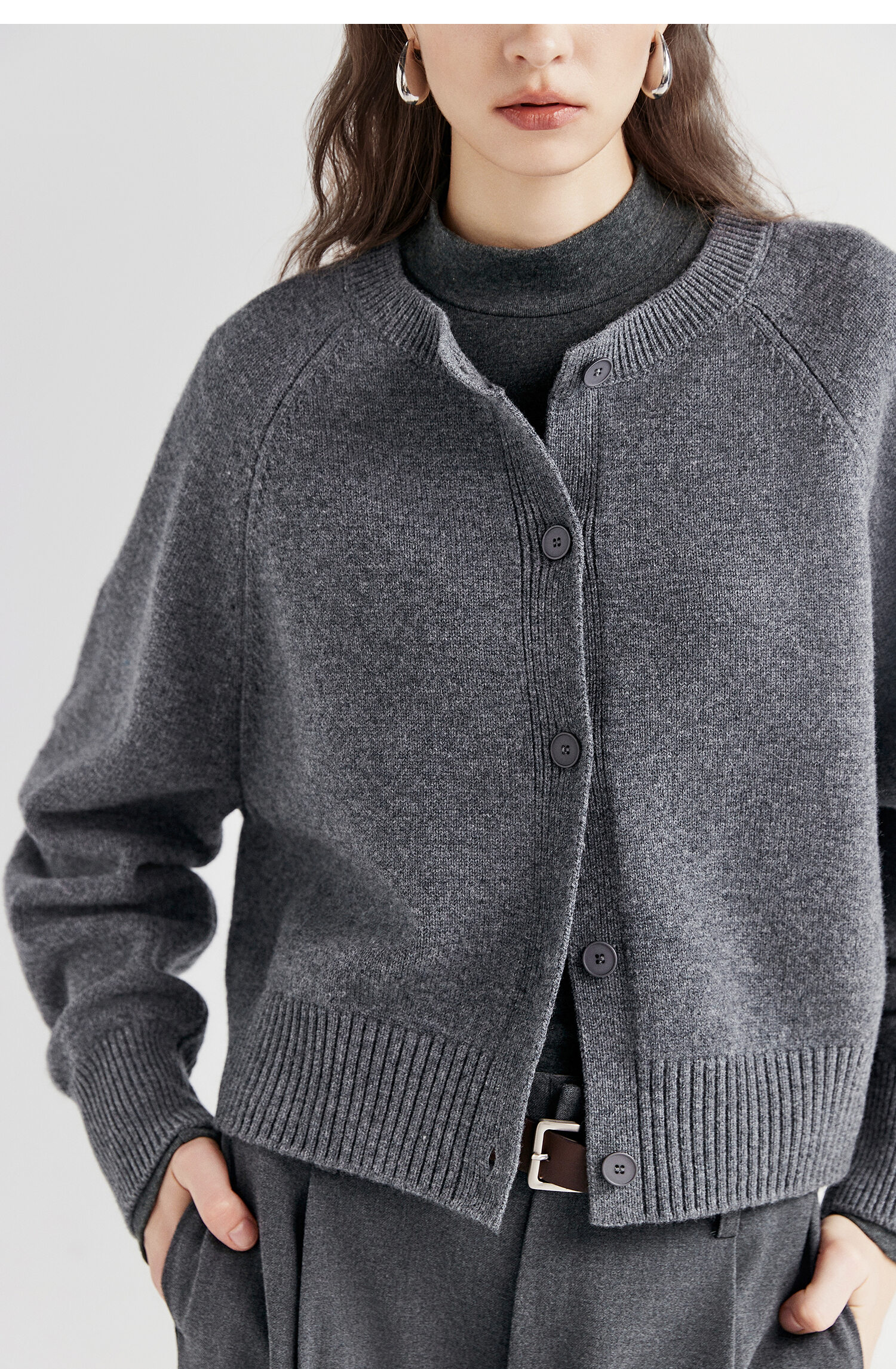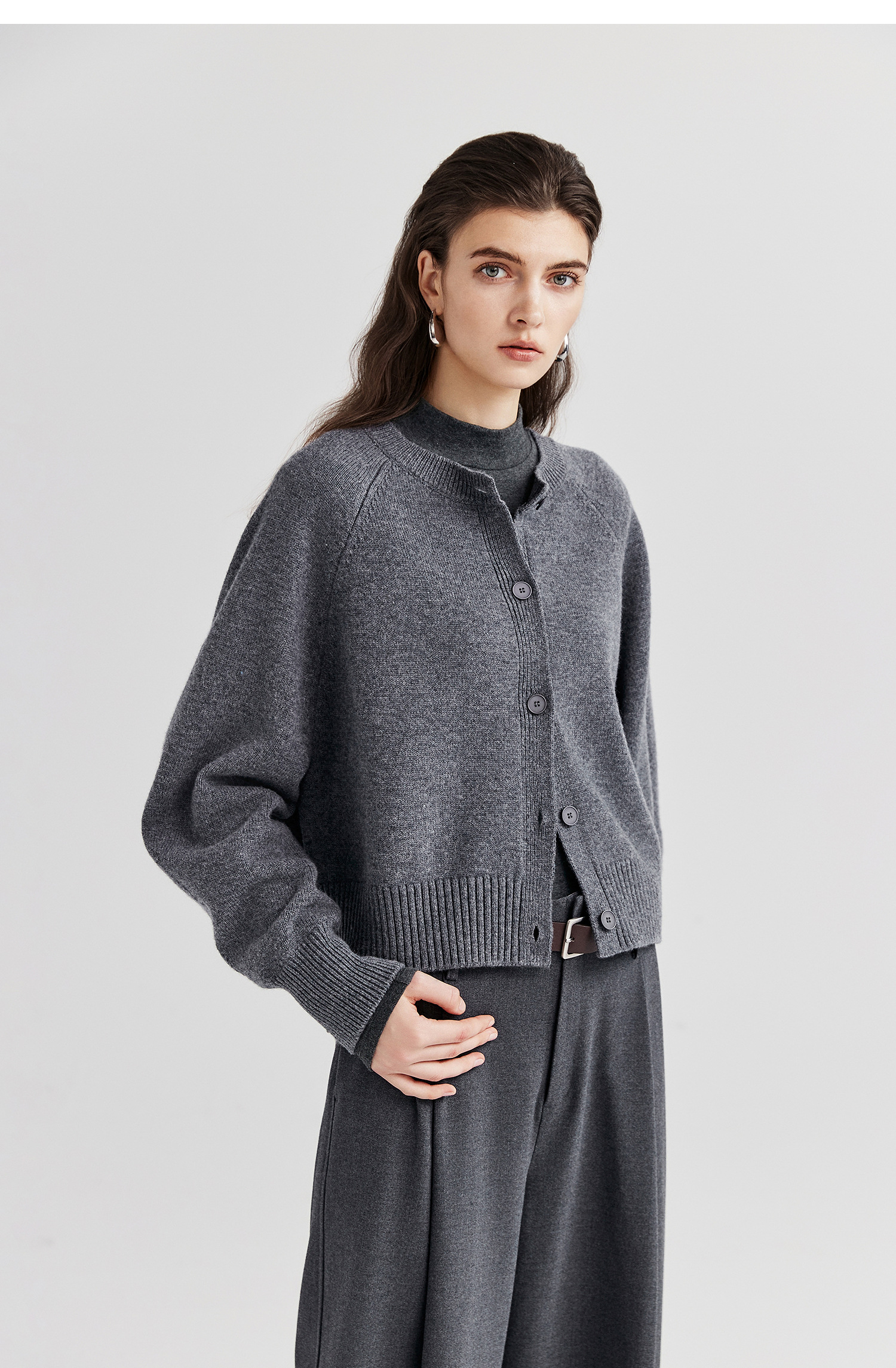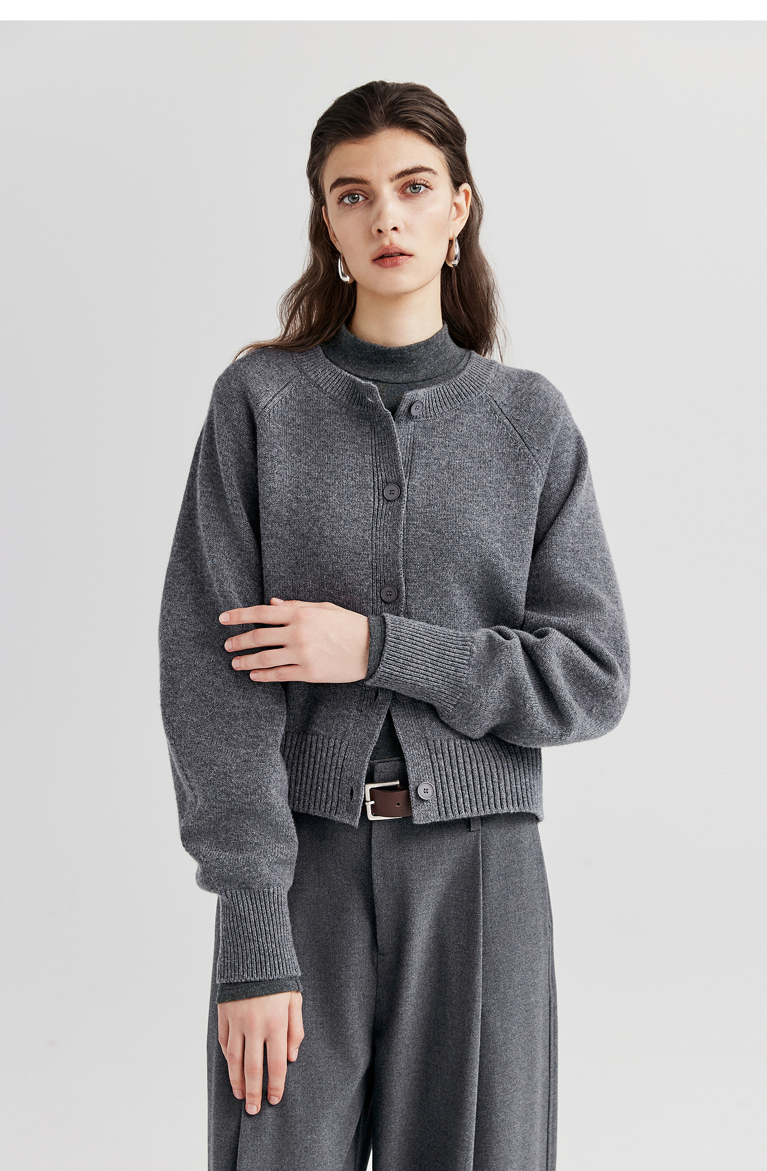 棉仓366605009-圆领短款全羊毛开衫毛衣女25秋冬厚款微宽松开衫外套针织上衣