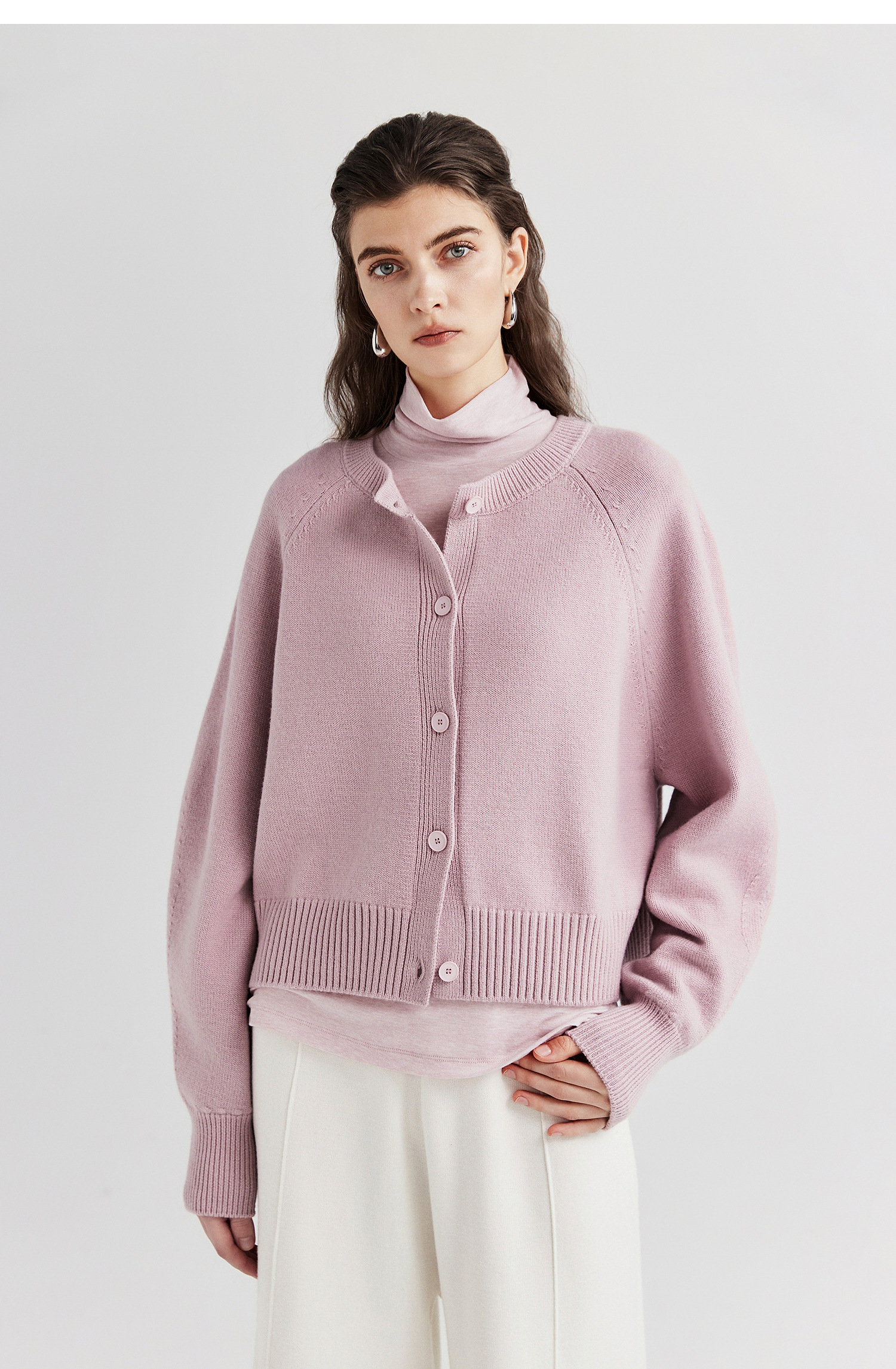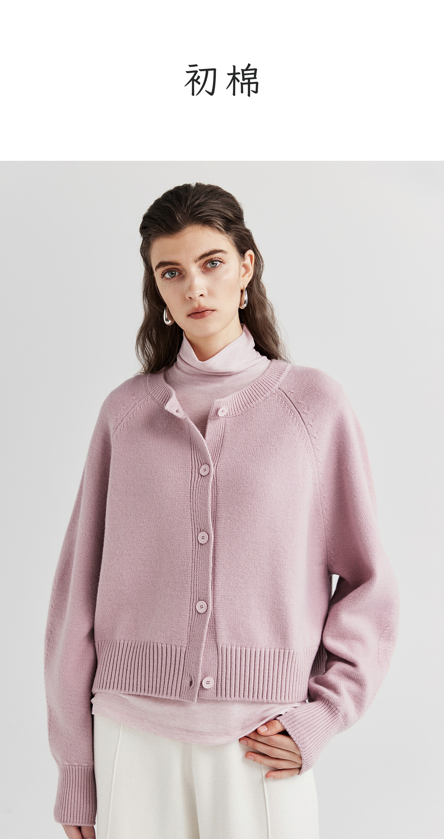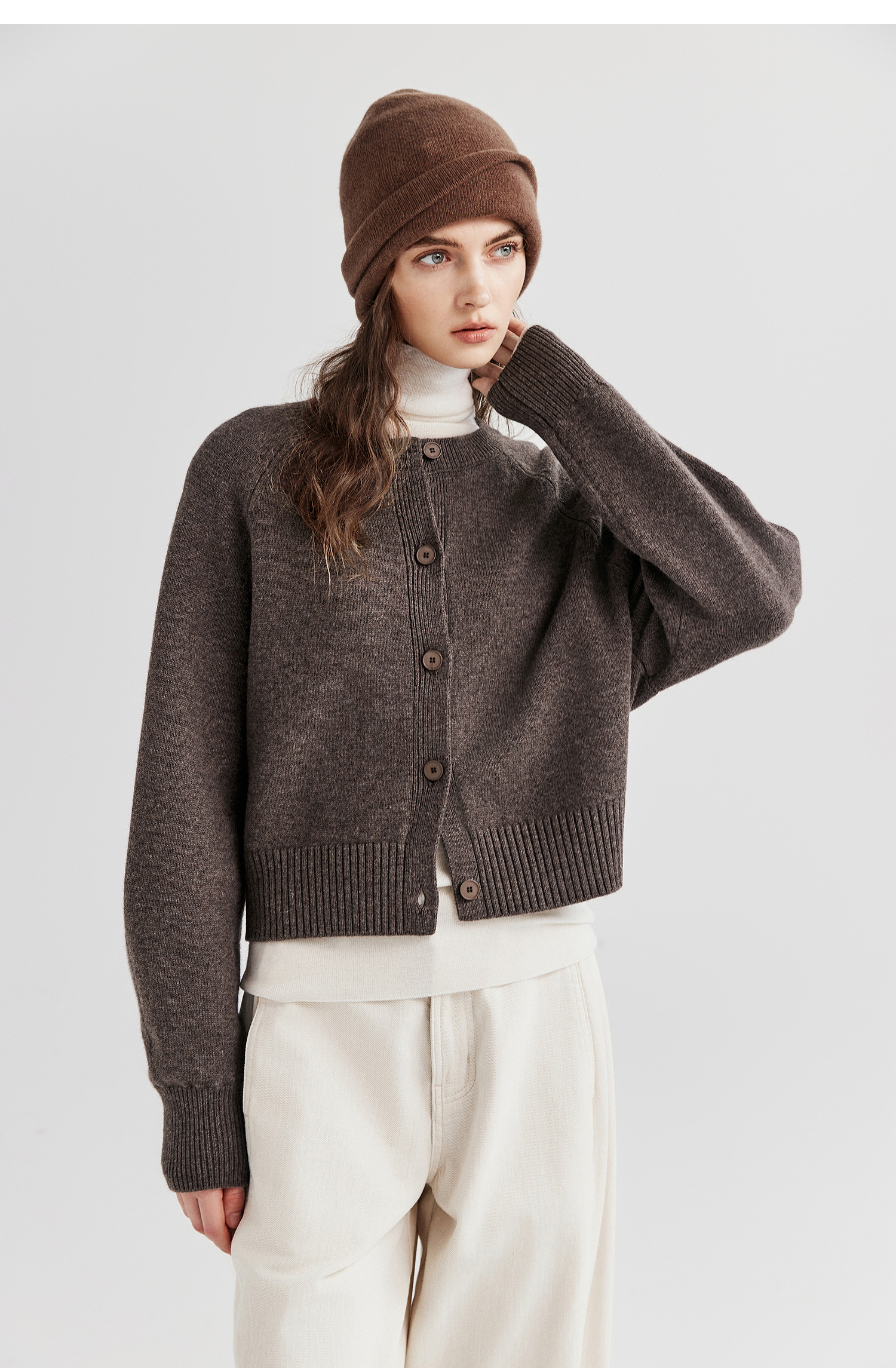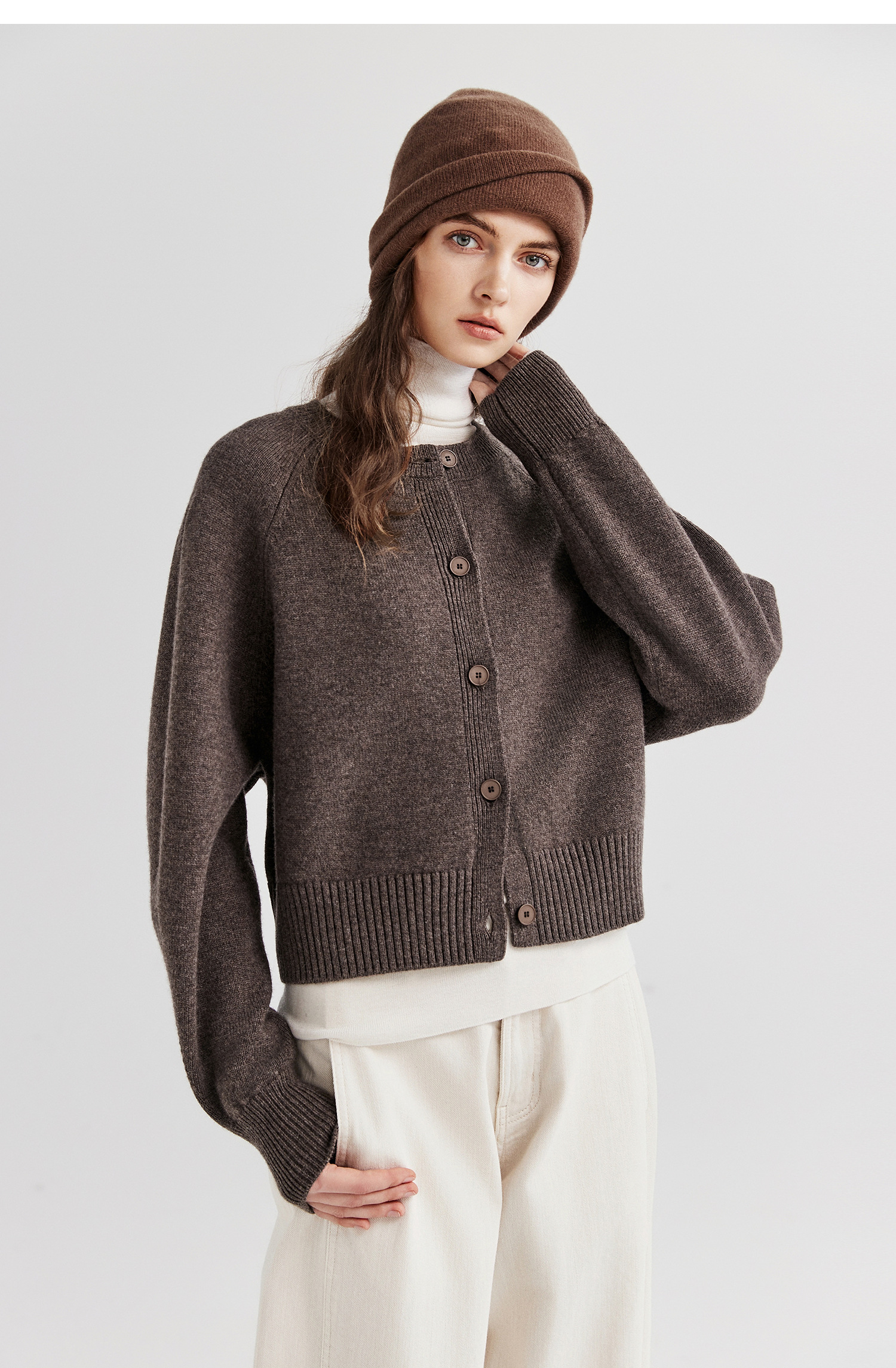 棉仓366605009-圆领短款全羊毛开衫毛衣女25秋冬厚款微宽松开衫外套针织上衣