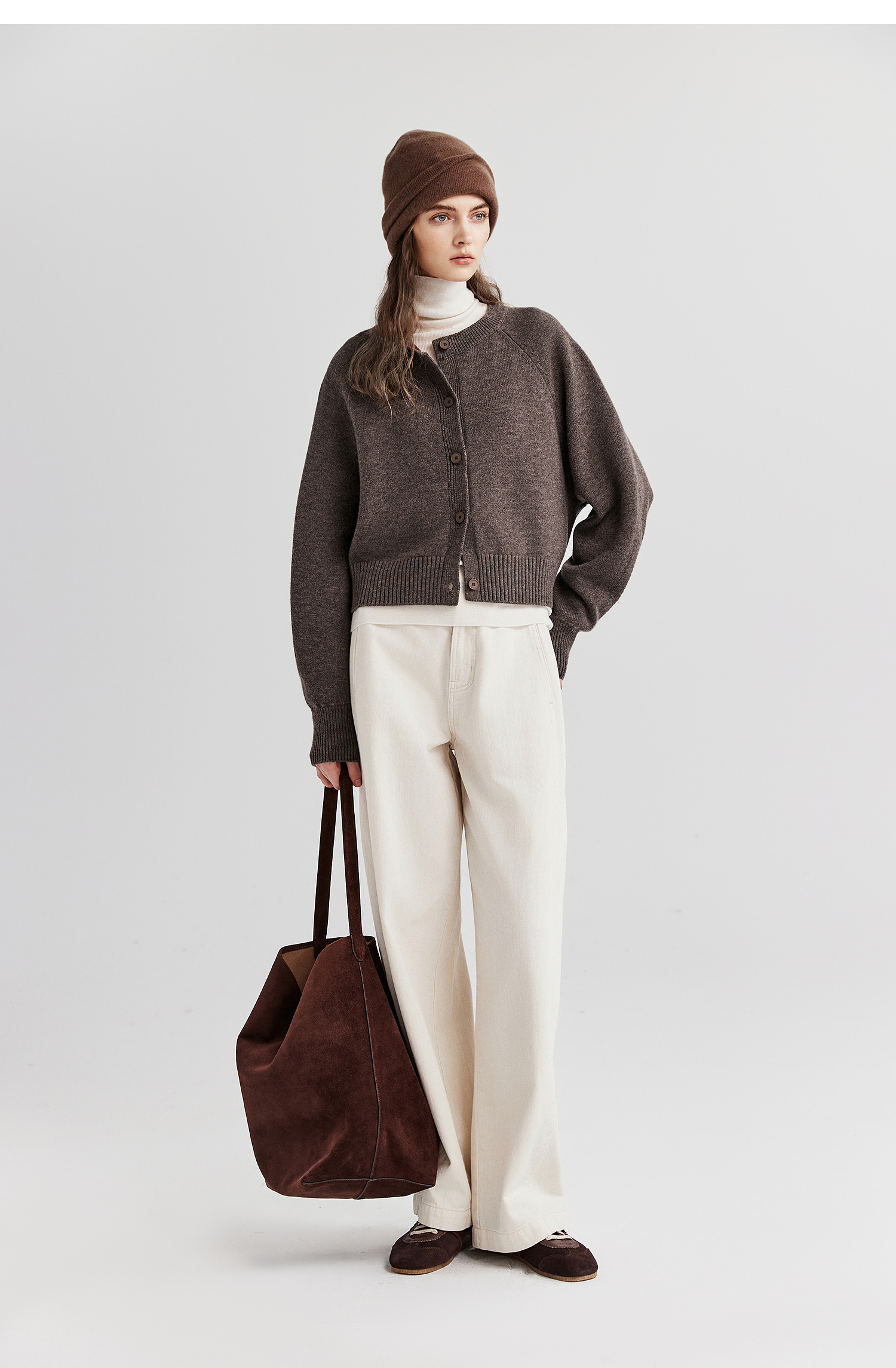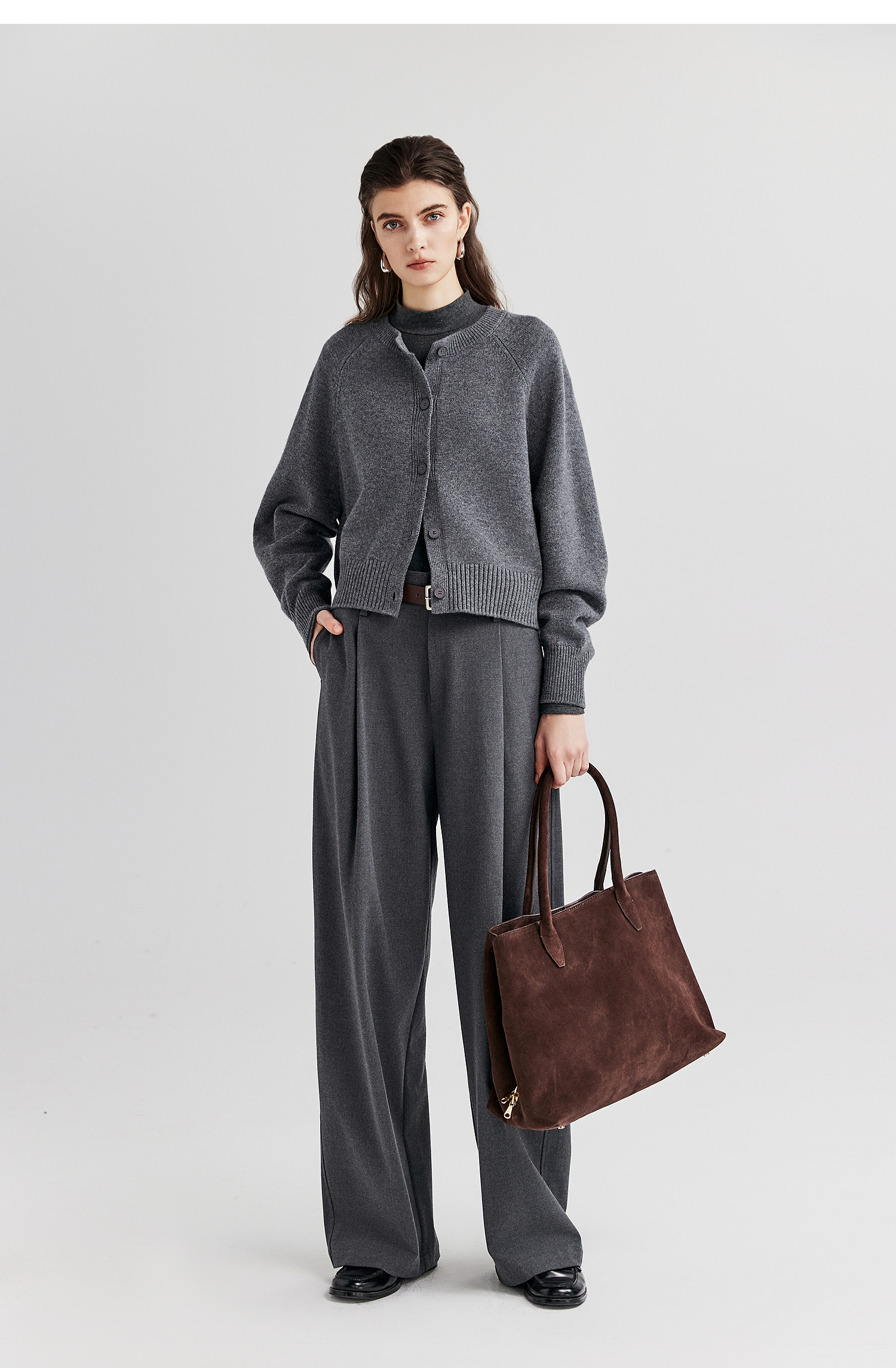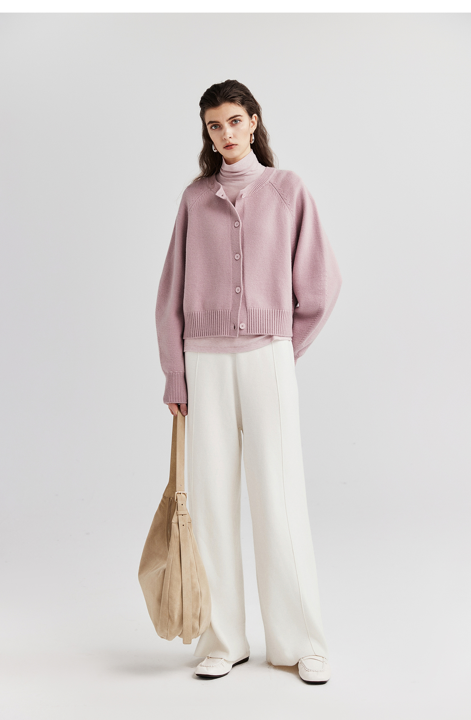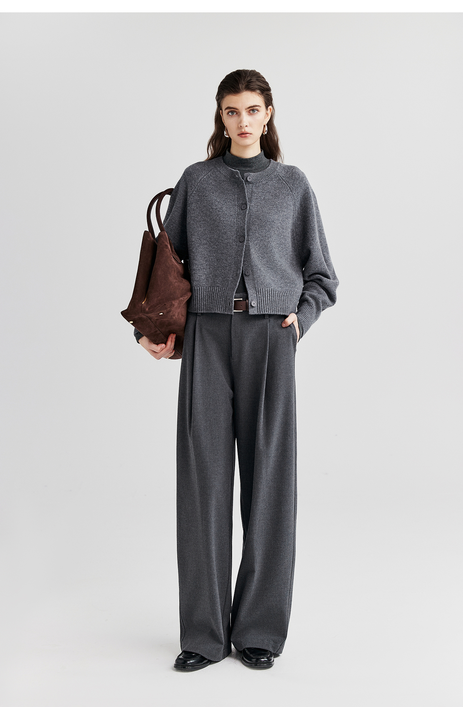 棉仓366605009-圆领短款全羊毛开衫毛衣女25秋冬厚款微宽松开衫外套针织上衣