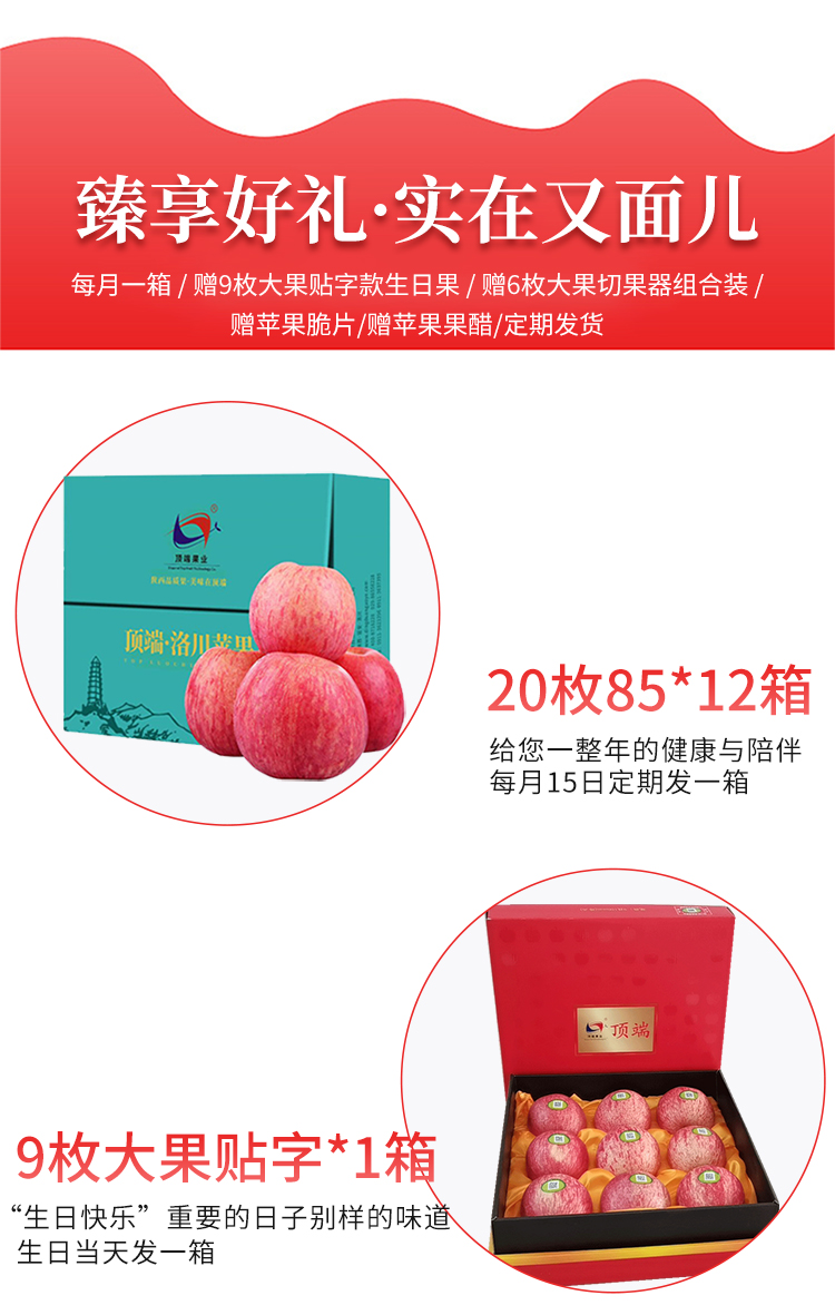 【年供款】 顶端果业正宗洛川红富士苹果20枚85mm大果蓝色手提礼盒全年供12箱 附赠品超实惠