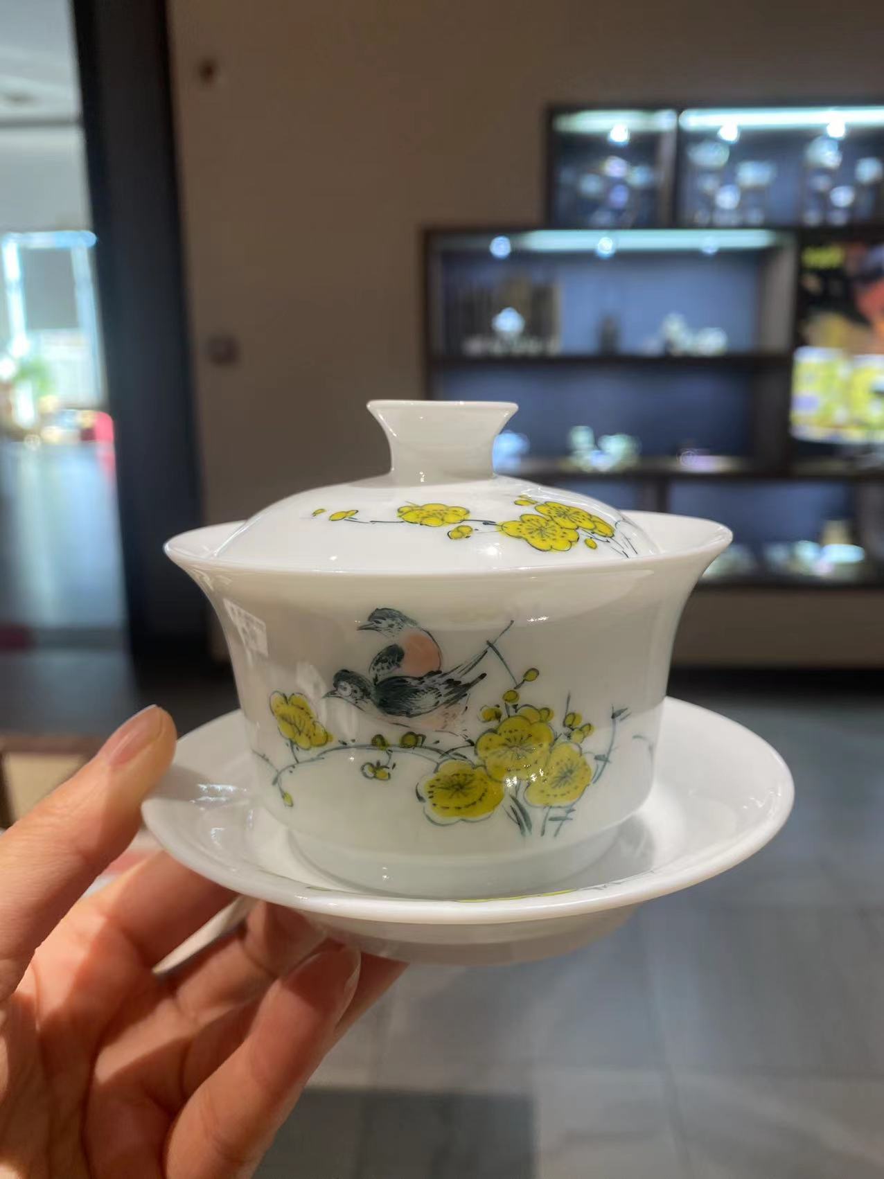 景德镇陶瓷 国瓷红叶 写意大盖碗竹子
