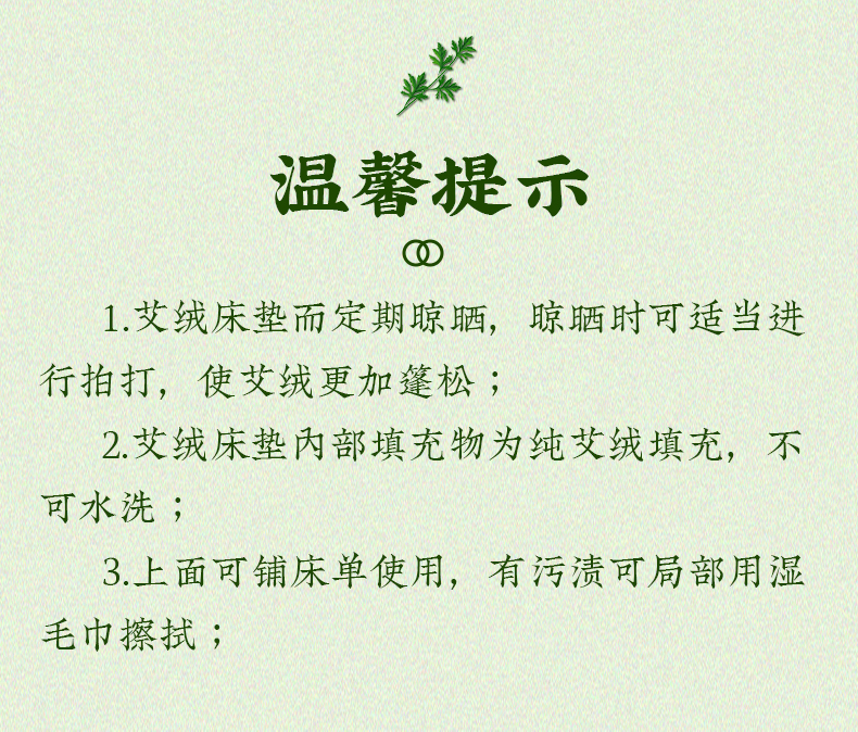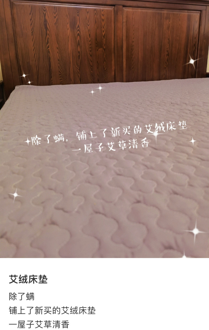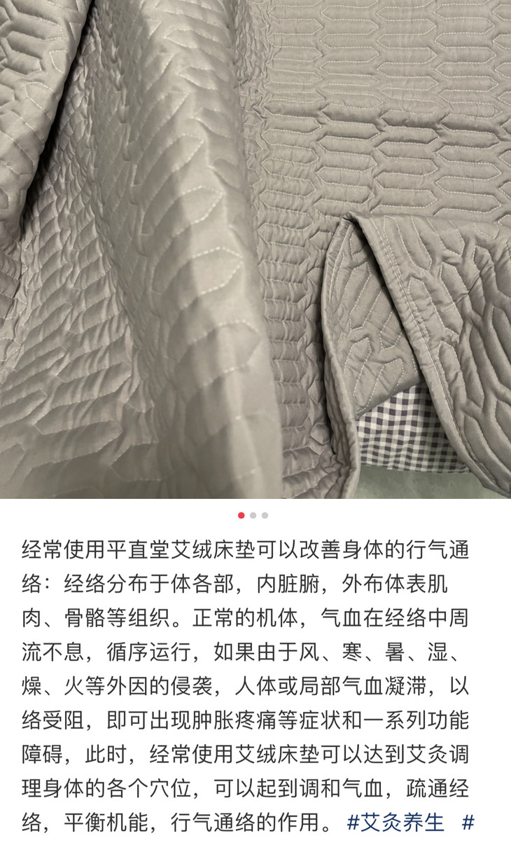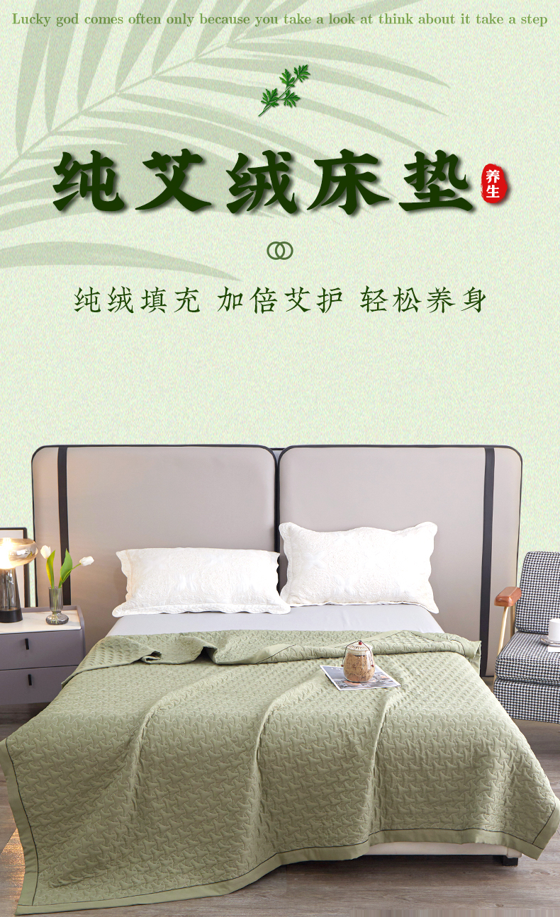 外层面料是植物羊绒棉,用了特殊的绗缝技术,所以不会跑绒,表面摸上去也细腻顺滑,微温不冰,很是透气,可以直接睡,也可以再铺上棉棉薄床单,这样更好清洁,因为床垫含艾绒,是不可水洗的,定期晒晒太阳,拍一拍就可以啦!现在限时赠送艾草养身枕2个,太划算!